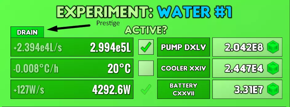 加热器: 加热器的机制与《点击英雄》中的维度完全相同。第一个加热器产生热量,第二个产生1级加热器,第三个产生2级加热器,以此类推。 隔热: 系统隔热的机制类似,但1级隔热提供静态加成,而非持续产出任何物品。2级隔热仍会产生1级隔热,以此类推。每个1级隔热都会减少系统随时间流失的总热量,但额外添加的每个隔热效果都比前一个弱。 计时器: 计时器的机制与隔热相同。第一个计时器会减少实验的“滴答”间隔时间。每次滴答会触发1级加热器产生热量,以及所有2级及以上的生成器生成低一级的生成器。声望系统:当你达到最大热量值(初始为100万)时,将解锁三种不同的【升级】。每次声望提升都会增加各项声望的升级成本,你所选择的那项成本增幅会略高一些,同时将下次需要声望提升前可达到的最大热量值乘以100倍。根据游戏后期玩家的观察,最佳策略是先分别对加热器、隔热装置和计时器各进行一次声望提升,之后将所有声望提升都投入到加热器上。 水实验:水实验同样是一个放置类玩法。