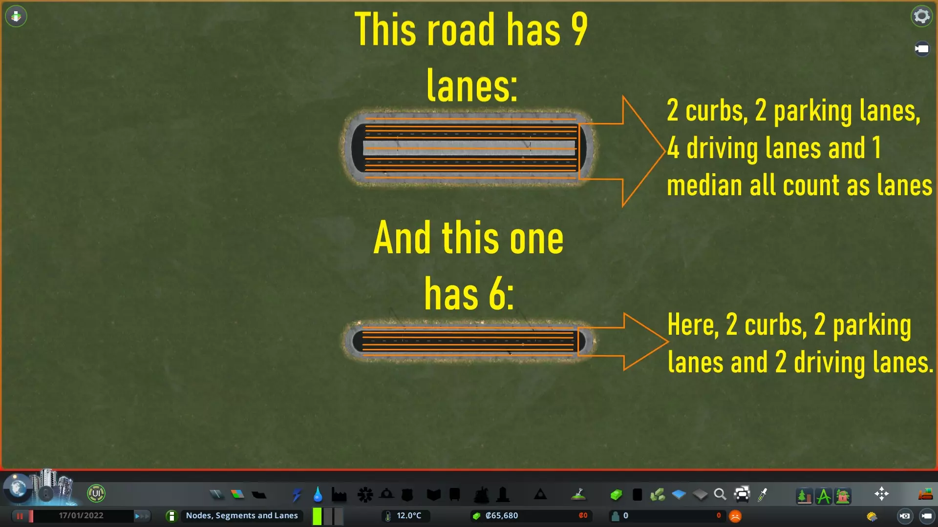 路径、运河、码头、公路和铁路也包含(多条)车道。以下是【基础版双车道公路】和【四车道公路】的车道示例。如你所见,它们实际包含的车道数量比你想象的要多得多。