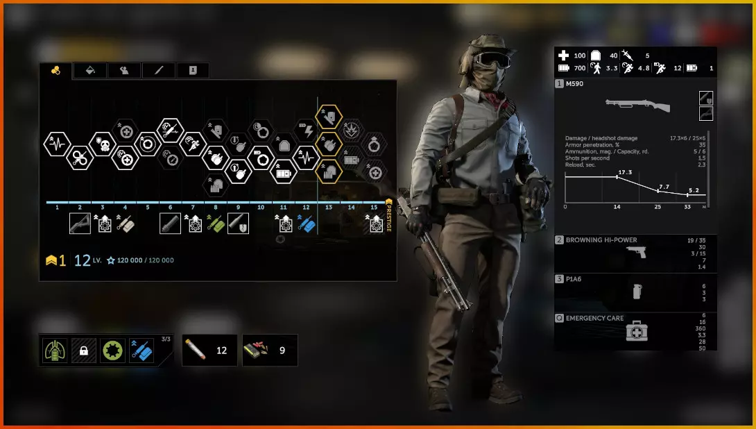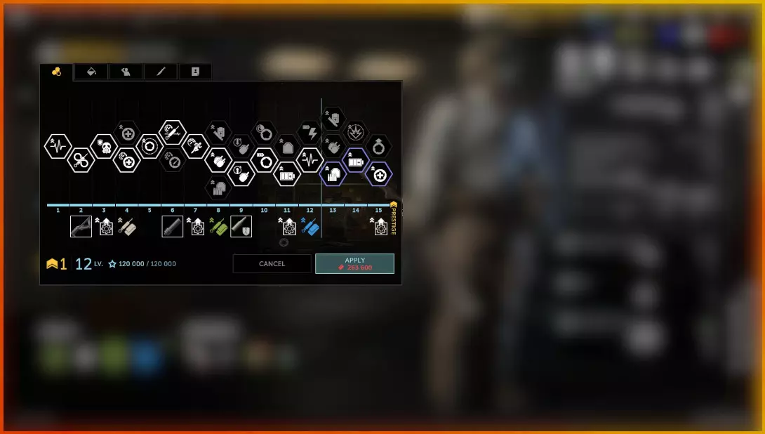 上图中的角色是米科拉伊,他是之前提到的波兰GROM组合中的干员。我已将该干员晋升过一次,目前等级为12级。 升级干员时,只有使用该干员进行游戏才能获得经验,同时还会获得额外经验。当干员获得足够经验后,其技能树会像上图那样呈黄色高亮显示。只有当前等级可解锁的技能才会呈黄色高亮。 点击黄色高亮图标会选择该特定技能路径,图标会变为紫色边框,并在窗口右下角显示所需花费。