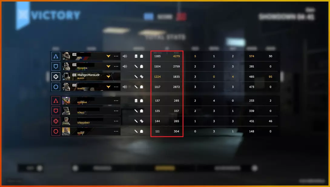 那么,还有其他赚取【 Credits(游戏内货币)】的方法吗?这很大程度上与你获得的经验值有关。 首先,战斗经验值会显示在比赛结束界面上,其数值与你的实际总经验值不同。你获得的经验值分为战斗经验值和额外经验值。这里有一个我在【 Showdown Mode(对决模式)】中使用【 Operator Buggy(操作员越野车)】进行比赛的例子。为保护隐私,其他玩家的名字已做模糊处理。