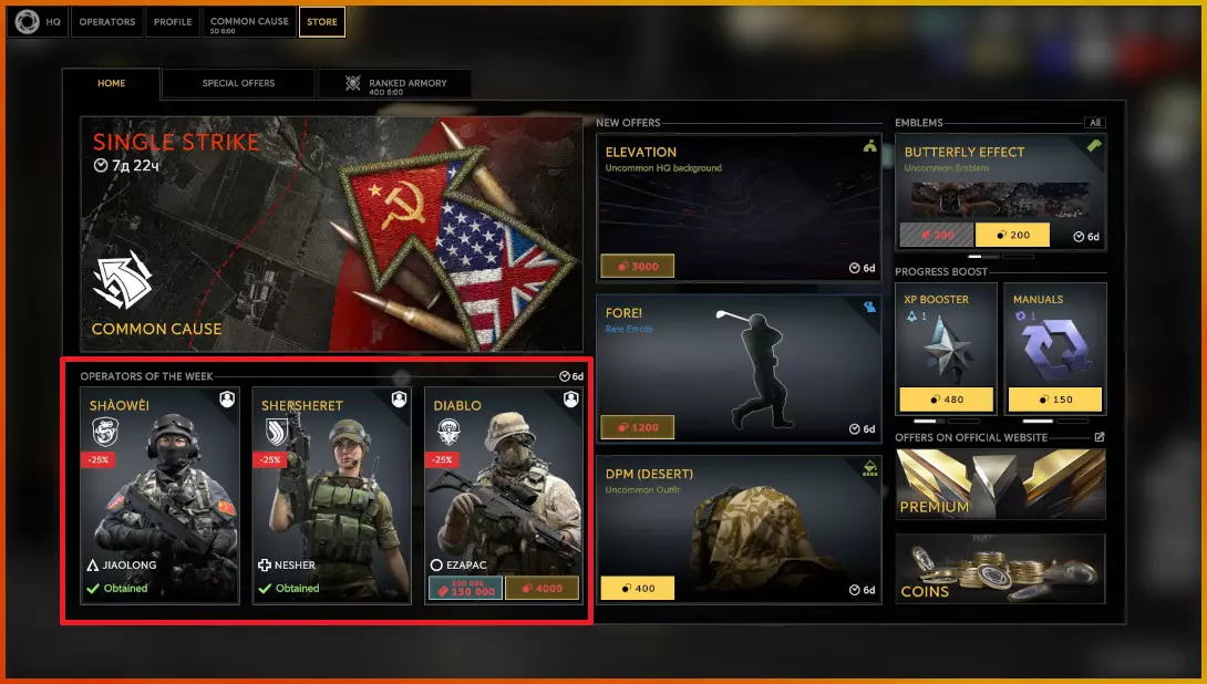 那个蓝色的小数字表示你可以使用的【信用点】数量,黄色数字则表示你可以使用的【硬币】数量。硬币与信用点不同,硬币可以用真实货币购买,也会偶尔免费发放,可用于购买信用点、外观物品、高级内容或为干员额外花费经验值。 我们不会深入讨论硬币,但由于它们是信用点的来源之一,之后会偶尔提及。 信用点主要有两大用途,还有一些次要用途。两大主要用途是: 购买新干员。 提升已有干员等级。 次要用途包括刷新每日任务或购买普通迷彩等。如上所述,【游戏货币】用于购买【干员】。干员的价格各不相同,部分干员无法用【游戏货币】购买。无法购买的干员来自最新的【干员收藏】,该收藏在下次【干员收藏】发布前仅限通过【战斗通行证】获取。干员的价格在100,000-200,000【游戏货币】之间。 初次开始游戏并获得免费干员时,你所选择的干员所属的【干员收藏】中的其他干员价格将会降低。例如,如果你选择来自波兰【干员收藏】GROM的角色Koszmar,那么Mikolaj、Sztylet和Prorok这三个角色的价格将会降低。 旧【干员收藏】中的干员价格降低至150,000【游戏货币】,新【干员收藏】中的干员则为标准价格200,000【游戏货币】。不过有个好消息是,你可以在游戏内商店以优惠价格购买新干员。每周商店会有三名干员打折出售,所有玩家看到的打折干员和折扣力度都是相同的。以下是相关示例: