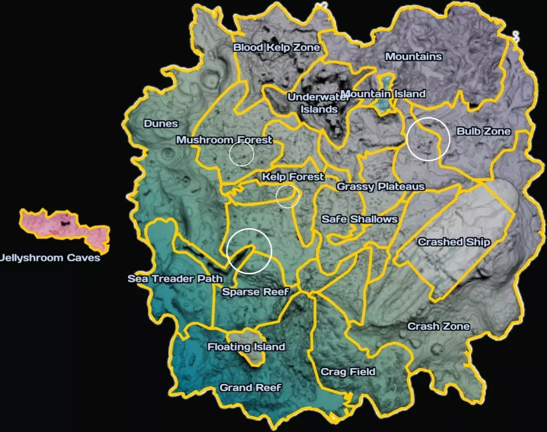 (我给安全浅滩上色的原因是,在那里驾驶独眼巨人号几乎寸步难行) 所以我们需要判断哪一半区域有更有趣且有用的东西。 第二部分:哪个区域更好? 这两个区域大小差不多。我们先来看实用性内容。 失落之河的入口分布比较平均。不过,在我看来(这是我的指南,所以仅代表个人观点)最好的入口,也就是血藻 trench,位于世界的南侧。南侧还有美丽的大堡礁、壮观的浮岛,以及资源丰富的稀疏礁区(那里有大量的铅、石英、锂和红宝石)。不过公平地说,北侧确实有山脉岛及其所有的外星科技,还有富含铜和锂的蘑菇森林。说到景点,有灯泡区和水下岛屿。你或许应该自己决定哪个更合心意,但我个人经常去血藻 trench,所以在我看来南边更胜一筹。(对感兴趣的人说一下,两边都有通往水母洞的入口。) 第三部分:黄金地点 既然你已经了解了两边能找到什么,接下来让我介绍一些我认为非常特别且很棒的地点。它们用我画的这些超级专业的白色圆圈做了标记。
