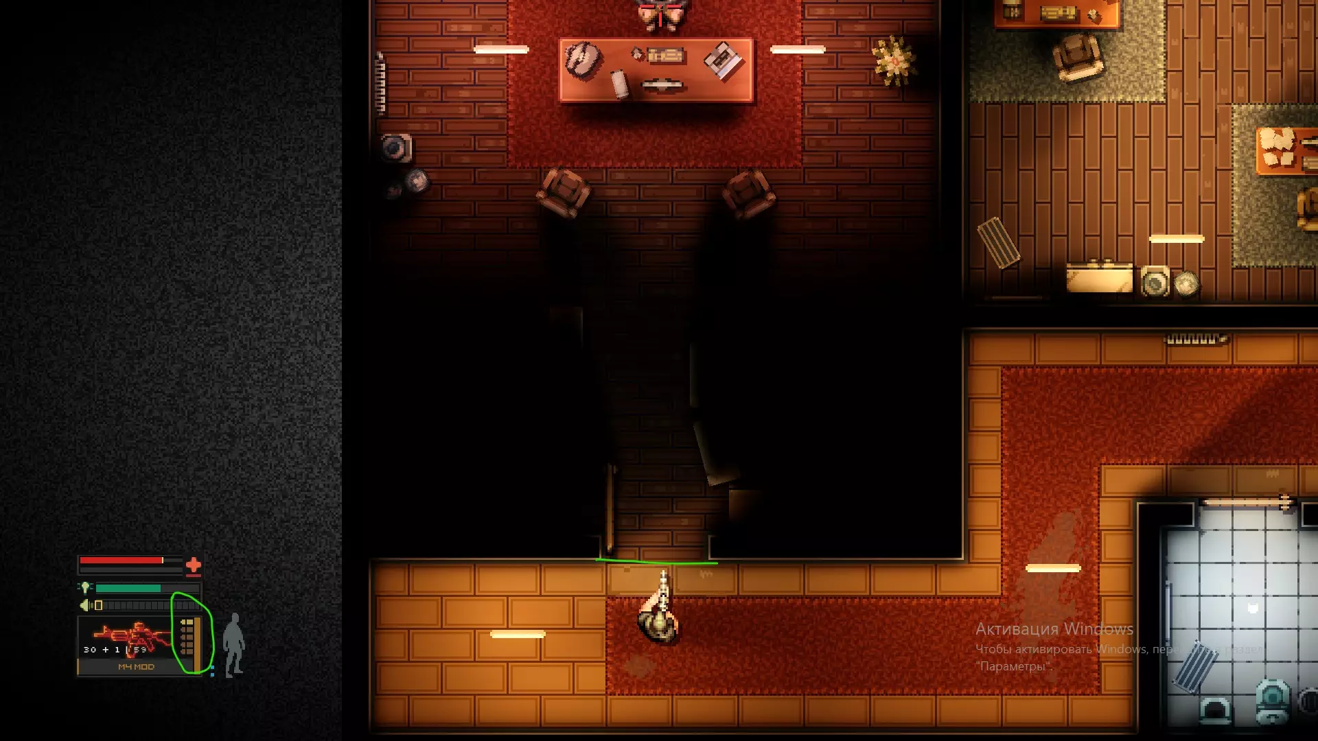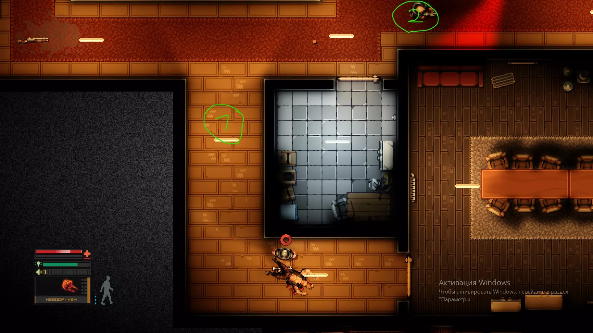 第六步 武器卸下后向下走,到达房间,将步枪放在地上以免意外走火,被摄像头拍到,站到1号或2号位置,消灭房间里坐着的两名保安。