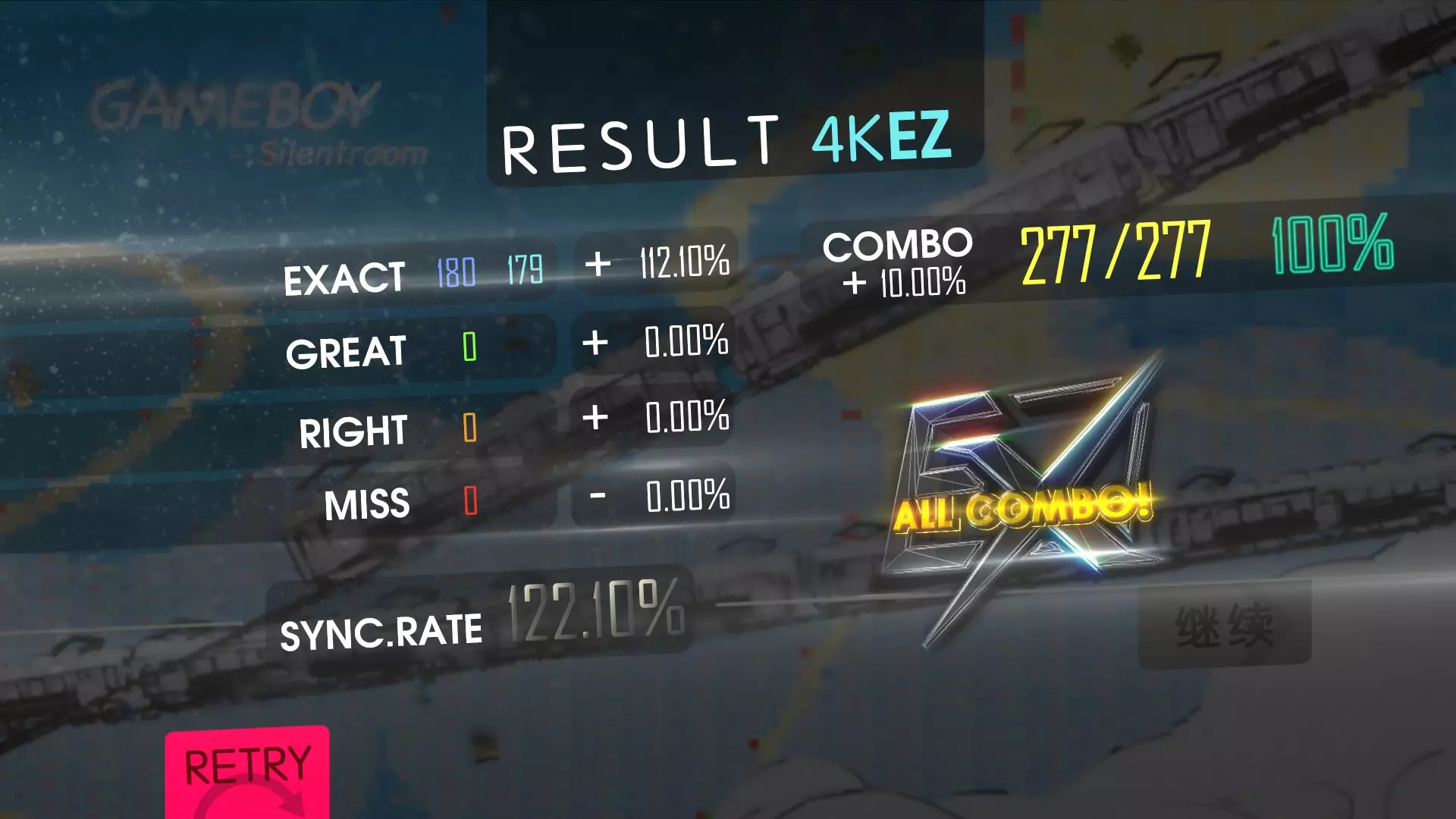 《MUSYNX》中获取Audio Player成就所需122%同步率的策略 评分系统 同步率即单首歌曲的得分。要达成此成就,你需要达到122%的同步率。 得分最高的判定为EXACT,但根据你的时机,EXACT会显示为蓝色或青色。关键在于,青色EXACT比蓝色EXACT能获得更高的百分比分数。因此,要获得此成就,你几乎需要一直看到颜色更浅的文字(青色EXACT)。 选择歌曲 与所有成就一样,你可以使用基础游戏自带的歌曲来达成此成就,无需任何DLC。 我选择了《Gameboy》,这是一首节奏强烈的短歌曲。其4K简单难度谱面仅有180个音符。