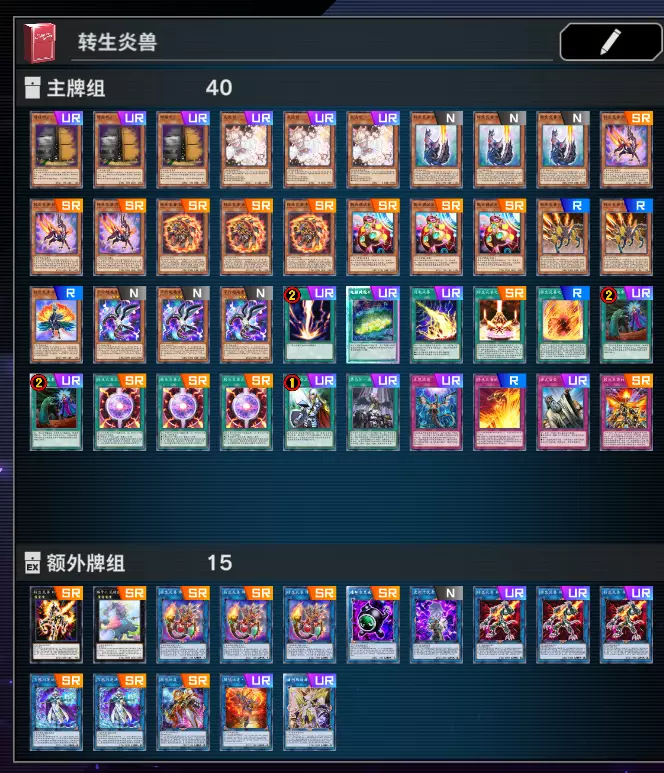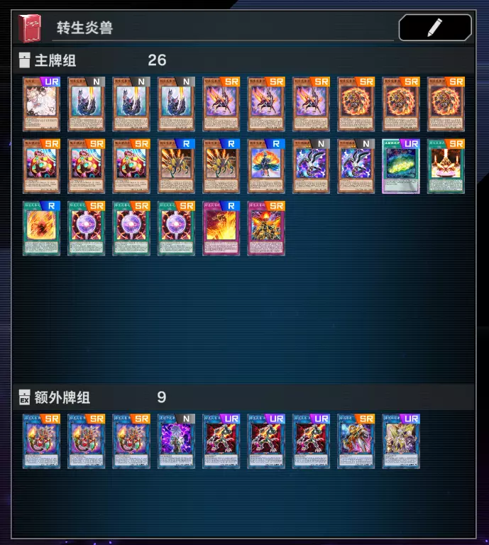 这是卡组的主要部分,单卡介绍与连招因为过长,可以参考其他攻略,在此不详细写出。只提供一个简单思路,通过瓢虫/炎阵/挖矿尽快找羚羊,羚羊堆陷阱,转生狼回收。都没有靠系统外红坑+墓地的猞猁保住狼。资源调度起来后,日光狼每回合回收愤怒可以炸2。 主卡组x23 灰流丽x1 转生炎兽 狐曦(狐狸)x3 转生炎兽 羚羊x3 转生炎兽 刺尾蜥x3 瓢虫调试员x3 转生炎兽 J美洲豹x2 转生炎兽 孔雀x1 电脑网挖矿x1 转生炎兽之圣域x1 转生炎兽之意志x1 转生炎兽之炎阵x3 转生炎兽的愤怒x1 转生炎兽的咆哮x1 额外卡组x6 转生炎兽 烽火猞猁x3 转生炎兽 日光狼x3