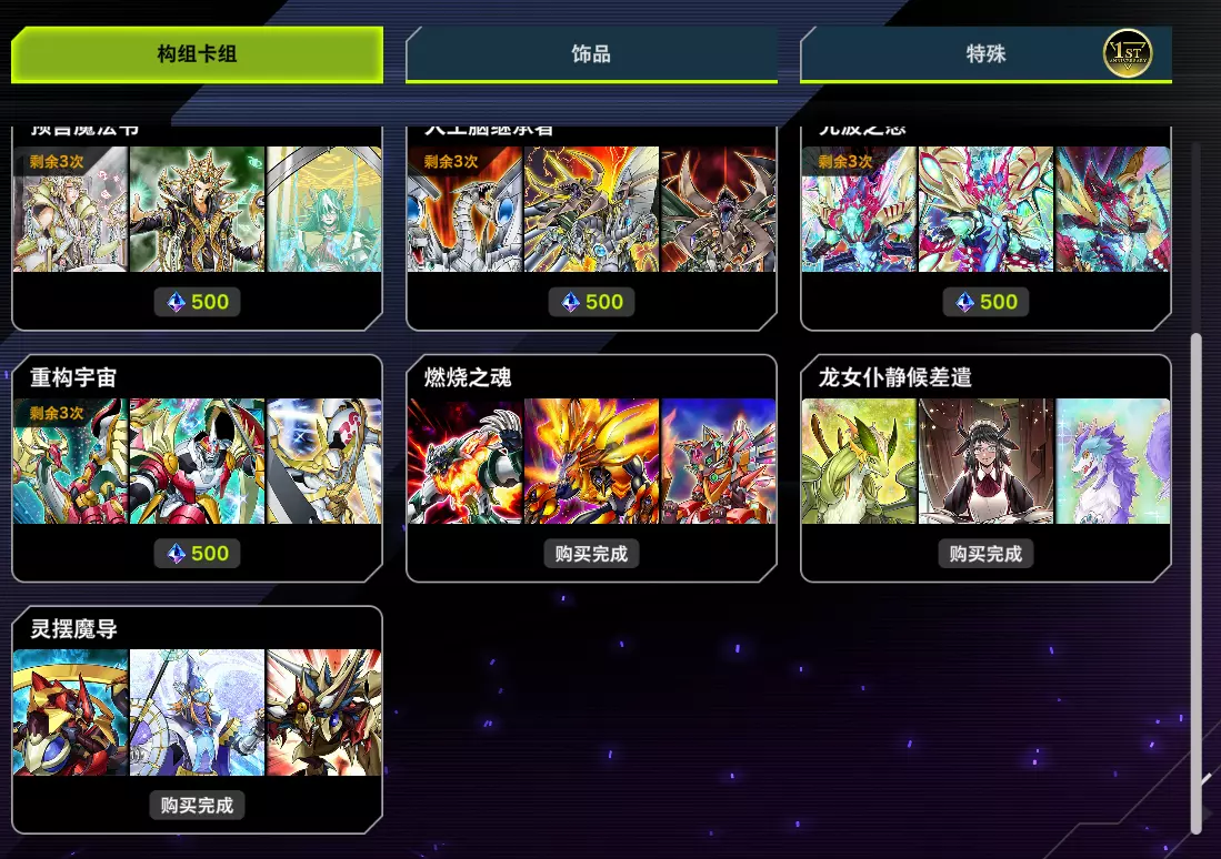 完成教程后,建议跳过决斗并重启,进入决斗训练-决斗策略1,使用初始卡组完成前三个决斗,然后完成上述4个练习。若在此之前已有1500钻石,可跳过此步骤。 2.2 第一套卡组 本指南推荐的第一套卡组是转生炎兽。作为预组包中竞技实力较强的卡组,其内容覆盖全面,几乎开箱即用,且需要合成的几张电子界族额外卡牌泛用性也不错。炎兽卡组的特点能让玩家快速熟悉游戏的基本展开方法(通过怪兽效果不断扩张资源)和墓地的重要性,是适合新手的卡组。获得1500钻石或2250钻石后,进入商店-构筑卡组,购买3套【燃烧之魂】,然后在商店-特殊-套装商品中,购买【灰流丽套装】。这样,你就有了第一套卡组,主要作用是完成单人教程的其余部分,稍微强化一下还可以用来打排位赛。