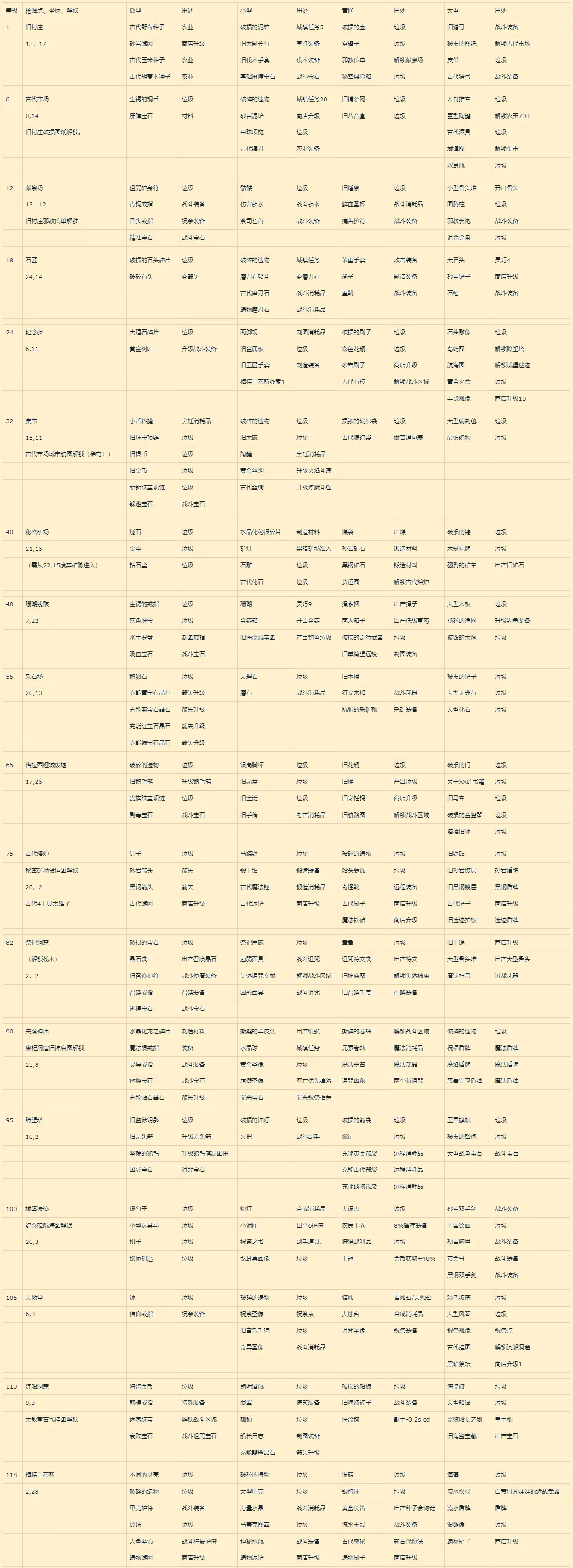 第三节 战斗流程 这次的战斗主要围绕屏障这一概念进行,AoD资料片的怪物都带有屏障属性,屏障只能靠使魔(召唤石板)的攻击和其他对屏障攻击来进行,而且打的慢了,它自己会回复。 幸运的是,AoD的怪物上限是原版强度,最强不过是迷雾后黑暗前,也就是我前面所述原版第三阶段的强度,对于现在手里有ToTH装备的我们来说,只要屏障破了就是胜利。 新副本:魔像领地、罪恶森林、欺诈神庙、邪教领地、水下城市 前4个副本很简单,带个考古6级的屏障宝石,龙+牛头/人马,平推即可。 前两个本理论上应该法系去打,但是三系平推都很轻松。 三四本,神庙和邪教,这一套已经有点慢了,硬磨虽然不是不行,但是不完全推荐。 这里更推荐在魔像本攒10对宝石,去搓黑龙甲升级版(升级到屏障前缀),再随便带个空灵弓/毕业弩,这俩副本就可以平推了。 神庙本平推之后需要注意继续收集这个本的两个宝石,用以升级火山或者叫熔岩本那一套古代甲,升级后的头胸腿三件装备一来可以免疫水晶化(就是屠杀区域那个罚站技能),二来增强对屏障攻击力,方便破那个越来越厚的屏障。其实对屏障最猛的是ToTH诅咒森林的召唤4件套,攻击几乎翻倍。 然后把魔像神庙本出的饰品随便装几件,宝石带好,带个龟+龙或者蜘蛛+幽灵,然后打水下城市。 另外,有这3件水晶级装备就不怕屠杀区水晶化/水晶制裁这两个罚站技能了,可以平推之,方便获取水晶灰烬。另外一个方案是准备锻造水晶套。但那套衣服属性太拉了。 最后的水下世界BOSS眩晕一击三千血,需要近战堆67%的减伤保证站住 但是已经沃罗兰毕业的我……仍然碾了过去。 极限情况下,沃罗兰毕业装,带个屏障宝石带个龙+牛头,也能过的去,就是磨的比较烦而已。 攒材料最麻烦的是屏障宝石、两种水晶灰烬,还有两种精炼水晶,材料分别在挖矿和考古获取。 后记:说实话,对于熬过ToTH的玩家来说,AoD的战斗过于简单,难点都是攒材料而已。都不太想做攻略了…… PS:新出的遗物模式倒是非常有趣,有空的话可以耍耍。 第四节 解密和彩蛋 一、梅特兰蒂斯的进入(极简版) 1,考古纪念碑小型点获得线索1 2,穿流水专家巫师4件+流水奥秘法杖到金字塔16,13得到线索2 3,神秘岛9,11,获得线索3 4,1,15房顶。拿到线索4 5,流水专家套,古代炼狱斗篷(考古集市拿古代丝绸升级),欺诈之镜(普通战斗区域-失落神庙-魔镜,几率掉落),到2,28解锁亚特兰蒂斯。 二,转载关于制图学地图上的两个彩蛋 首先感谢拆包大佬林夕,顺9便6给7他1扣8群0做0个2广8告 彩蛋1:柠檬 地图上有个莱姆沃尔入口,坐标6,12,没明说的是,这里需要帅气墨镜进场。 帅气墨镜是一个早期彩蛋,抚摸酷洛克95次可以获得。 就是在宠物界面里对着采矿宠物酷洛克鼠标点!点足一百哈! 从入口进去会变成一个新的地图。新图不大,探索精通和外面都不通用。比较有意思的是这里旅行使用的是柠檬而非金币。没错又是一个彩蛋物品~ 如果柠檬没有了,可以在仓库搜索框输入wherearemylemons补充柠檬。 彩蛋2:黄金黄金戈尔宾雕像和黄金箱 这两个都是旅行随机事件获得的。其实说起来这两个不能算彩蛋,因为全物品收集有这4个…… 需要在地图旅行时,随机触发藏宝图事件(随机概率10/1080),获得藏宝图,而后再触发随机雕像事件(随机概率20/1080),则可获得黄金戈尔宾雕像。 同样的,需要随机触发特殊钥匙事件(随机概率5/1080),获得钥匙,而后才能触发黄金箱事件(随机概率10/1080),获得黄金箱。 另外,根据解包数据,旅行事件触发概率:1-(1-海域格概率)^海域格数量 (海域格基础概率0.02,船长日志增幅后0.04) (旅行路程中每经过一个海域格,海域格数量+1) 系统先roll点决定是否触发旅行事件,再roll点随机具体触发那一件旅行事件 第五节 遗物模式初探 遗物模式没有了双倍和留存,但是每个技能增添的6个遗物非常有趣,理论上能力上限是远在普通模式之上的。最大限制是开局没有食物和首通过本才能开技能上限两个问题。 开局难点1:食物。 开场打植物,刷土豆,刷三围。打哥布林拿到斧子盾牌,顺路领城镇任务。杀钢铁骑士拿防具。 土豆攒够了通鸡舍,手动吃,记得SL,提高扒窃上限到25(硬SL出两个扒窃更好) 继续攒土豆,刷三围,打亡灵墓地,SL提高扒窃上限到40 一路正常偷(女人的钱包、哥布林首领的面具、强盗的斗篷、鞋子,有钱记得买手套),没血了回去刷土豆。20级SL出150隐蔽的遗物。直到偷大厨保证100%,安心挖几天保证食物来源。 副本第一次过必手操,可以粗略认为食物阈值100%,此情况下仅有强盗基地和古龙稍难(连击类技能在手操下很闹心),可以跳过回头打,其他本正常顺序一个一个刷。反正前面的本没啥必须要刷的东西,开好上限回头再刷(SL)。 屏障本也必须过,开场考古6级挖的宝石就可以开始刷低级屏障怪,拿个宝石,随便搓个有伤害的石板就可以打了。到第三个副本需要改远程。召唤20级最好SL个100%召唤伤害的遗物,还算轻松。 个人推荐技能: 第一批次 扒窃40,偷食物 符文锻造,85,可以出古代符文。 召唤,99。屏障本大量需求,战力大幅度提升 屠杀,99。部分副本需要屠杀等级,并有大量重要兑换。 第二批次 祝祭,99。战力明显提升 扒窃99,前中期赚钱主力。 采矿+锻造,99,为了应付屏障。 制图80,对屏障宝石和20%屠杀区域减免 灵巧50,障碍6战力提升明显。 第三批次 务农+草药99,DR药和钻石药仍然重要 星象70,廓尔(扒窃)星象 第四批次 