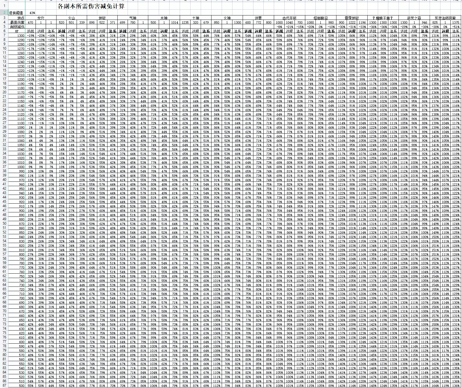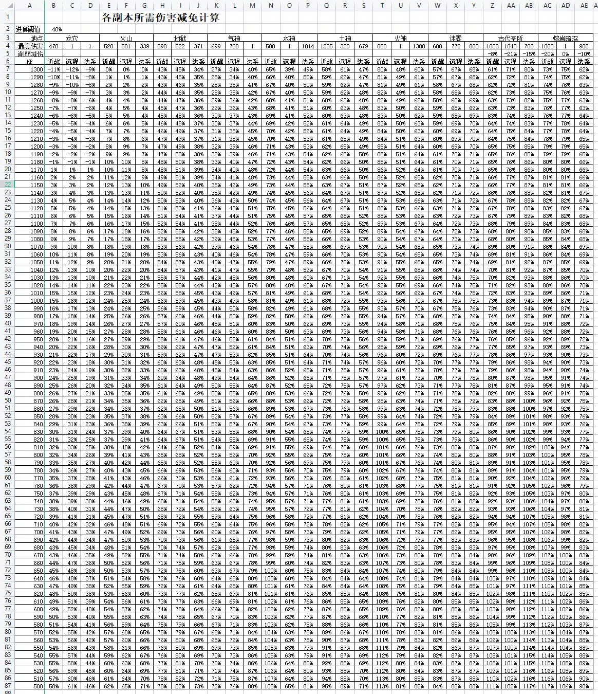 很啰嗦的战斗流程 一、原版开荒流程 (大体成文时间大约在23年初) 基础操作就不废话了。旧版战斗大致分为三个阶段, 1初期是打植物到战翻熔岩洞窟(火山)为止,这个阶段基本上是熟悉操作,升升级。毕业考就是火山副本。 2中期是杀穿风土水火四神,战斗方面攒齐四神套,并基本达到全技能90+。毕业考试是遁入迷雾副本。 3后期是打破遁入迷雾到幽暗水域、不洁废土,战斗方面获得终极武器和套装(手套戒指)。毕业挑战就是湮灭黑暗。 4进入DLC。DLC大部分装备默认需要通关黑暗,暂且不讨论。 战斗有两个必须注意的细节, 1战斗三角:近战克远程,远程克魔法,魔法克近战。前期还好,到四神阶段逆克制非常伤,非特殊情况尽量避免。 2减伤:减伤(DR)是原版游戏的核心思想,你的血量和减伤一起决定你是否抗得住,避免手操对于挂机类游戏而言非常重要。堆减伤的思路以装备为主、附以祝祭、召唤、星象、药水、灵巧等。正所谓站不住场靠大盾,坦的住就啥都好说。 本流程以标准难度为主。冒险/硬核模式难度在于逆克制时劣势更加明显,但只要打好克制问题不大。生活技能/赚钱本流程不涉及。 下面开始战斗流程 第一阶段——前期 开局建议从比较简单的近战开始起手,前期战斗就是练习刺劈防技能等级,同时通过锻造或者XX骑士攒下一套减伤足够的装备以备进入火山。 开始只能打植物,近战三维有个10左右打奶牛,牛肉烤着吃,牛皮换绿龙皮卖(常用小技巧:皮革卖50,但搭100G买绿龙皮能卖200G,算下来净赚50) 三维有个30左右,可以打青年农夫搞种子种地,可以打水蛭找witwix之箱的彩蛋项链,可以找木乃伊和强盗攒元素圣斗士护符的材料等等。黄宝石金戒指建议搞一个装备在身。 屠杀技能的练习也要跟上,趁着初期简易屠杀免费刷新,把屠杀对象刷成你想要的怪,这样顺便涨屠杀技能等级和屠杀币。有脚本的话可以选择性的刷几种怪。 同时,如果有骨头,就烧成祝祭点数,这样在战斗界面可以选择祝祭,初期多开命中类祝祭。 到近战平均50左右,就可以去挑战冰霜怪物(要带够食物)拿冰霜剑。闲时打几个副本,墓地(精英防御护符)蜘蛛(拾取项链)古龙(龙皮盾,古代弩),都没事儿了可以去尝试着打巨蟹和寒冰射手,皮薄陷大算得上旧版本练技能经验包。 到近战平均70+左右,应该为打火山做准备了,身上打造一套龙岩金,或者找符文骑士弄个符文套自己升级(符文略弱,需要其他部分加强)。武器去打海盗副本,日落刺剑YYDS;打圣骑士弄个圣骑士手套(龙穴的古龙皮手升级版也成),打沙怪(带!够!食物!)弄个沙尘暴戒指(或者简单的带钻石银戒),打精金骑士弄个黑曜石披风(扒到骑士披风更好),带上精英防御项链。原版几个副本的思路基本都是如此,堆血堆减伤,站不住就起盾,再站不住就上祝祭,上召唤、星象、药水、灵巧,等等。 属性够了就准备食物,杀上火山! 为了方便新手学习计算属性,我拿熔岩洞窟做一个减伤计算的示范,后面副本计算基本类似就不说了(BOSS特殊技能请因地制宜)。 懒人可以等俺有空了发个表格。 根据WIKI,火山怪的最高的近战的单次伤害是BOSS,520点伤害,远程则是门神的501,法系339 再考虑三角克制关系,逆克制近战对法系DR按75%计算,远程对近战DR按95%,法系面对远程按85%,正克制均为125% 我方要保证最大HP*40%(3级吃阈值)大于怪物攻击力*(1-我方DR%*三角克制系数),则站场成功。 举个例子,近战打火山面对远程门神需要:HP * 40% > 501 *(1 - DR% * 1.25) 故计算: 使用近战风格,则DR需求为: 面对近战:(1-HP*40%/520)/1 面对远程:(1-HP*40%/501)/1.25 面对法系:(1-HP*40%/339)/0.75 远程、法系计算过程类似。 HP和DR满足要求就意味着火山怪物打不死你,只要保持好食物,磨也磨过去了。 后期灵巧15和铺张戒可以提高自动吃的阈值,一样放进公式就行了。 第二阶段——中期 过火山之后就是中期了,这个阶段的主要目标是四神全套装备,同时远近法技能都需要提升到至少90,阶段结束目标全战斗系技能99。 打过火山披风第一时间穿上。火山箱子要开出古代4件套,升级金色,最好搞到普拉特斗篷备用。然后准备打风神。 1风神阿利亚斯 伤害数据:近699远780法0 风神是个远程本,我们用近战去打,火山箱子要开出古代4件套并升级成金色,+金龙岩靴(DR富余可以用沙地靴等),火山披风,风神本压力并不大。 假设你有850HP,需要52DR,那么4件金古代28DR,金龙靴6,古龙皮手6,火山披风2,防御项链2,药水10,祝祭1,灵巧2,宠物2,合59%,富裕7点。如果已经把古代盾升级到龙盾就更宽松了,但是龙骨确实挺麻烦的。 实在凑不齐的,SL拼运气硬打,风神的鞋子手套很容易出,考虑四神套的DR大多都是8%点,更容易达标。 祝祭针对风神可以开远程庇护/守护/物品庇佑等,防御面足够话的开个近战精准类也好。 药水:伤害减免药水,前面可以看到,辅助减伤的大头就是药水,草药学不能丢 召唤石板方面,近战开了牛头人就是牛头人,没开就装个狼或者哥布林之类的。顺便说一下初期远程是半人马为主,法系是女巫石板为主。真缺那个防御,就拉上牦牛+XX再加上3点DR。 风神掉落卷轴和晶石(直接合宝箱),靠RP或SL获得风神弓+阿利亚斯5件套+死射戒指+死射项链,最好顺路预备出5把风神剑。 但是这几个装备要求你远程85,所以练练远程技能吧!具体怎么练请各显神通。 顺便说下,如果还打算做元素圣斗士护符,记得去巫师塔揍大巫师,凑200个魔法护符。 披风继续穿火