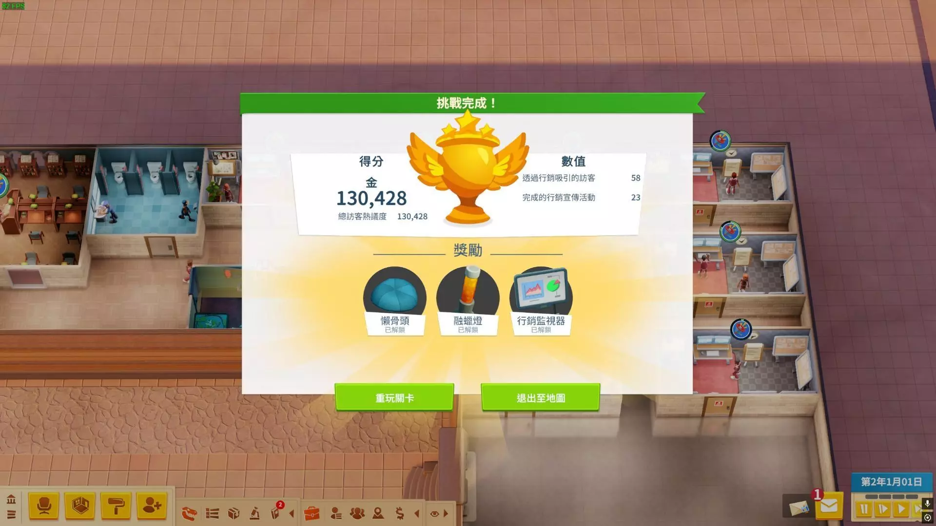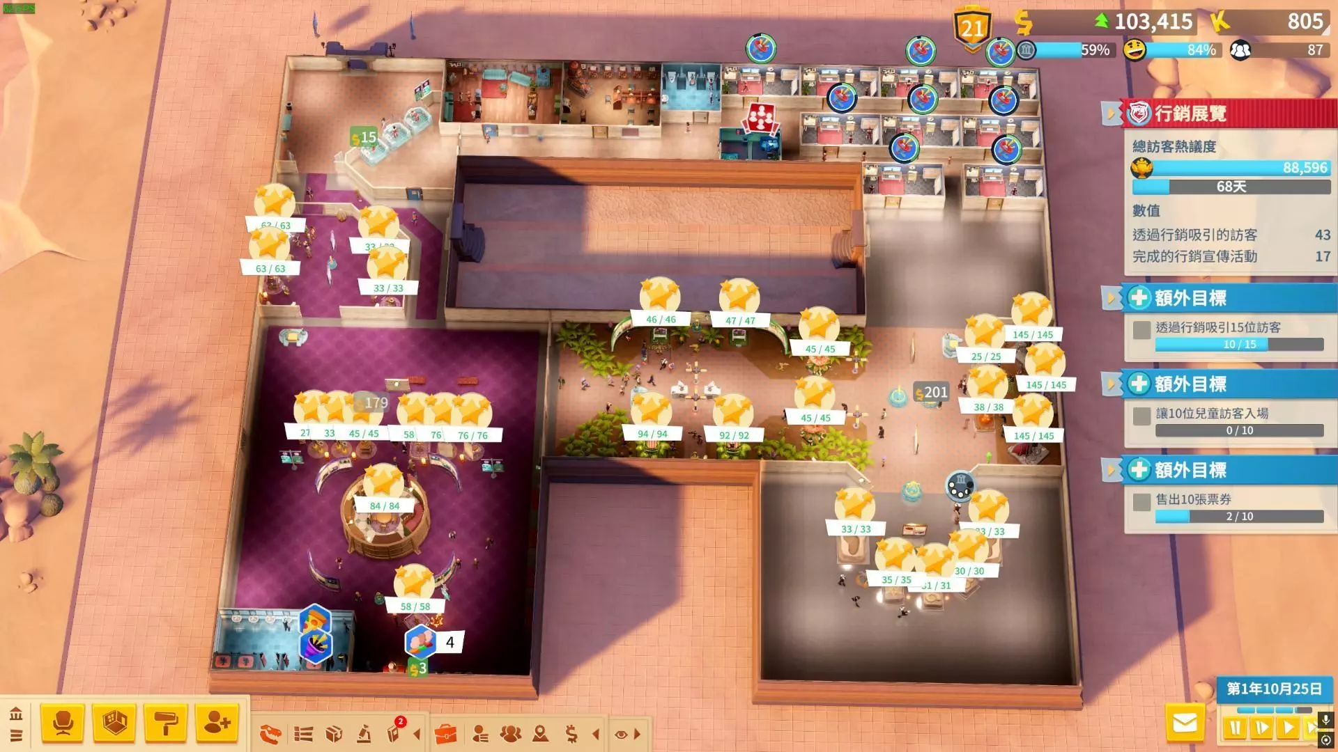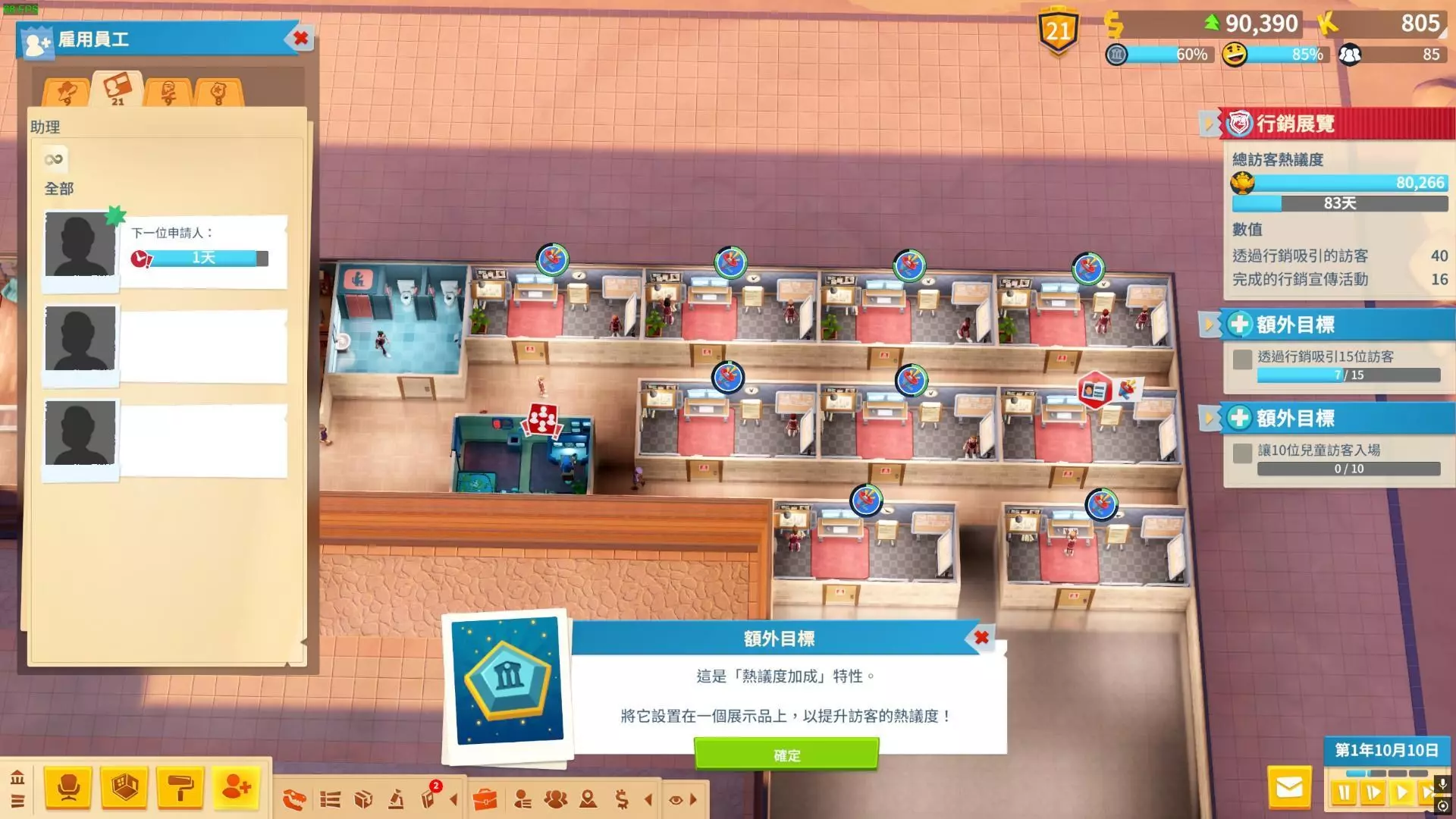 营销展览布局 在营销展览布局方面,一间营销办公室可以举办一场营销活动。因此建议大量建造营销办公室,尽量在其中放置能够增强营销宣传活动效果的物件。不过后来发现一间办公室可以派遣多名助理,所以之后就没有继续建造了。