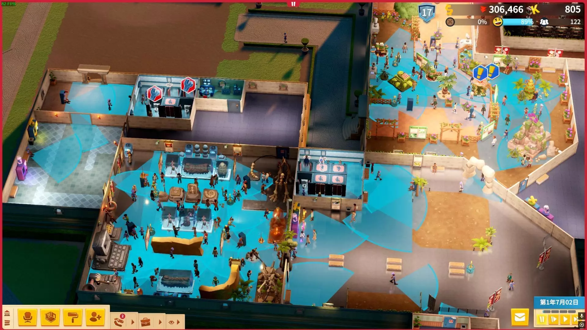 懒人包 一、安保展览: 贷款贷满,雇佣尽可能多的安保人员,至少配备一个监控,注意分配工作区域。 展品集中管理,最好只设两大区域,记得充分利用展品的装饰度和热议度加成。 大量安装监控器和安保椅,确保覆盖所有展品。 若发现小偷,可手动将安保人员派到小偷旁,立即实施逮捕。 二、营销展览: 贷款贷满,雇佣尽可能多的助理,重点培养营销人才,部分能力较高者可进一步提升营销技能。 培训室放置更多书桌,以便同时培养更多人员。 大量建造营销办公室,且每间办公室可安排多名人员。 在营销办公室内尽可能放置能增强营销宣传活动效果的物件。 优先宣传热议度高的展品,例如展品“嗜血植物”(子类别:食人植物),史前类展品热议度比超自然类还低,可直接放弃。记得充分利用展品的装饰度和热议度加成,完成额外目标可获得特性模组,记得装备。因此需要稍微培训一些具备机械学技能的工友。导览功能记得使用,除了能提升热议度,有时还是完成额外目标的必要条件。