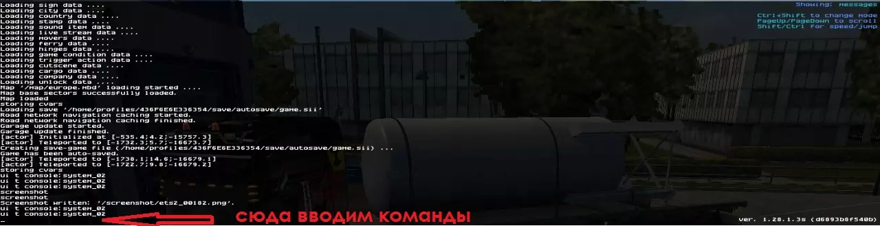 (выкл - 0/1 - вкл). Команда Описание g_minicon 0/1 миниконсоль(постоянный мониторинг состояния лога) g_developer 0/1 свободная камера (колесико мыши вперед назад - увеличение снижение скорости свободной камеры) g_set_time 12 30 код меняет время в игре на то, которое вы ввели (например 12:30) g_set_weather 0/1 код меняет погоду (0 - дождя нет. 1 - дождь). g_flyspeed 100 код меняет скорость свободной камеры (число любое) кнопка "0" для активации камеры + по нажатию на "F9" ваш тягач телепортируеться на то место, где находится свободная камера. колесиком регулируем скорость движения камеры. uset r_steering_wheel 0/1 убираем виртуальный руль goto - перемещение в нужный город. вместо - пишем город который нам нужен. Например : goto praha и жмем Enter и мы попадаем в Прагу goto -44831.8;112.729;-40232.4 перемещение в конкретное место на карте(по координатам) g_traffic 0/10 меняет количество трафика на дорогах. g_police 0/1 отключает либо включает полиции штрафов (0 - штрафы выкл. 1 - штрафы вкл). g_fatigue 0/1 отключение/включение сна warp 0.8 скорость симуляции игры g_fps 0/1 отключение/включение показа fps (должна быть активирована миниконсоль) s_interior_volume 1.5 регулировка звука в кабине (диапазон от 0 до 2, по умолчанию 1.0) s_wheel_noise 0 изменение громкости шума шин (можно ставить и другие числа. Например, 0.25 (25%)) g_job_distance_limit 250 ограничение расстояния маршрута для заказов (максимальное расстояние маршрута будет ограничено 250 километрами. Если на таком расстоянии не будет ни одной базы, то будут генерироваться заказы к ближайшим базам. Чтобы отключить, ввести -1.0 или любое отрицательное значение, включая 0. Для срабатывания нужно несколько раз поспать. То же самое можно сделать в профильных настройках.) g_show_game_elements 0/1 отключение/включение в игре все интерактивные 3D-маркеры (маркер прицепа, заправки, фирмы, агентства, парома и т.п.). Или же в главном конфиге игры этот же параметр установить в "0": Подойдёт для опытных, кто уже в курсе, где и что в игре находится. g_adviser_keep_hidden 0/1 отключает либо включает отображение уведомлений Route Advisor. (0 - уведомления отключены. 1 - уведомления включены). g_adviser_auto_parking 0/1 отключает либо включает автоматическую парковку при нажатии Enter. (0 - авто-парковка отключена. 1 - авто-парковка включена). g_force_economy_reset 1 Обновить грузы g_income_factor X.XX изменение размера оплаты доставки. Где X.XX - это число от 1.0 (по умолчанию) до 0.0 (наёмники работают в максимальный убыток). Цифры работают по разному для себя и для наёмников. При 0 вы работаете бесплатно, а наёмники в максимальный убыток, при 0.5 - они будут работать бесплатно, а вы будете получать половину. g_save_indicator 0/1 (Где: 1 - индикатор сохранения включен 0 - индикатор сохранения отключен) uset g_simple_parking_doubles 0/1 позволяет парковать двойные сцепки как обычные прицепы(для профи) g_park_brake_init 0/1 Стояночный тормоз автоматически включается после появления икры грузовика (новая команда) exit Выход в главное меню quit Выйти из игры sys_info Отображает текущую системную информацию edit Запускает редактор карт/мира <TAB Key> Если нажать клавишу [Tab] при пустой строке, то игра выведет все консольные команды. cheat company Список компаний в игре (не проверено) g_income_factor # Список офисов выбранной кампании (# - значение от 0 до 44) (не проверено) warp <#> Позволяет изменить скорость игры. По умолчанию стоит значение 1.0. Если прописать значение выше (к примеру: warp 10) -скорость увеличиться, если ниже (к примеру: warp 0.5) - уменьшится.(не проверено) Управление свободной камерой: Колесико впе