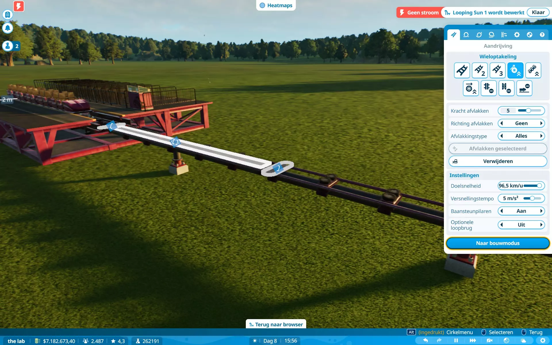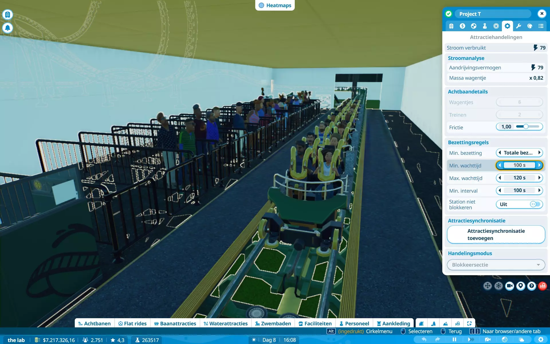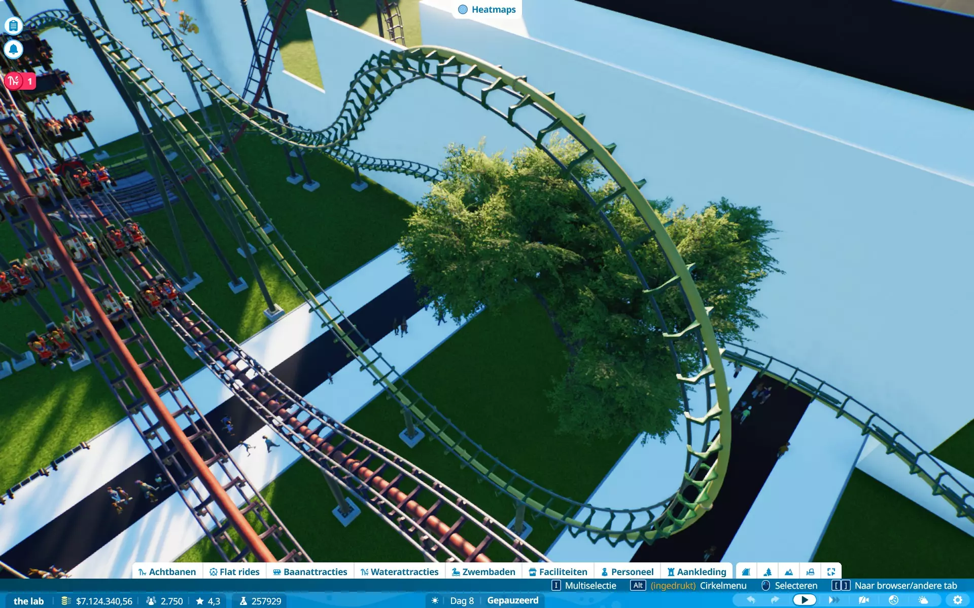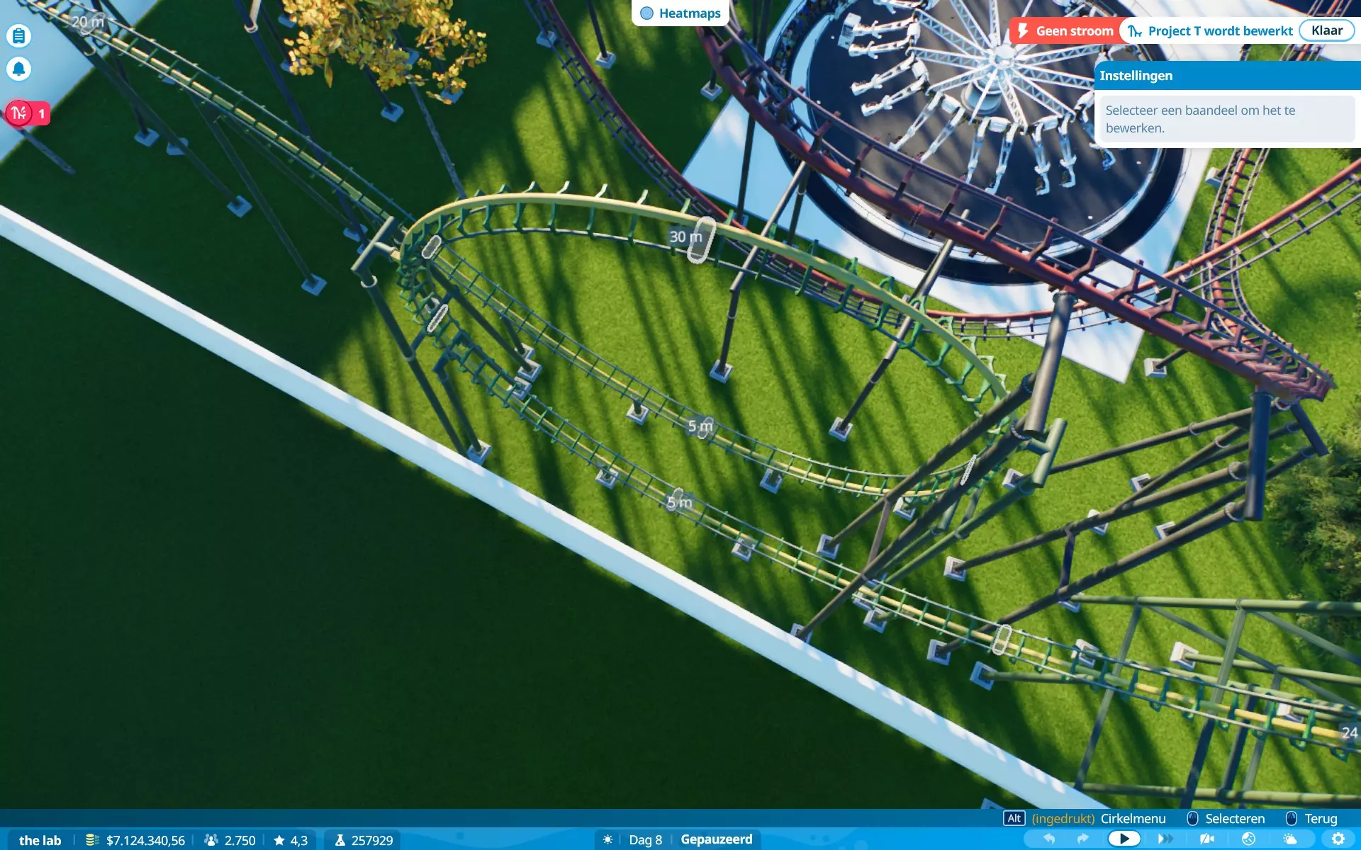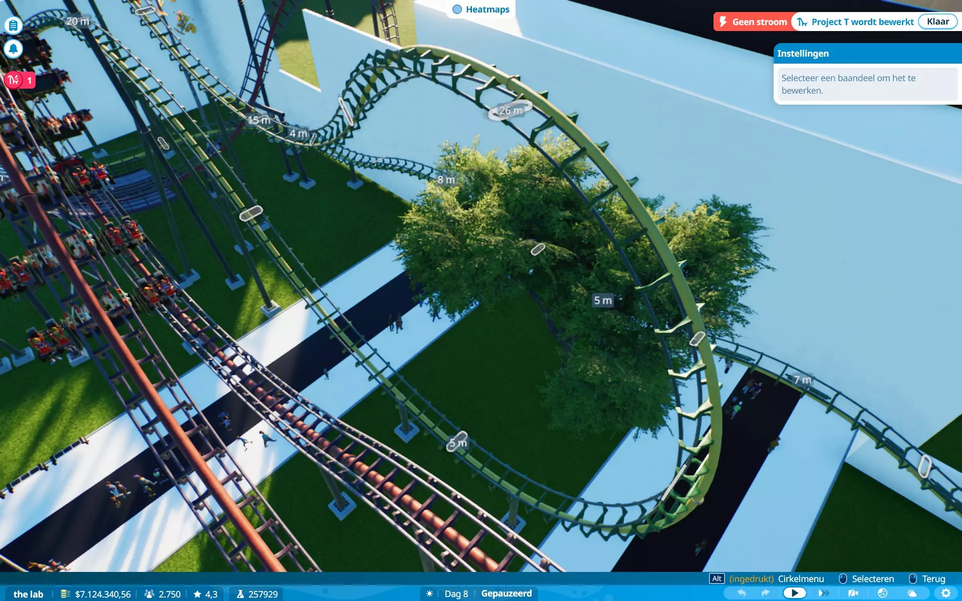 恐惧、恶心、G力、高度、速度、景观、排队时间。当更多属性超出偏好时,游客不太愿意乘坐游乐设施。解决方法:时常查看游客情况,并为过山车设置最大限制。对我来说(制作时),G力:5G,速度:150公里/小时(93英里/小时)。稍微超出一点问题不大,但要避免数值大幅波动。在图片中,除速度外的所有数值都符合所选游客的偏好,但他们仍会乘坐,因为游乐设施的速度属性略高于游客的偏好(是的,我的游戏是荷兰语,但属性数据仍然存在)。当游客乘坐游乐设施时会感到恐慌,他们的恐慌值(以及恶心值)会上升。上升幅度通常取决于游乐设施的恐惧值。当游乐设施超出游客的恐惧耐受度时,他们就不会乘坐。当游客乘坐过山车时,他们会变得更加恐慌。当游客处于极度恐慌状态时,他们不会尝试乘坐任何设施,除非你能先让他们冷静下来。解决方法:在高恐惧值的设施附近放置座椅或低恐惧值的舒缓设施,或者为他们提供一个可以冷静下来的地方。我需要更长的轨道段。建造过山车时,你可能会发现自己最多只能使用20米的轨道段,如果你想建造一个高速过山车,这可能会很麻烦……因为这些轨道段通常会产生超过5G的过载(这通常是大多数游客的承受上限,但有些游客追求更高的过载)。
