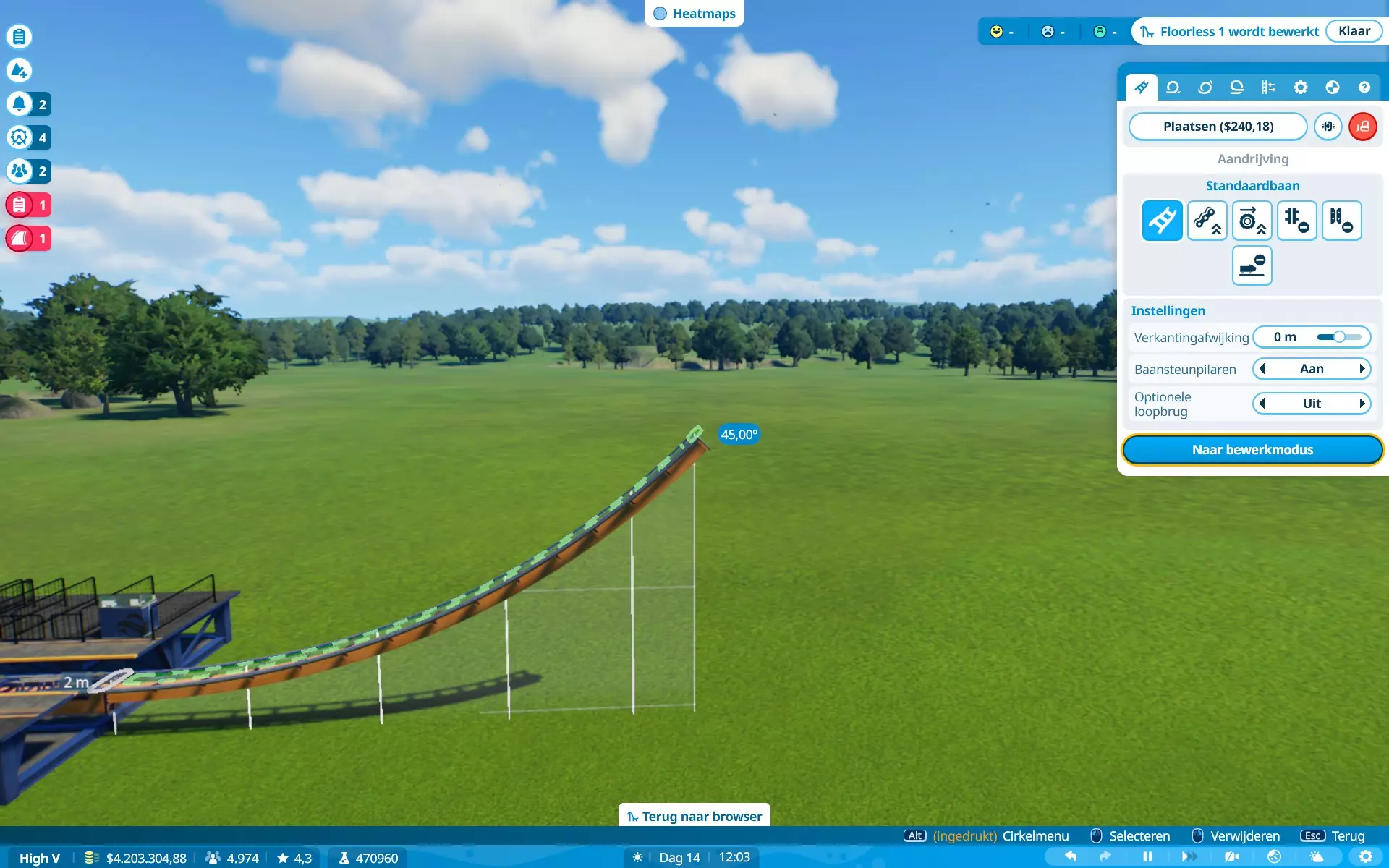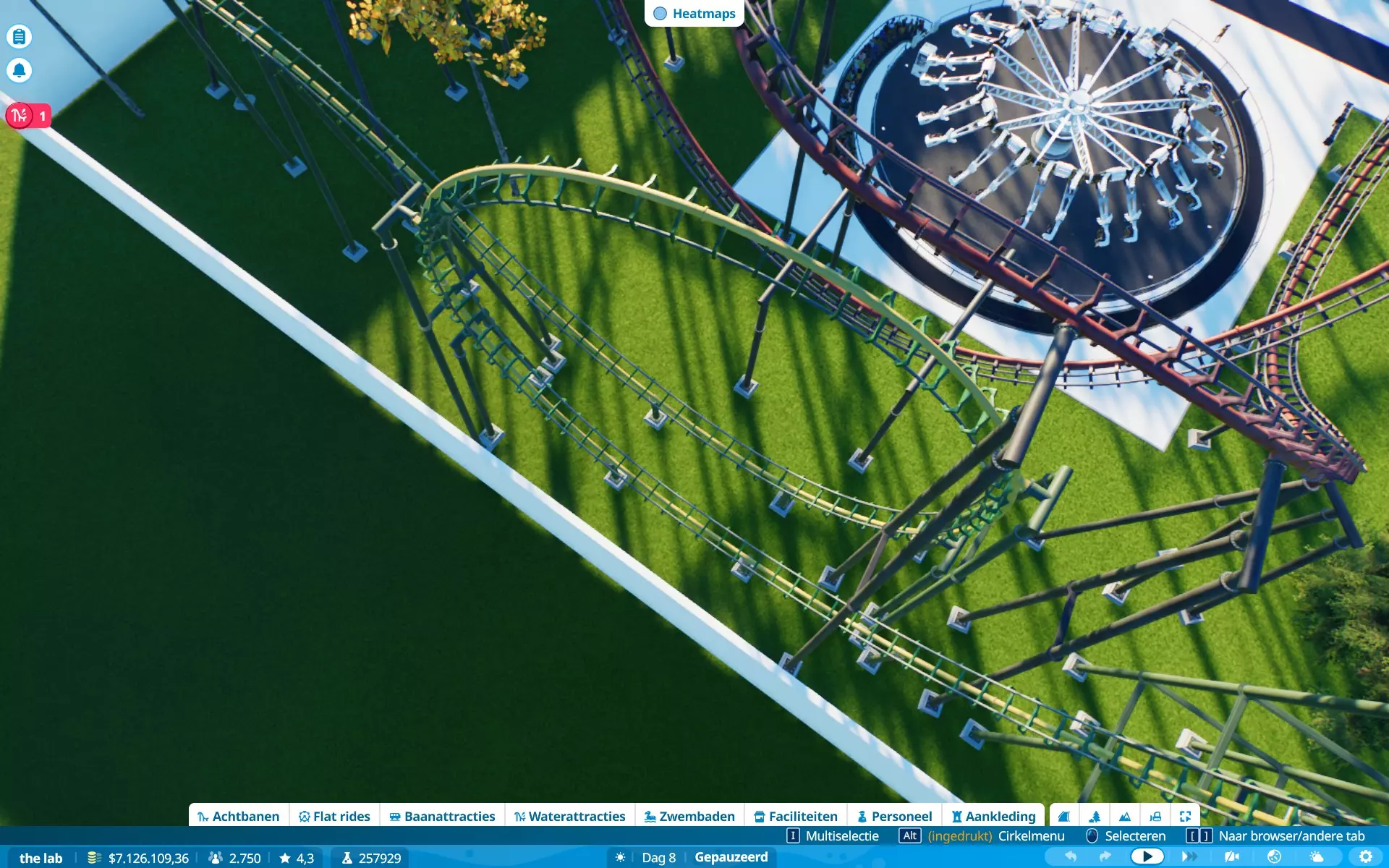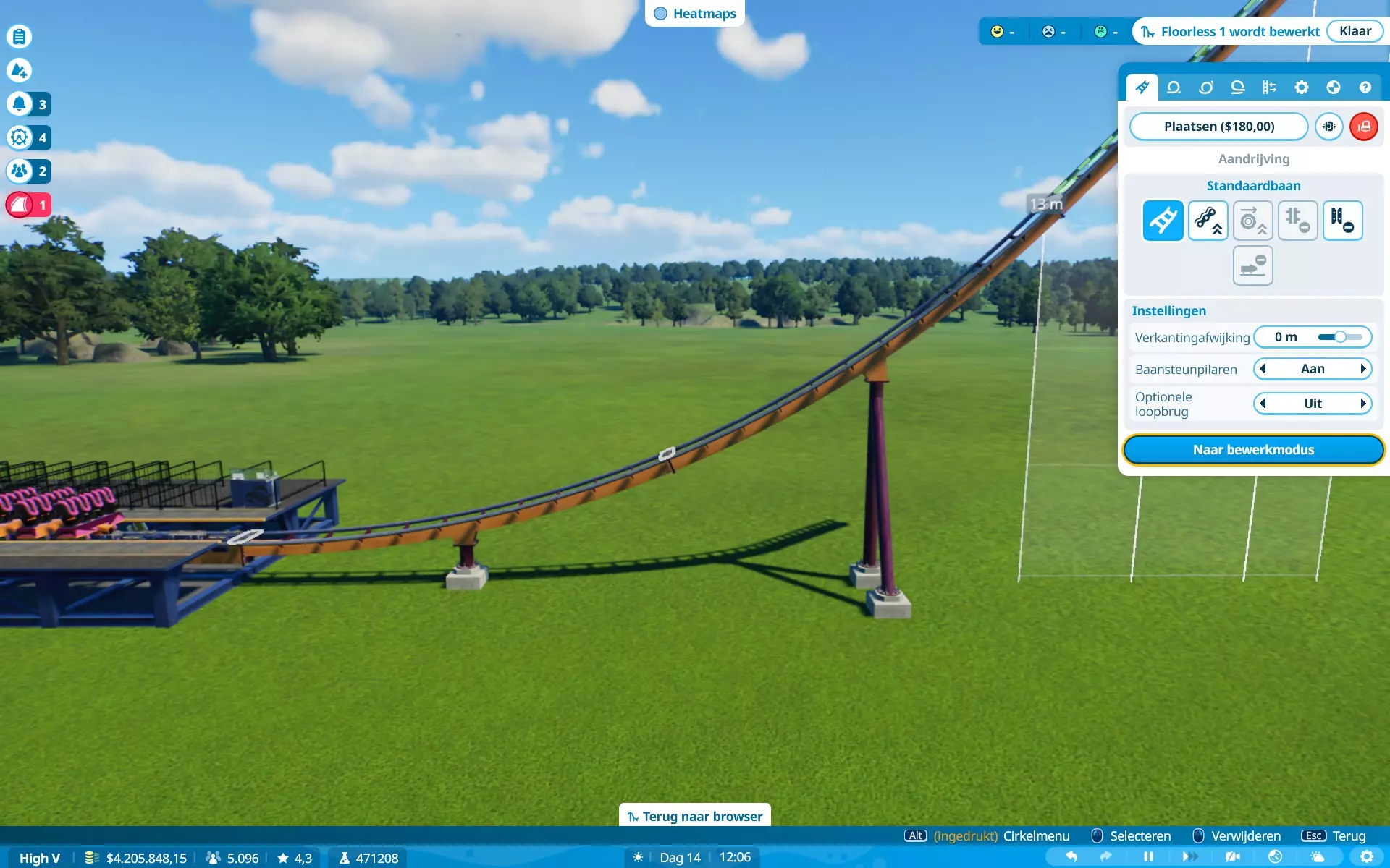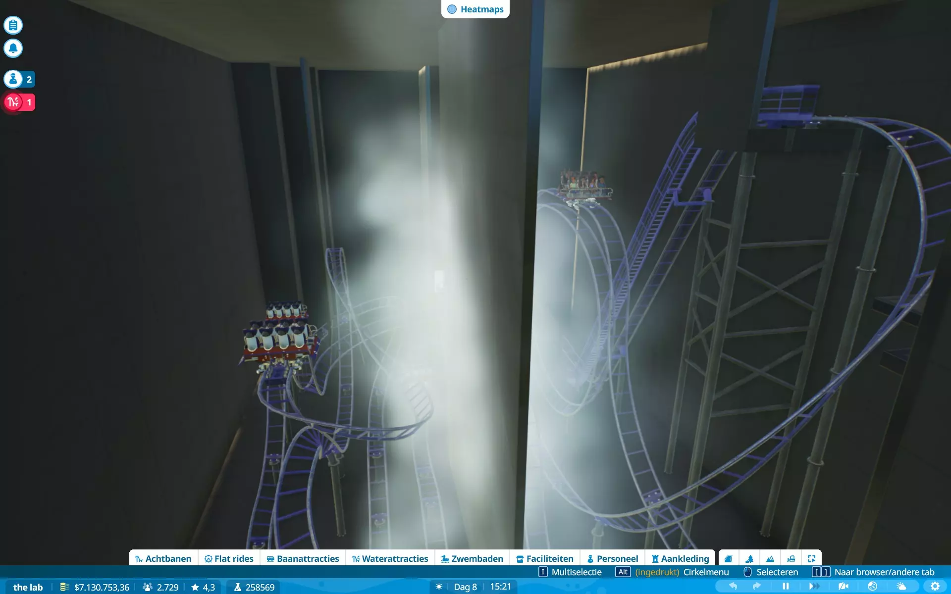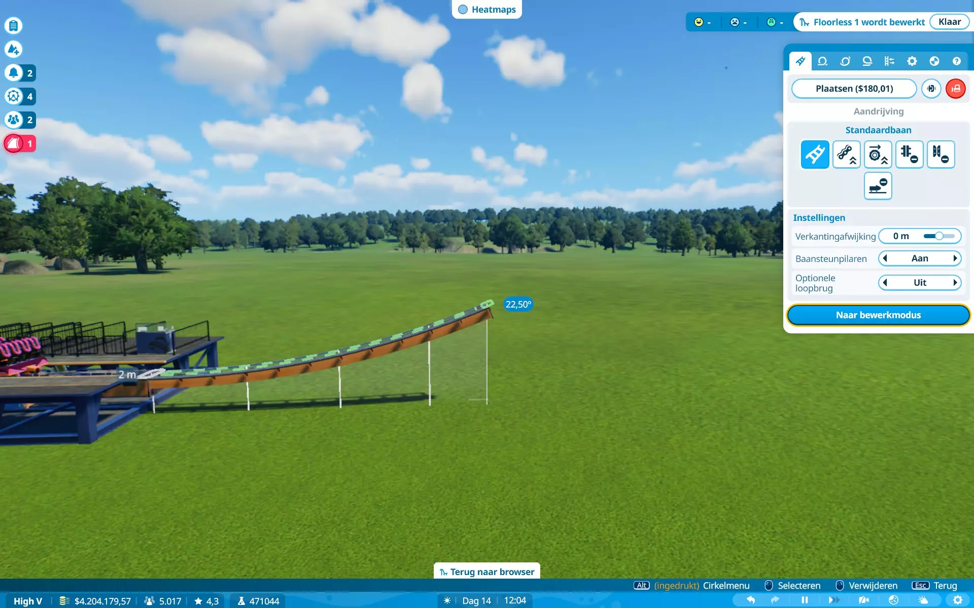 恐惧、恶心、G力、高度、速度、景观、排队时间。当更多属性超出偏好时,游客不太愿意乘坐游乐设施。解决方法:时常查看游客情况,并为过山车设置最大限制。对我来说(制作时),G力:5G,速度:150公里/小时(93英里/小时)。稍微超出一点问题不大,但要避免数值大幅波动。在图片中,除速度外的所有数值都符合所选游客的偏好,但他们仍会乘坐,因为游乐设施的速度属性略高于游客的偏好(是的,我的游戏是荷兰语,但属性数据仍然存在)。当游客乘坐游乐设施时会感到恐慌,他们的恐慌值(以及恶心值)会上升。上升幅度通常取决于游乐设施的恐惧值。当游乐设施超出游客的恐惧耐受度时,他们就不会乘坐。当游客乘坐过山车时,他们会变得更加恐慌。当游客处于极度恐慌状态时,他们不会尝试乘坐任何设施,除非你能先让他们冷静下来。解决方法:在高恐惧值的设施附近放置座椅或低恐惧值的舒缓设施,或者为他们提供一个可以冷静下来的地方。我需要更长的轨道段。建造过山车时,你可能会发现自己最多只能使用20米的轨道段,如果你想建造一个高速过山车,这可能会很麻烦……因为这些轨道段通常会产生超过5G的过载(这通常是大多数游客的承受上限,但有些游客追求更高的过载)。