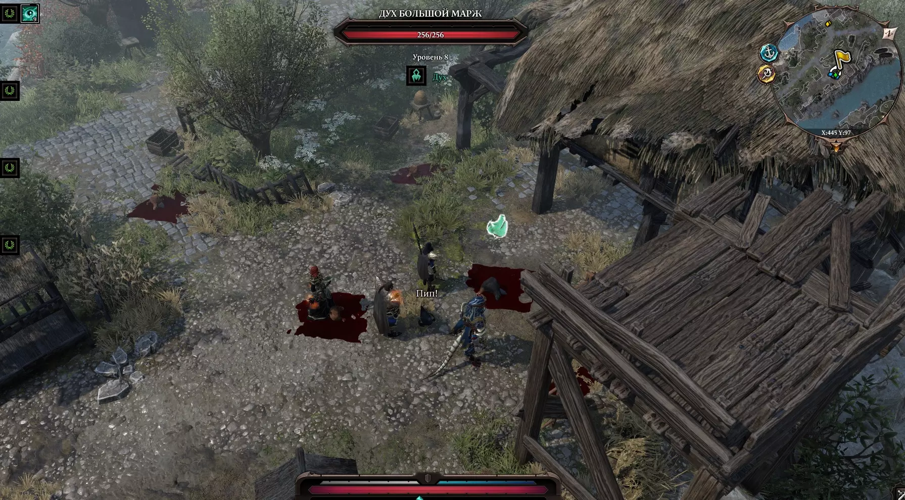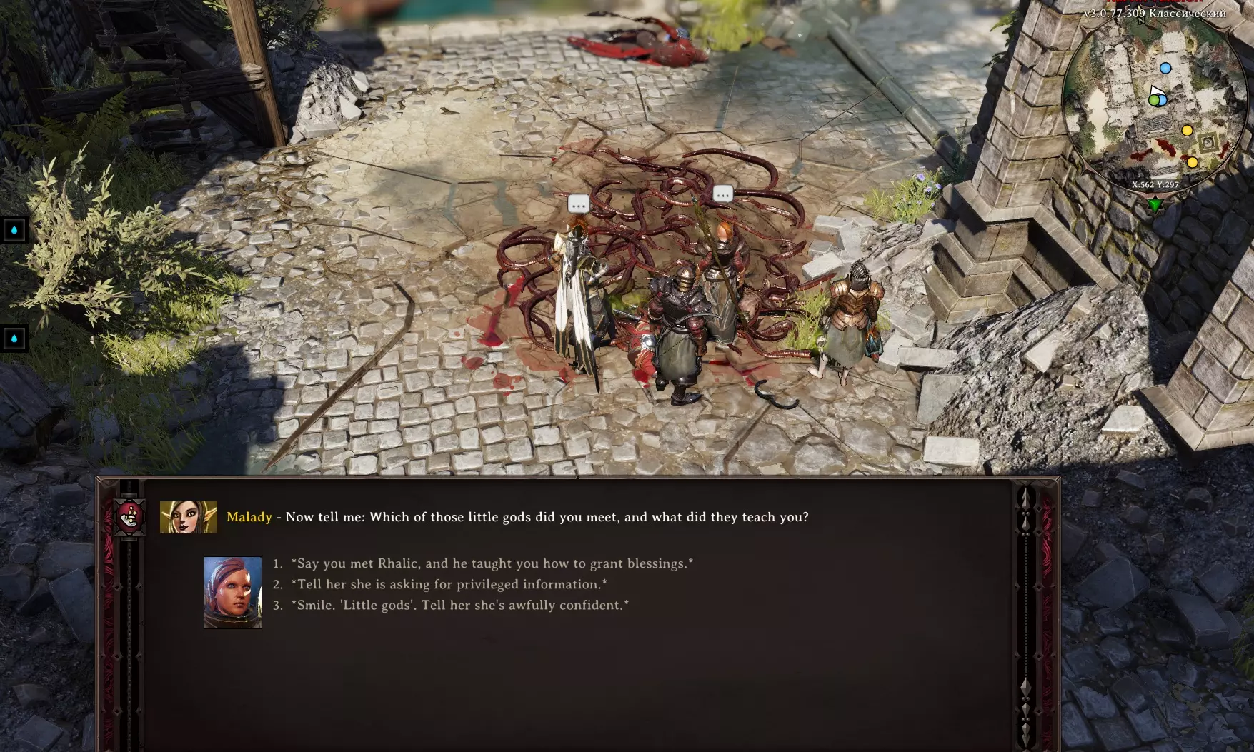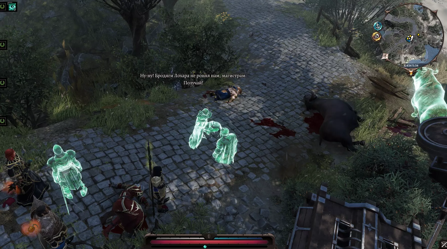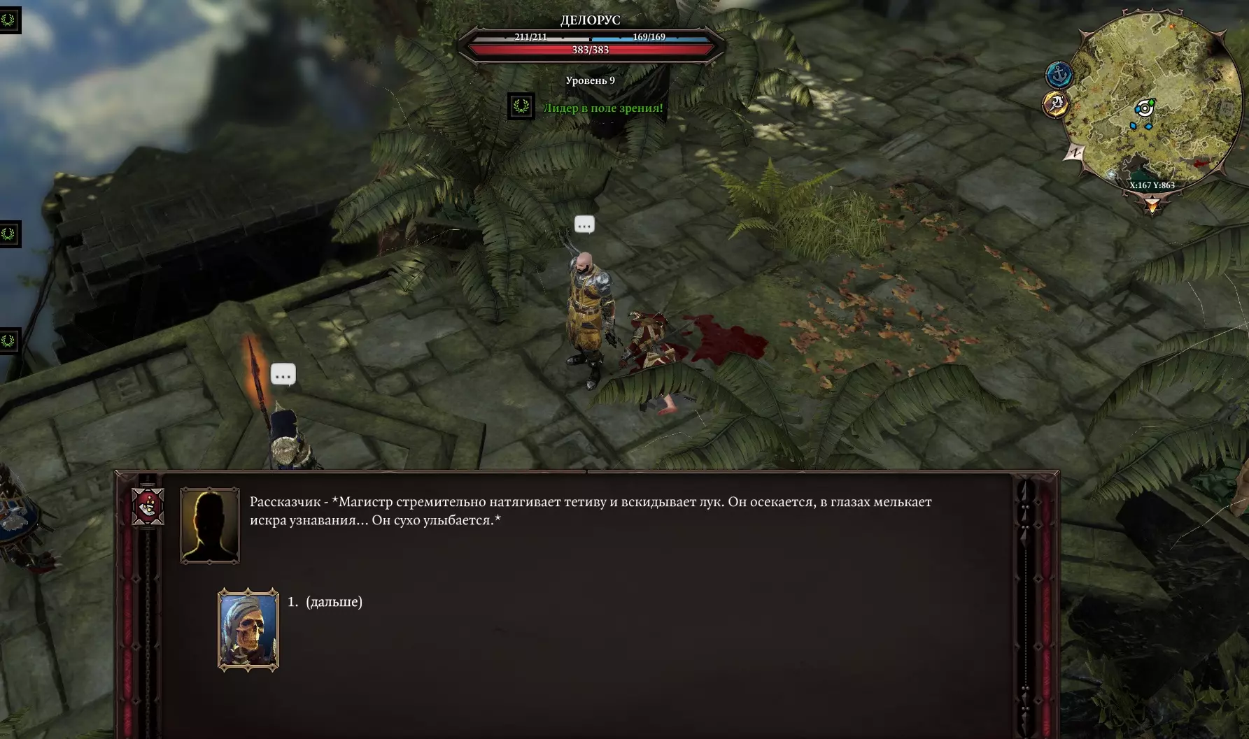 她身后有箱子和桶,还有一条有趣的通道。清理道路,清除毒潭,继续前进。屏幕上显示着一个独立的小岛,可以将其中一个同伴传送到那里。指示器上写着【莫迪之地。禁止成人入内!!!(英雄除外)】。不过我们可是英雄 ;) 去看看。 继续前进,与……青蛙们展开战斗 O_О 获胜后,在沉船旁边有一个宝箱,把它传送到近处,搜刮一下。我们走向洞穴出口。一个名叫“鲁拉”的精灵拦住了我们,原来他们一直在等我们去收拾那些青蛙,我们获得了感谢和经验。 就这样。 走出洞穴后,我们看到“戴恩”老头躺在旁边,他不愿意接受治疗,已经准备好迎接死亡,旁边还有一个名叫“莱斯特医生”的小矮人正在焦急地踱步。她解释说,不管她怎么劝说,戴恩老头就是不肯吃药。于是我们施展魔法,对老头释放了恢复术。他恢复过来后开始嘟囔:“你这人怎么回事?觉得自己最聪明是吧?”我们向他解释说他应该心怀感激,他便把一张名为“钻石”的游戏卡牌作为谢礼送给了我们。就在这时我灵光一闪!有了!我们跑去找那些赌徒,提出要和他们玩一局。亮出卡牌后,他们惊呼:“哦!你这张牌是从哪儿来的?” 如果我们回答“这不关你的事,赢了就是赢了”,他们就会给钱然后不再纠缠。说实话,如果我们说是从老头那里拿的,就会引发战斗。我们可以把他们卷进来获取经验。 如果我们说是格里夫给的,他会害怕这种关系,然后给钱。 血腥海斯特现在在多克托希-格诺米希的东边,能看到血迹和穿着闪亮盔甲的“米戈”大叔。他在胡言乱语,战斗开始。(虽然只有一个敌人,但相当难打)。击杀敌人后获取装备和戒指,现在可以将戒指交给一直在寻找它的法师。她没有轻信我们的话,会亲自前往战斗地点确认。 “如果给米戈带去他一直询问的草药,就能和他达成交易。到时候他会直接交出戒指,我们再把戒指交给法师。”——卢修斯 【竞技场“独一者”】补充说明:在格里夫厨房附近有一个通往地下室的活板门,下去后就能到达“独一者”竞技场。事情很简单——我们邀请你参与战斗,顺便说一下,这些战斗并不轻松,我们获胜,人们称赞我们,说我们团结一致。我们不断前进。 贫民窟的阴谋到此结束。 真有意思!