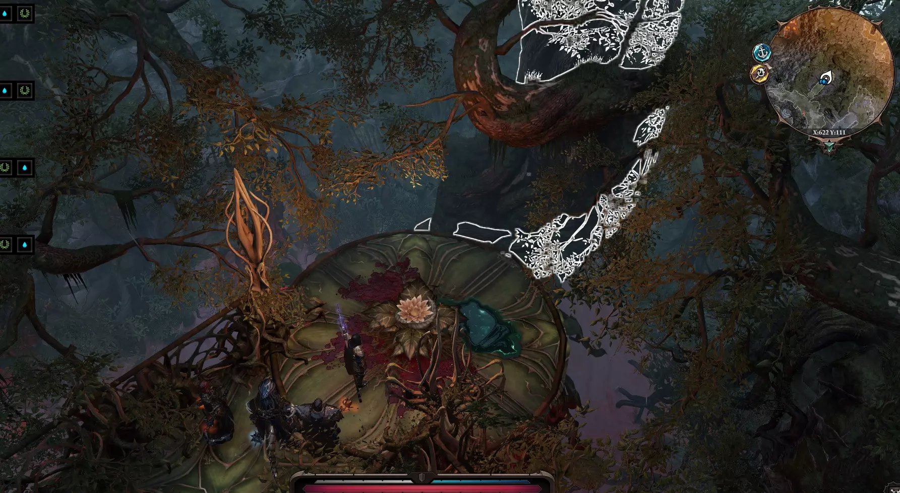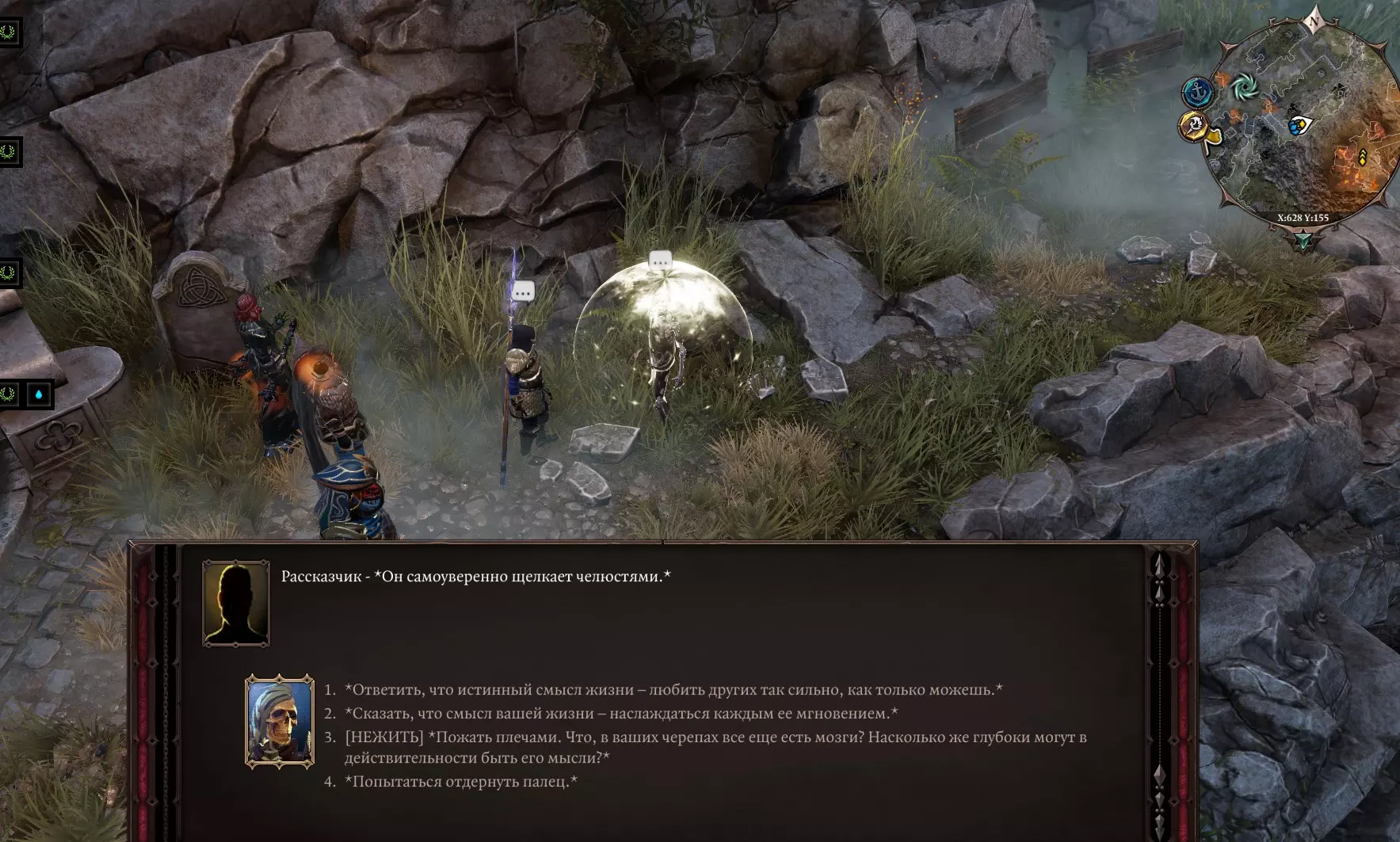 可以从右侧通过树枝爬上岩石,直接路过即可。 要点: 附近有一座毁坏的塔。根据声音可以判断有雷雨云,这意味着它可能会造成眩晕。传送卫星,然后趁着有魔法保护,快速搜索,之后沿着藤蔓跳下。 回到狗的位置。前往南侧通道,会遇到与4个骷髅的战斗。我们向他们发起进攻,现在再次向北走,从那只狗旁边经过,顺着藤蔓向上爬,会遇到一个名叫“塔琳”的女孩。她说前面的法师设下了某种陷阱,一击就杀死了她的朋友。 当被逼入绝境时极其危险。确实,在遗迹入口前的柱子上挂着一个“尖叫者”,它会攻击视野范围内的任何人。所以我们按下“S”键,变成灌木丛,悄悄地从它旁边经过。(我们可以从左边顺着藤蔓爬上去) 我们出现在战场之上,周围有法师和其他一些人。 关键机制: 与法师对话时,存在成功的说服选项,这些选项可以赶走多余的人,这样我们就能更有效地帮助被围困的圣骑士。 正确的说服选项: 就说你不是术士!你是法师的特工,正在渗透探索者组织。你是潜入到“追寻者”组织中的法师特工。 *告诉他们你很高兴他们在这里一切安好,因为你听说“追寻者”袭击了欢乐堡* 结果会有4-5名法师撤离,这样我们就能去救被包围的圣骑士了。(也可以不用说服,直接在这里把所有人都干掉)最有趣的是,其他4位法师对我们漠不关心,所以我们可以随意布置自己的同伴,挑选最强的角色发动群体攻击,以造成尽可能多的初始伤害。进入战斗——解救圣骑士【加雷特】。他说自己正在寻找离开这座岛屿的路——夺取法师们的船。他还提到可以在【阿玛迪圣所】找到他。 前往下方平台,那里有一扇金属门,进入其中。古老遗迹 我们来到地下室,中间躺着“桑格”大师,他说这些墙壁后面有某种邪恶之物,同时也守护着某种珍贵的东西。旁边有个拉杆,拉动的话门不会打开,反而会触发中毒效果。 在他身后,如果移动镜头,可以看到一个墓室,里面存放着布拉卡国王祭坛。不过目前我们在这里什么也做不了,需要寻找能打开这扇门的东西。我们探索着废墟,从南部区域离开,沿着残骸向东北方向前进。北边再往前有一座坍塌的桥,没什么特别的。继续向东走,我们遇到了盲眼导师,试图解释我们没有恶意,却还是陷入了战斗。再往东走,我们碰到了一只小熊,它正在寻找妈妈。我们告诉它,它的妈妈可能已经遇害了。(或许在对话中可以加入一个类似“寻找熊妈妈”的任务。)无法识别内容,已删除。