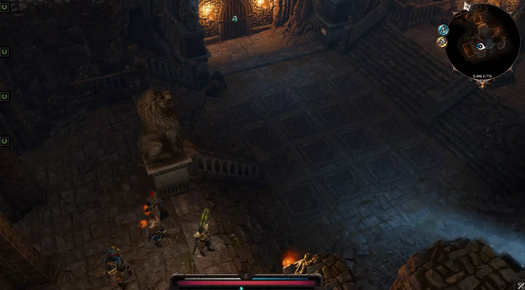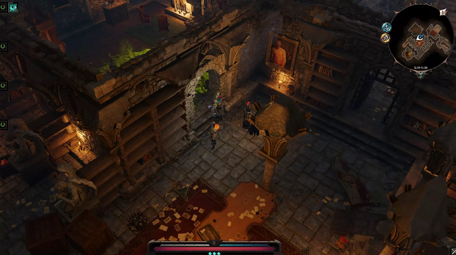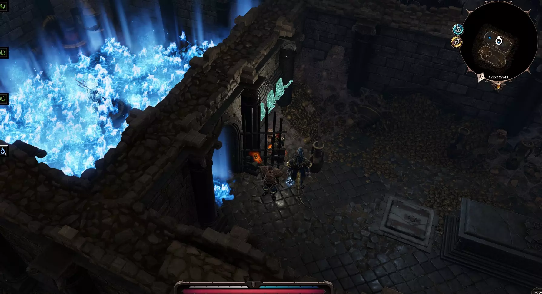 在地下室的尽头有一个瀑布,远处还有一片土地。可以用一个角色传送到那里,然后点击水桶。我们会出现在莱克尔家后面。 另一种方法:沿着地下室继续前进,跳过栅栏,然后爬上楼梯。我们会到达那座位于移动桥附近的小房子。消灭所有虚空造物。放下桥。任务【他们过不去】完成。可以回到地下室,正常打开所有的门,传送回乌龟和老鼠那里。我们还没有搜查莱克的房子二楼。 二楼有两个房间,都锁着,旁边有守卫。左边房间旁边有一幅活画,它身上有钥匙,但如果我们搜查它,它会发出警报。这个稍后再做,先离开房子。 从客厅出去,与亡灵巫师狗战斗。旁边有一个拉杆和通往地窖的入口。我在那里没发现什么有趣的东西。雕像可以用祝福摧毁。如果打开棺材,角色会石化。