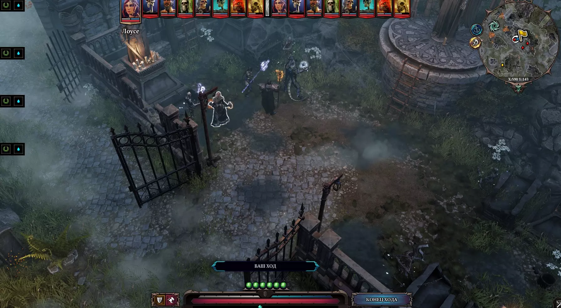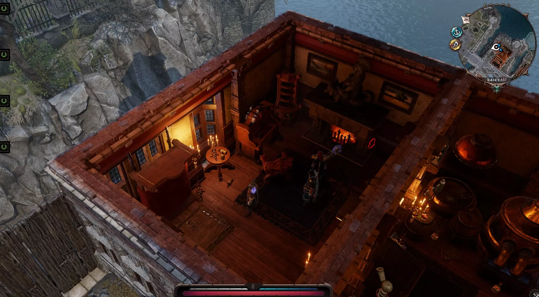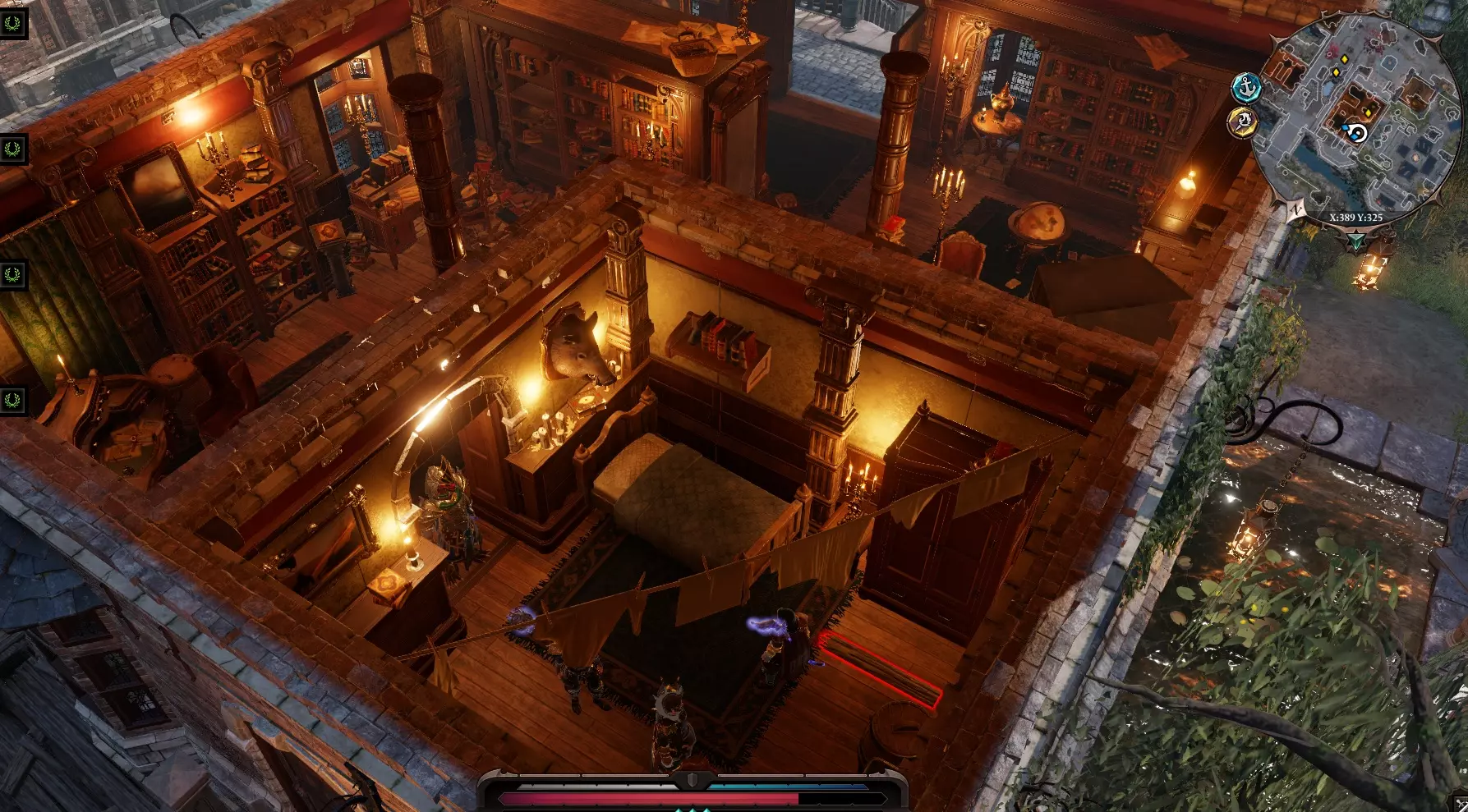 在地下室的尽头有一个瀑布,远处还有一片土地。可以用一个角色传送到那里,然后点击水桶。我们会出现在莱克尔家后面。 另一种方法:沿着地下室继续前进,跳过栅栏,然后爬上楼梯。我们会到达那座位于移动桥附近的小房子。消灭所有虚空造物。放下桥。任务【他们过不去】完成。可以回到地下室,正常打开所有的门,传送回乌龟和老鼠那里。我们还没有搜查莱克的房子二楼。 二楼有两个房间,都锁着,旁边有守卫。左边房间旁边有一幅活画,它身上有钥匙,但如果我们搜查它,它会发出警报。这个稍后再做,先离开房子。 从客厅出去,与亡灵巫师狗战斗。旁边有一个拉杆和通往地窖的入口。我在那里没发现什么有趣的东西。雕像可以用祝福摧毁。如果打开棺材,角色会石化。