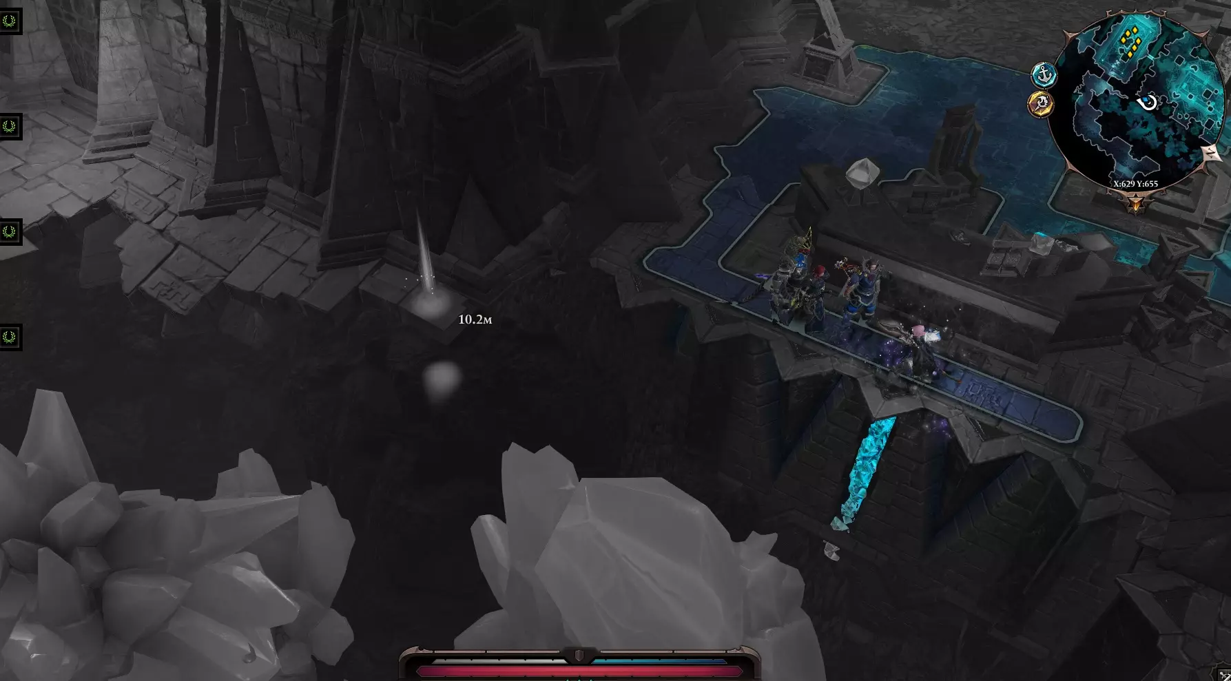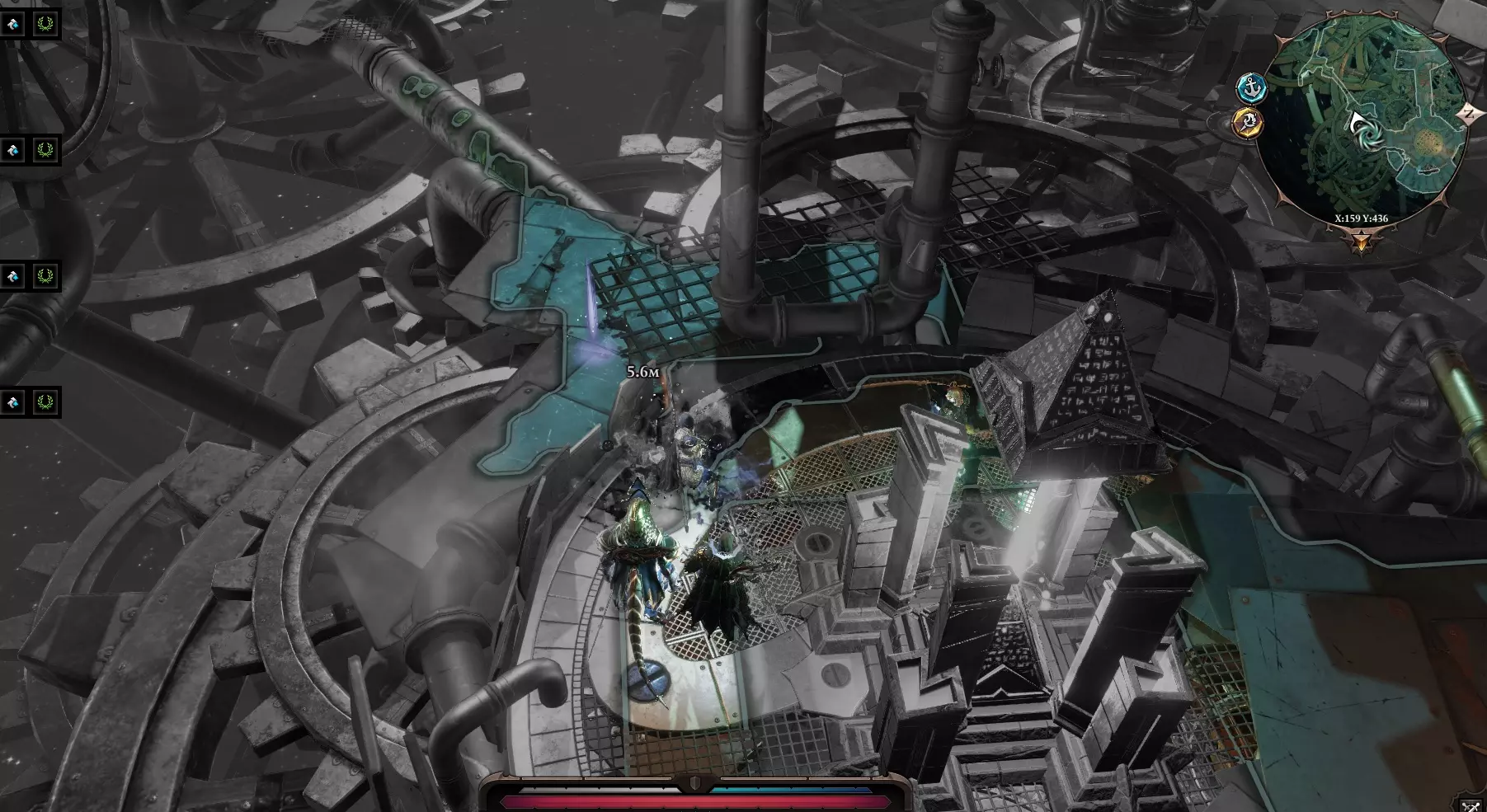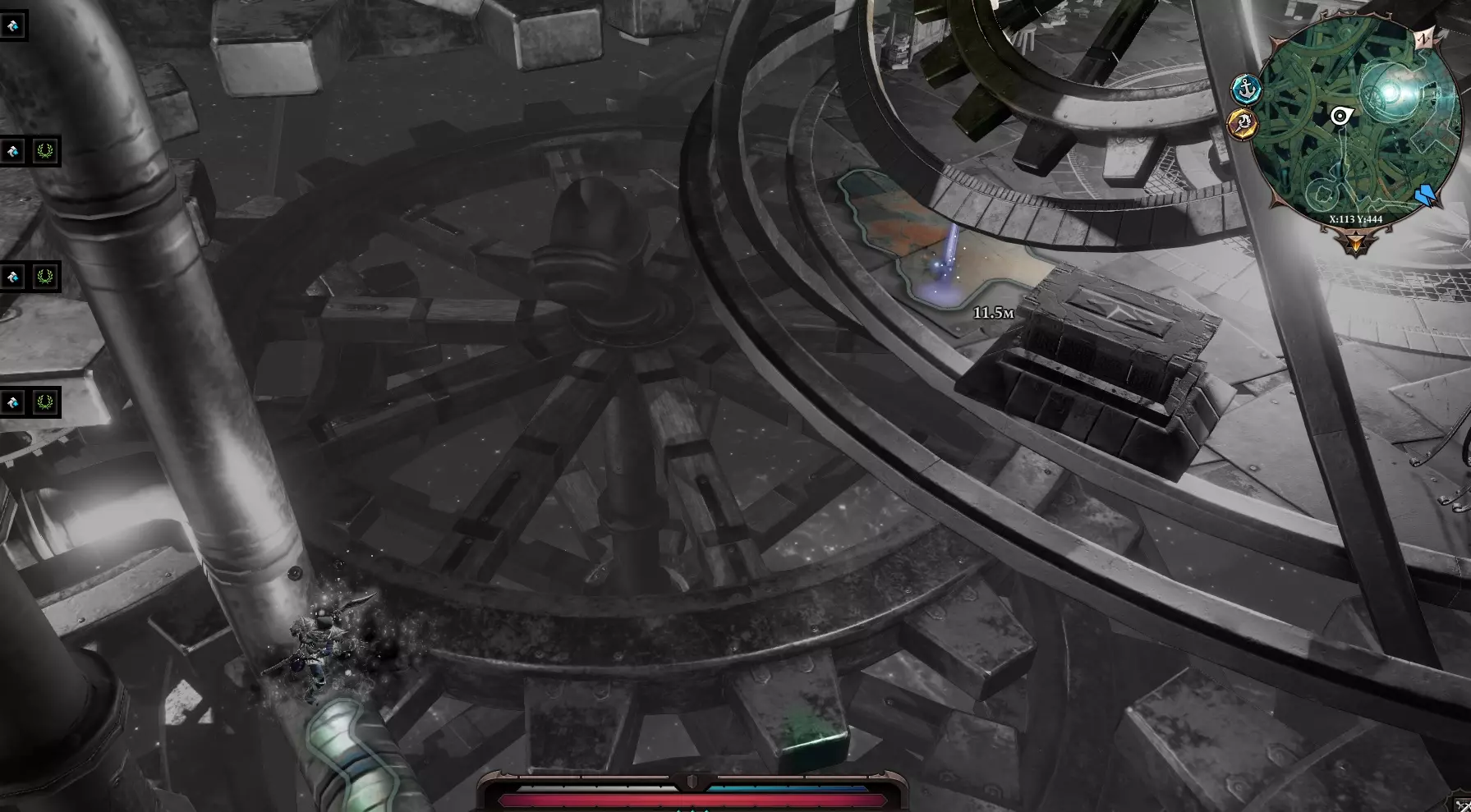 与石头交谈后,我们进入了一个神秘的世界。 (这个世界的场景制作极为精良,搭配神秘的音乐,营造出一种类似钟表机械的独特氛围。) 在这个世界里,时间流逝得非常缓慢。 第一个房间中,我们需要将沉重的箱子放到压力板上。 接下来的走廊里有几扇门,若拥有较高技能可以破解门锁,或者直接传送至门后。 使用【幽灵视觉】,从幽灵那里了解它的死亡原因。在大房间内设有毒陷阱。如果有骷髅,就可以轻松通过,或者也可以传送。 在上层房间转动【超级活性协议】阀门——这会加快移动速度。(必须操作) 在西北方向有【紧急冲洗】阀门——会使整个区域充满死亡迷雾。 在西南侧有核心,一旦开始靠近,就会激活清除程序。这里的关键是尽快靠近核心并点击它。使用赞特茨祭坛然后离开。【秘密】