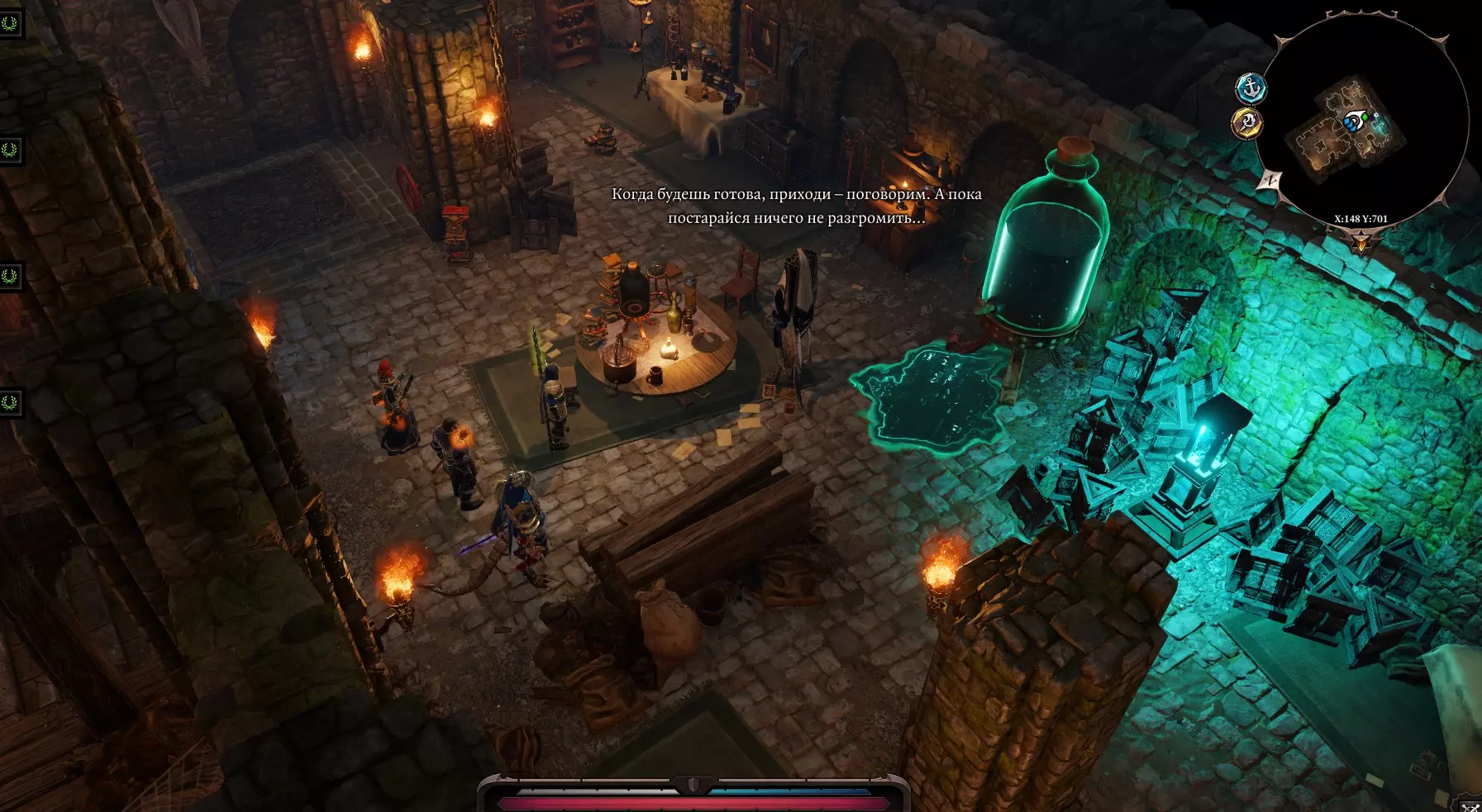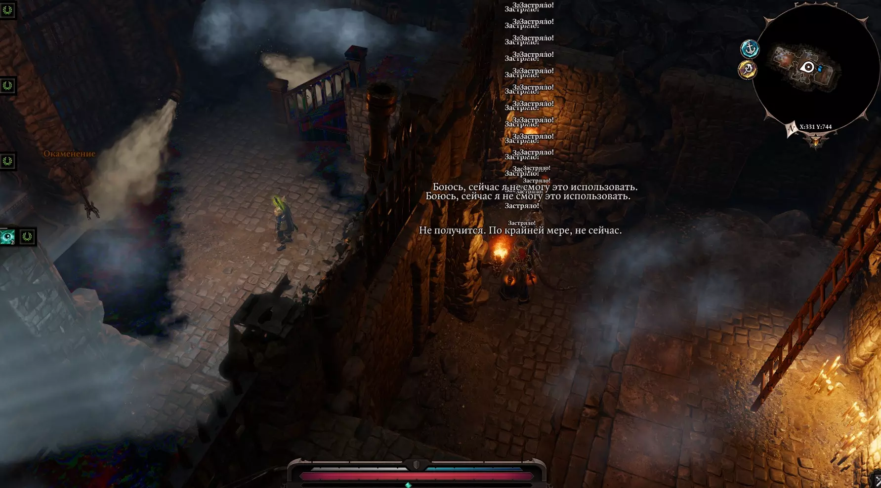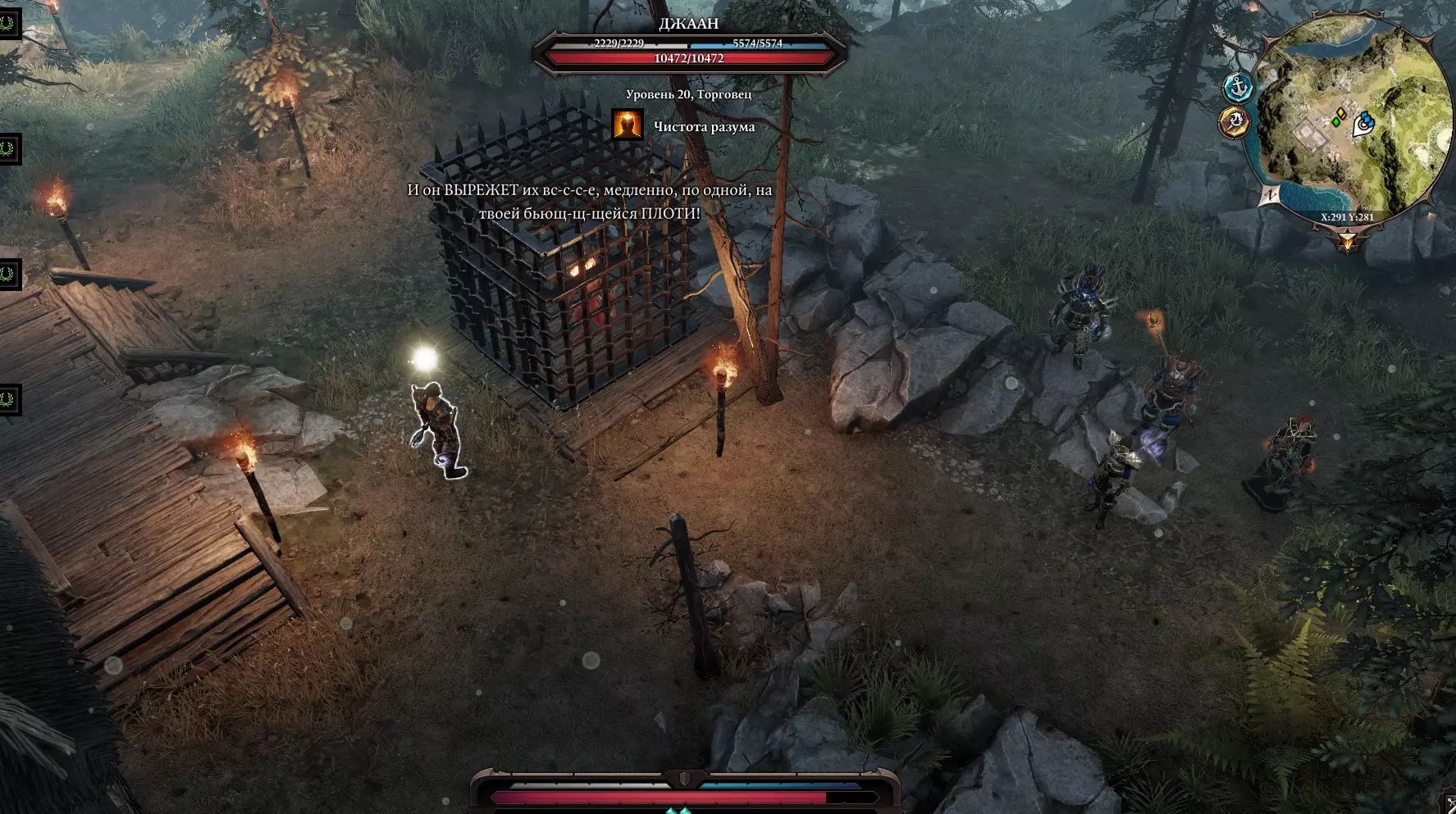 我们来到兵器库,角色说了句“或许该去打扰他一下?”(开玩笑的),然后打开了门。 啊,是些小雕像,还有一个刻着我们看不懂的文字的祭坛,所以我们打不开它。 回到之前遇到虚空居民的地方,继续穿过那些建筑,来到一个有燃烧猪跑来跑去的广场。这些燃烧猪碰到任何东西都会引爆周围,但它们自己却没事。我们得想办法证明自己是和平而来的。技巧: 对每只小猪使用新技能【祝福】,能获得大量经验和好感度。 给所有小猪施加增益后,会出现名为斯卡波尔的【蜥蜴骷髅】。进入战斗,打断它的骨尾。 现在我们可以对看到的所有东西使用【祝福】,效果非常有趣。对毒药使用会使其恢复生命,对水使用会恢复生命,对油使用会获得【强化】效果,还可以对血液、腐烂物等使用。向西走,经过有猪的草地,与亡灵战斗,回到有商人“扎莱斯卡”的桥边。前往寻觅者营地(路线是穿过沼泽南部,沿着西岸向东走)。跑过去,会看到管道和血泊(从 torture chamber 延伸出的隧道),路过毒洋葱(可以对它们使用祝福),在废墟附近遭遇寄生虫的埋伏,将其击败。岔路 北方之路:通往我们与虚空居民相遇的地方。