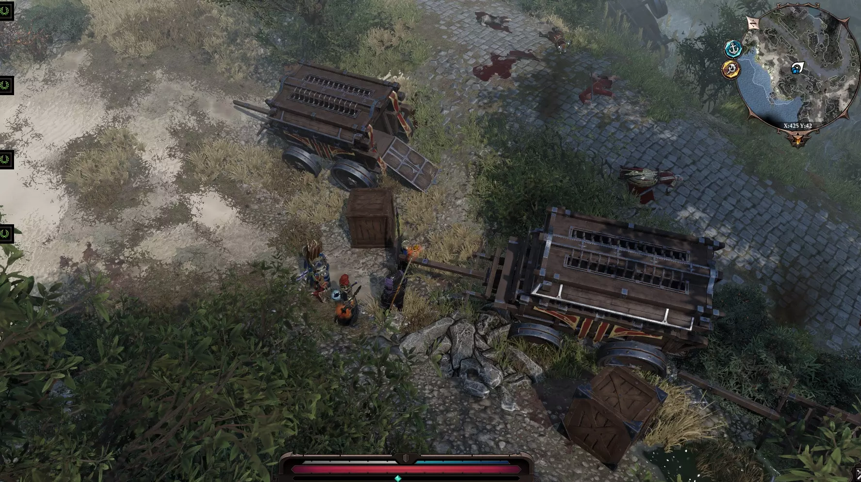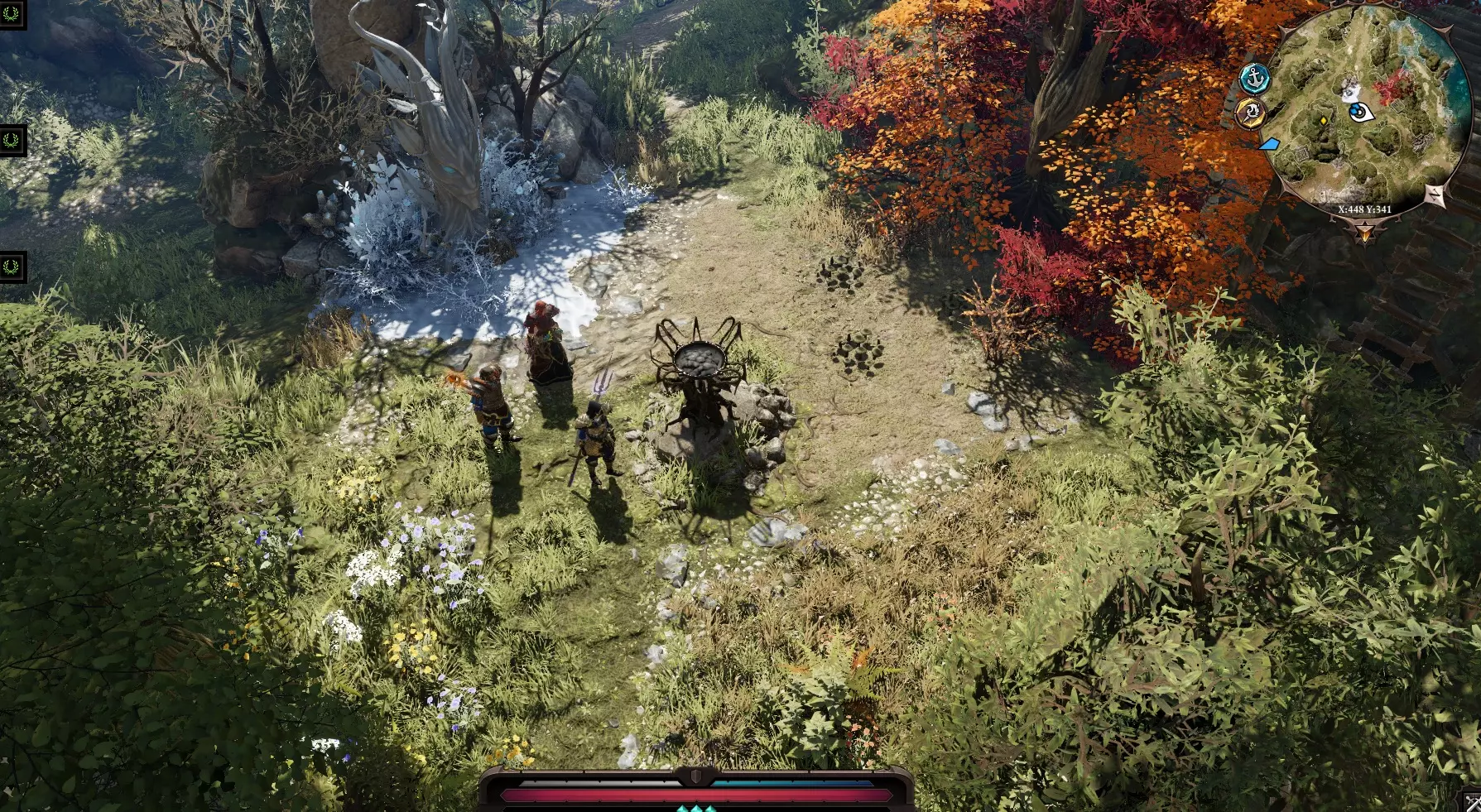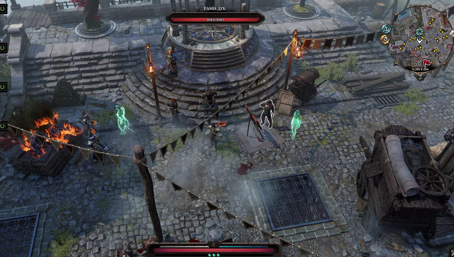 我们来到兵器库,角色说了句“或许该去打扰他一下?”(开玩笑的),然后打开了门。 啊,是些小雕像,还有一个刻着我们看不懂的文字的祭坛,所以我们打不开它。 回到之前遇到虚空居民的地方,继续穿过那些建筑,来到一个有燃烧猪跑来跑去的广场。这些燃烧猪碰到任何东西都会引爆周围,但它们自己却没事。我们得想办法证明自己是和平而来的。技巧: 对每只小猪使用新技能【祝福】,能获得大量经验和好感度。 给所有小猪施加增益后,会出现名为斯卡波尔的【蜥蜴骷髅】。进入战斗,打断它的骨尾。 现在我们可以对看到的所有东西使用【祝福】,效果非常有趣。对毒药使用会使其恢复生命,对水使用会恢复生命,对油使用会获得【强化】效果,还可以对血液、腐烂物等使用。向西走,经过有猪的草地,与亡灵战斗,回到有商人“扎莱斯卡”的桥边。前往寻觅者营地(路线是穿过沼泽南部,沿着西岸向东走)。跑过去,会看到管道和血泊(从 torture chamber 延伸出的隧道),路过毒洋葱(可以对它们使用祝福),在废墟附近遭遇寄生虫的埋伏,将其击败。岔路 北方之路:通往我们与虚空居民相遇的地方。