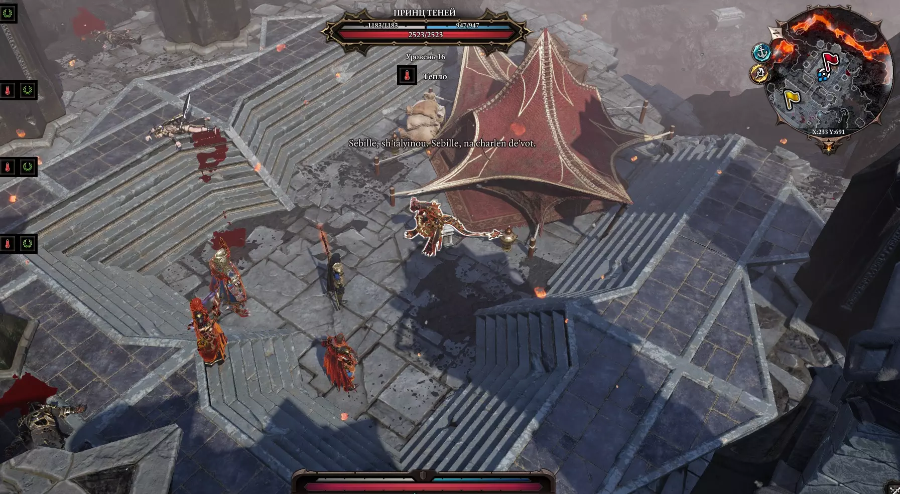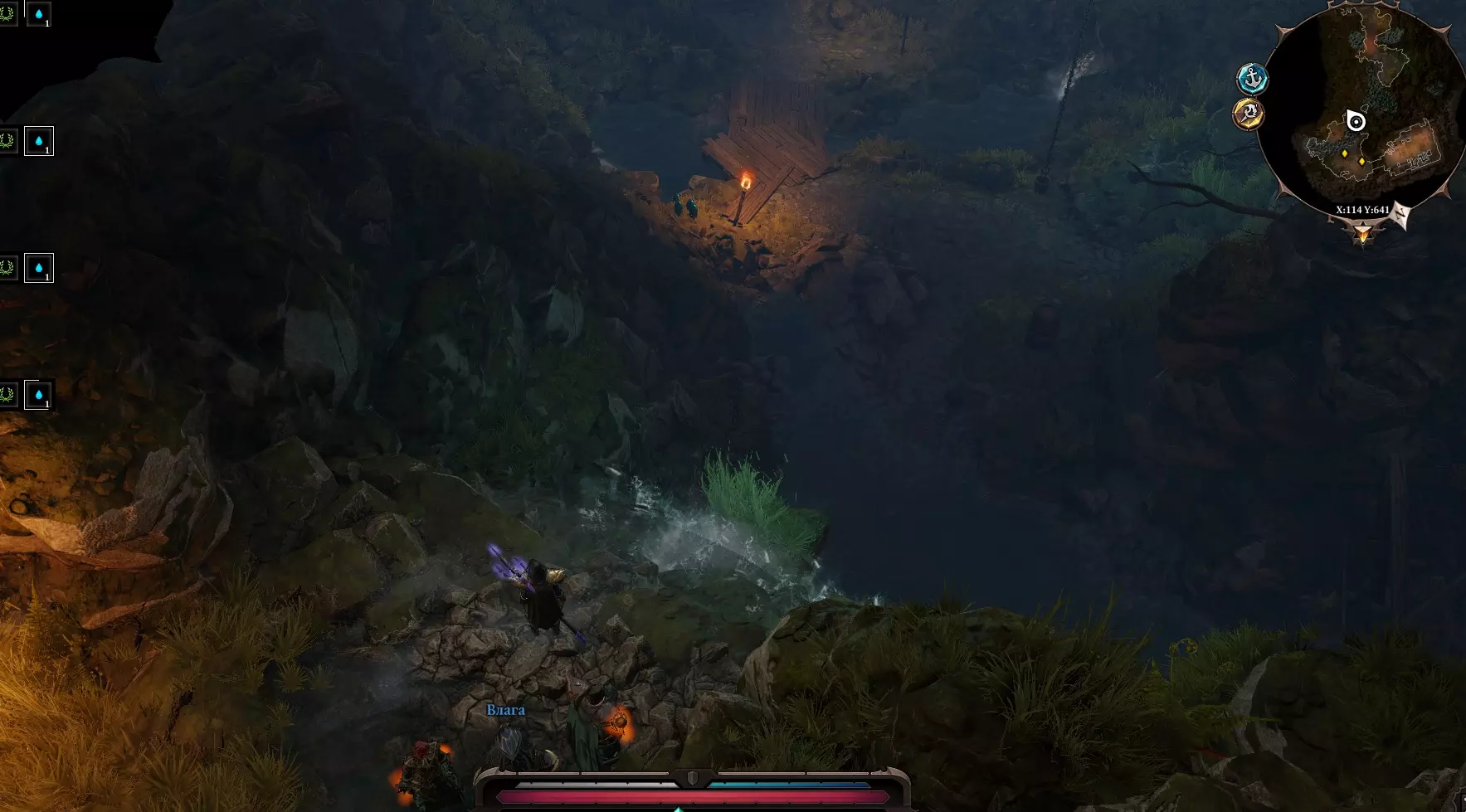 继续前进到悬崖边,悬崖左侧有藤蔓,一直走直到遇到巨龙。 巨龙旁边有法师,他们会协助巨龙。 巨龙本身会定期改变位置。(建议分散队伍) 悬崖附近有一座房子,我们跳过去。 那里有阿尔米拉和米卡尔两个人。她请求帮助——逃离这里。我们邀请他们到我们的船上。阿尔米拉的请求 阿尔米拉请我们找到那枚符石。如果交出符石,我们将获得“征服者”戒指——技能“心灵奴役”。 血月岛 有几种方法可以到达那里。我选择了船夫。 让整个队伍留在岸边,控制一个角色游过去,然后让其他人使用金字塔传送。 恶魔律师 恶魔律师定居在南岸。在他旁边可以看到侏儒和“疾病”的对话。