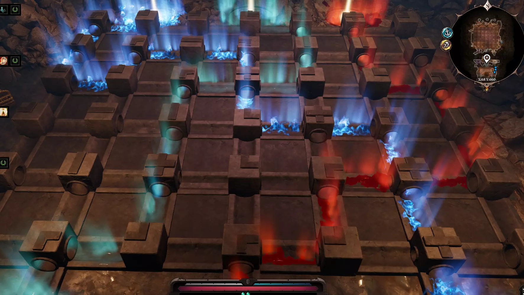 终于在最底层找到了被囚禁的阿尔胡领主。使用【通灵术】。可以看到灵体。需要消灭它们,但如果阿尔胡的生命值很低,建议治疗他。接下来是黑环的追随者以及林德尔·凯姆本人。如果想保住阿尔胡的性命,这场战斗会非常困难。建议将他传送到房间角落并对其使用【恢复】,战斗前还需部署队伍:法师附近各安排一人,近战单位所在的下方区域安排两人。 在西北方向有一座燃烧着【亡灵之火】的【蝎子领事馆】。 我们需要穿过火焰,与亡灵敌人战斗。(需要清除场上所有的【亡灵之火】,否则死者将会复活) 在走廊的尽头使用【通灵术】,进入传送门。 传送门后会出现敌人的幻象。(需要摧毁镜子) 接下来前往【沙漠】,在这里与【布拉莫斯】对话,然后找到【萨杜公主】。 她表示自己向【神王】许下了誓言。如果拥有【救赎者之镰】,可以将其交给她。作为交换,她会给你一枚蛋,你可以对这枚蛋使用【龙之火焰】,然后小龙就会孵化出来。之后会获得【召唤小龙】的能力。 紧急任务:从中央广场向北跑到大教堂。 右侧房间里有阿尔胡领主的住所。如果我们救了他,还可以再和他对话。 阳台上有一个猫用垫子,旁边可以捡到狗用球。在西侧房间里,我们可以找到那条狗,它会告诉我们林德·凯姆是故意把它的球扔进阿尔库房间的。 血之路 首先,进入北侧房间。 在左侧找到一个按钮,按钮上方有一个孔。将充能护符插入凹槽,然后念出咒语。 水下稍低处会出现一个舱口。进入舱口。 卢西恩的陵墓