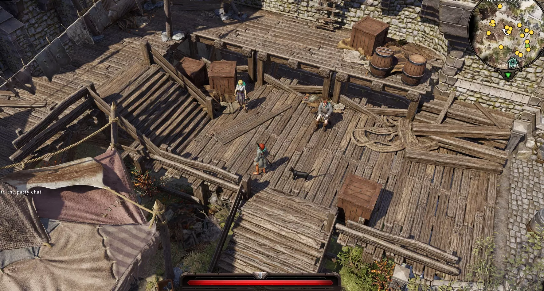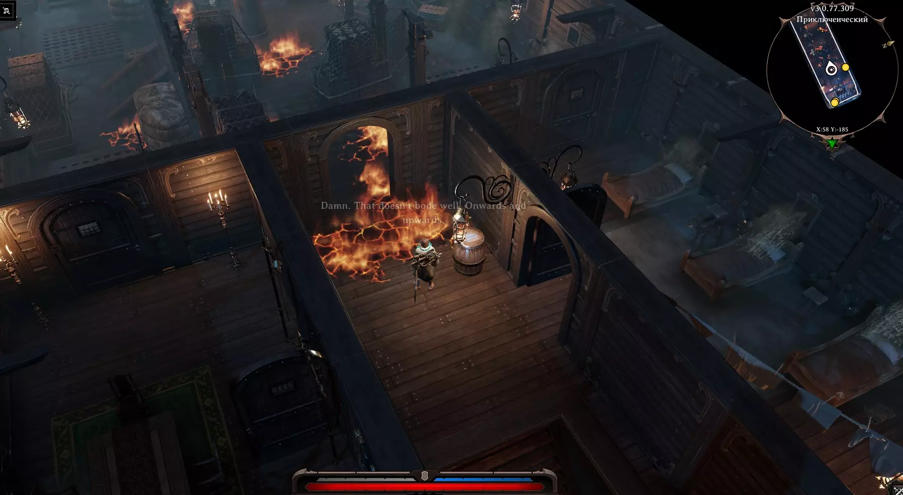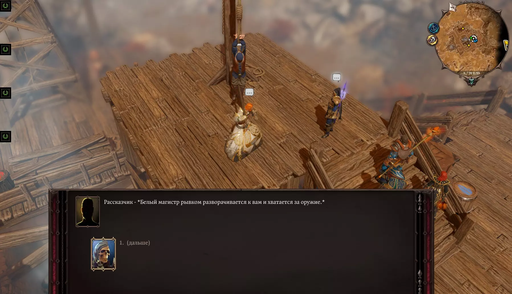 在房间右侧可以看到一只“大师之犬”。(如果创建角色时选择了“动物之友”,就可以和它对话)。旁边是一扇锁着的门。 房间左侧可以进行搜索,通往同一房间的门是锁着的,打开通往“大房间”的门。左侧有继续前进的通道,中间是“骷髅之门”,右侧有通道但被火焰阻挡,拿起水桶,泼向火焰,火焰熄灭后通过。我们搜查了法师的尸体,找到了一把刻有骷髅头的钥匙(嗯,这是为什么呢)。 当然,我们跑去打开了船长之门(骷髅头),一进去,触须就闯了进来,打破了木桶,制造出“死亡烟雾”。真可惜,我们离开了。 我们走向左边的门,沿着楼梯向上走。 船的甲板:在甲板上,我们看到船彻底乱套了,必须赶紧离开这里。我们干掉了几只蟑螂。对面有一艘救命的小艇。小矮人在小船上哭着请求回去看看是否还有其他人留下。我们返回下去。 进入主房间,看到蟑螂在作乱,还有我们所有未来的盟友。帮助他们击退蟑螂,让所有人上去。我们跟着他们跑。