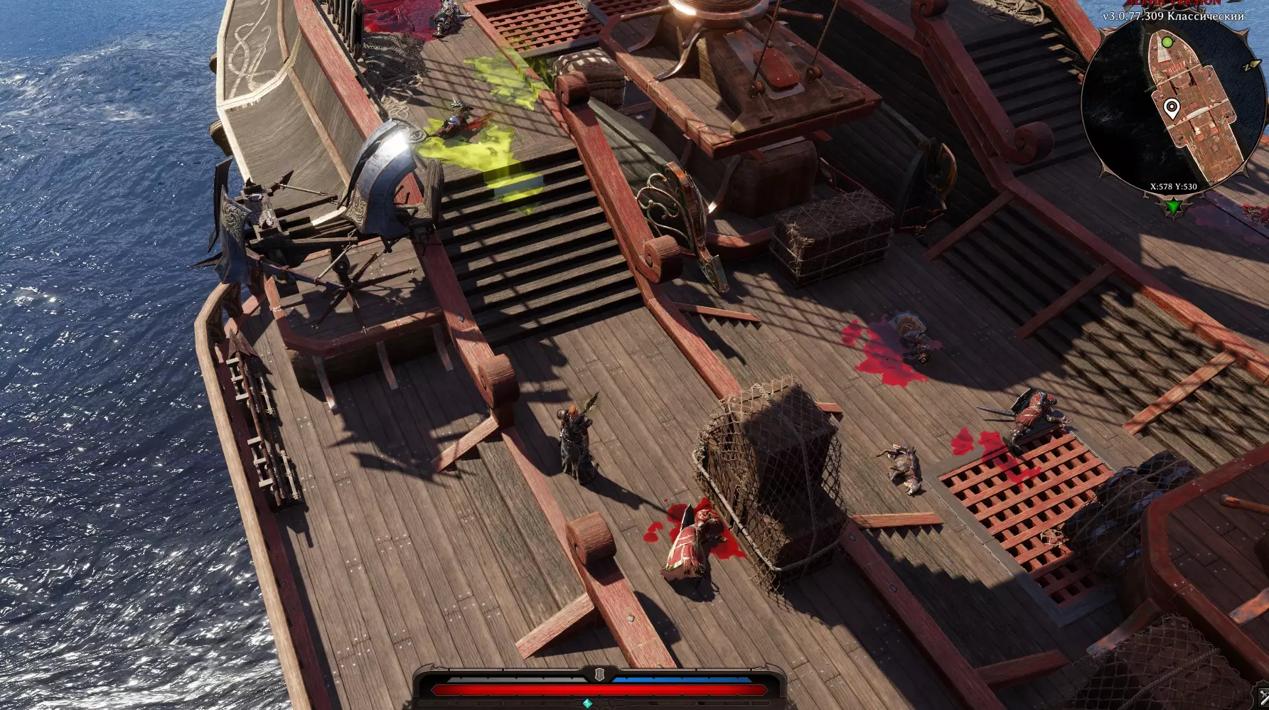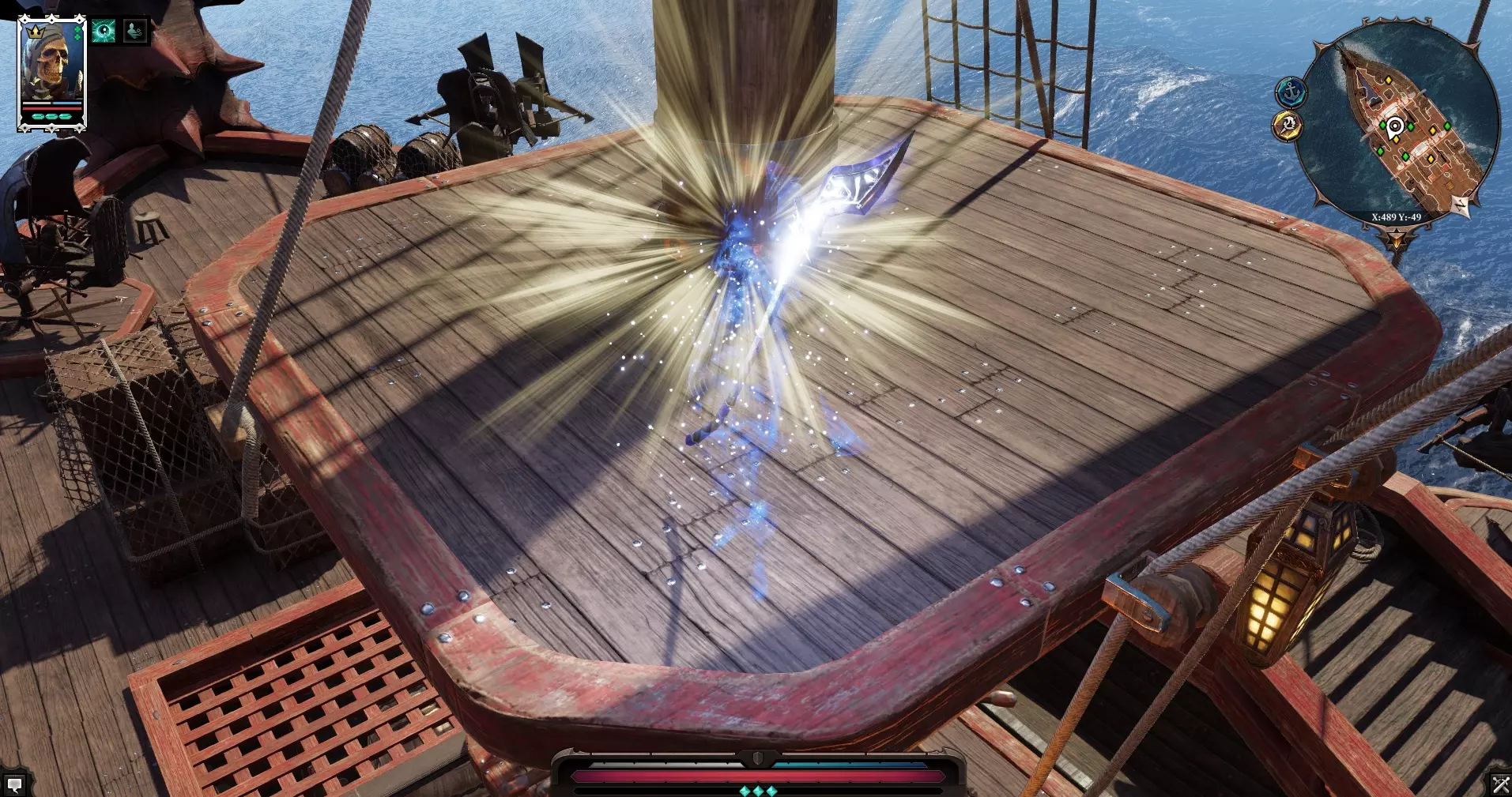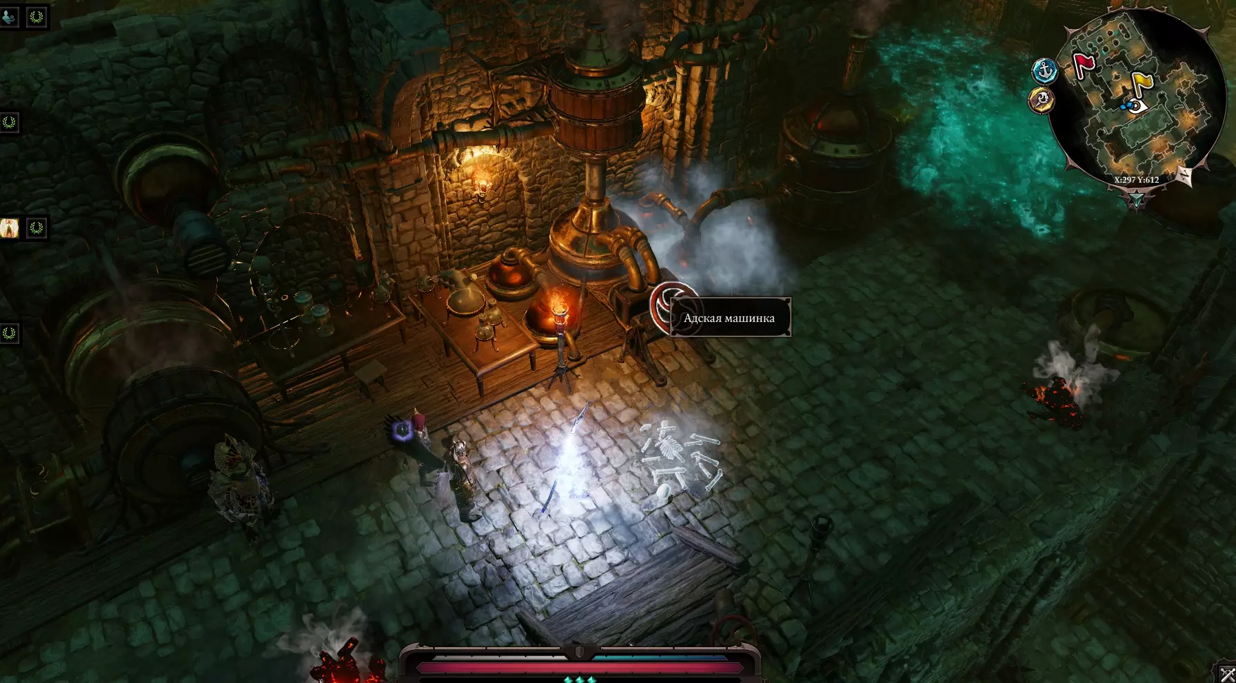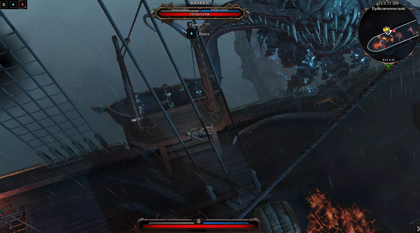 在房间右侧可以看到一只“大师之犬”。(如果创建角色时选择了“动物之友”,就可以和它对话)。旁边是一扇锁着的门。 房间左侧可以进行搜索,通往同一房间的门是锁着的,打开通往“大房间”的门。左侧有继续前进的通道,中间是“骷髅之门”,右侧有通道但被火焰阻挡,拿起水桶,泼向火焰,火焰熄灭后通过。我们搜查了法师的尸体,找到了一把刻有骷髅头的钥匙(嗯,这是为什么呢)。 当然,我们跑去打开了船长之门(骷髅头),一进去,触须就闯了进来,打破了木桶,制造出“死亡烟雾”。真可惜,我们离开了。 我们走向左边的门,沿着楼梯向上走。 船的甲板:在甲板上,我们看到船彻底乱套了,必须赶紧离开这里。我们干掉了几只蟑螂。对面有一艘救命的小艇。小矮人在小船上哭着请求回去看看是否还有其他人留下。我们返回下去。 进入主房间,看到蟑螂在作乱,还有我们所有未来的盟友。帮助他们击退蟑螂,让所有人上去。我们跟着他们跑。