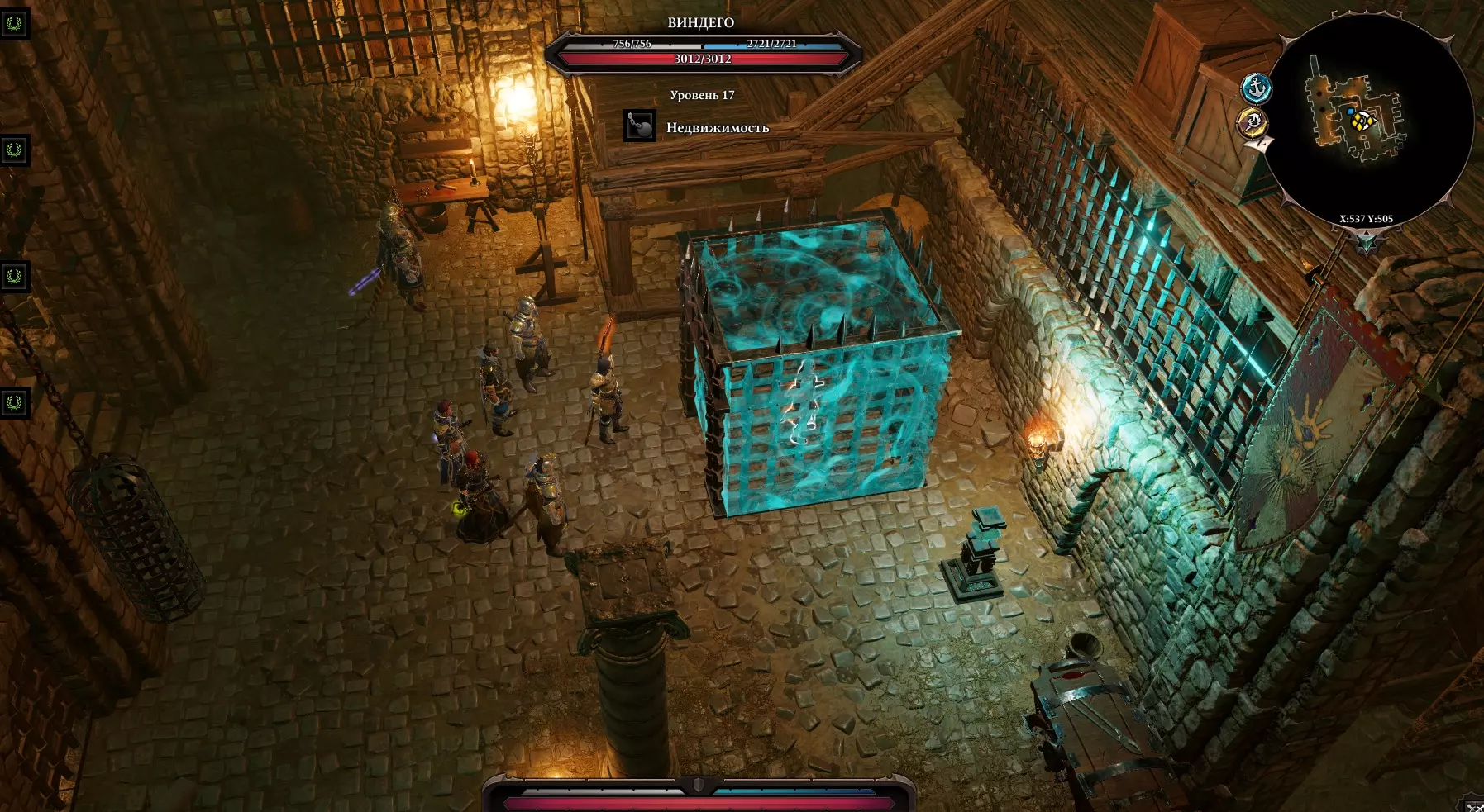 在东边,我们看到法师们正准备屠杀整个家族。我们介入处决过程,救下了这个家族。母亲请求我们救救她的侄子,他即将被吊死在石油塔上。在家族的稍南边,我们捡到了一把油腻的钥匙。进入小矮人旁边的房子,下到地下室,进入第二个房间,然后上楼。