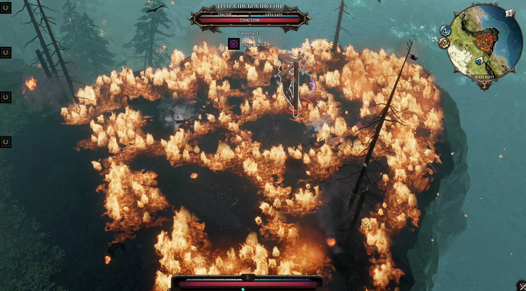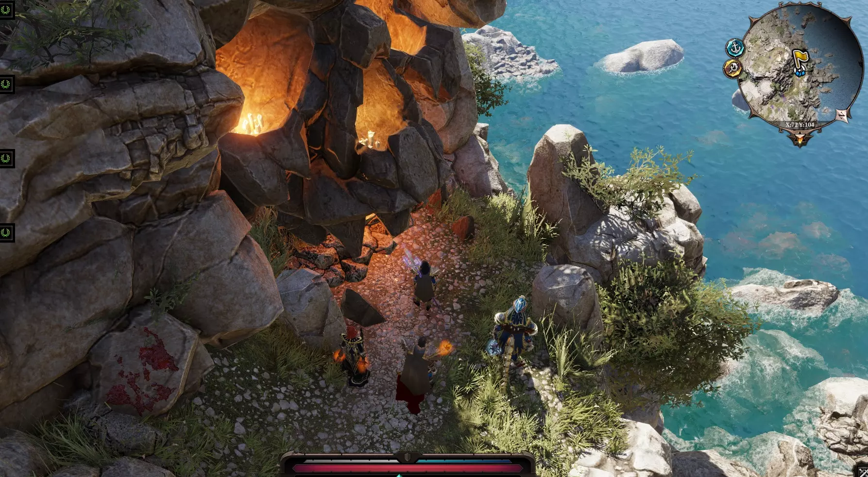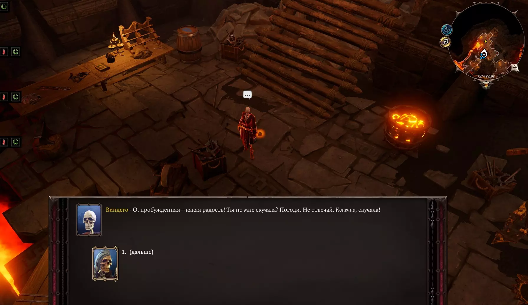在悬崖边,我们遇到了……嗯……骷髅“扎莱斯卡”。它告诉我们,有一些和我们相似的巫师。我们做好准备,前往北海岸。在海岸上,我们看到了法师的尸体,还有一只试图唤醒死去主人的狗。我们告诉它主人已经死了,它却想攻击我们。我们努力让它相信我们是朋友。左边是 pyro法师“温迪戈”,它说这里发生了不好的事情。(真的假的?)继续沿着海岸搜寻,朝着东北方向沿海前进。