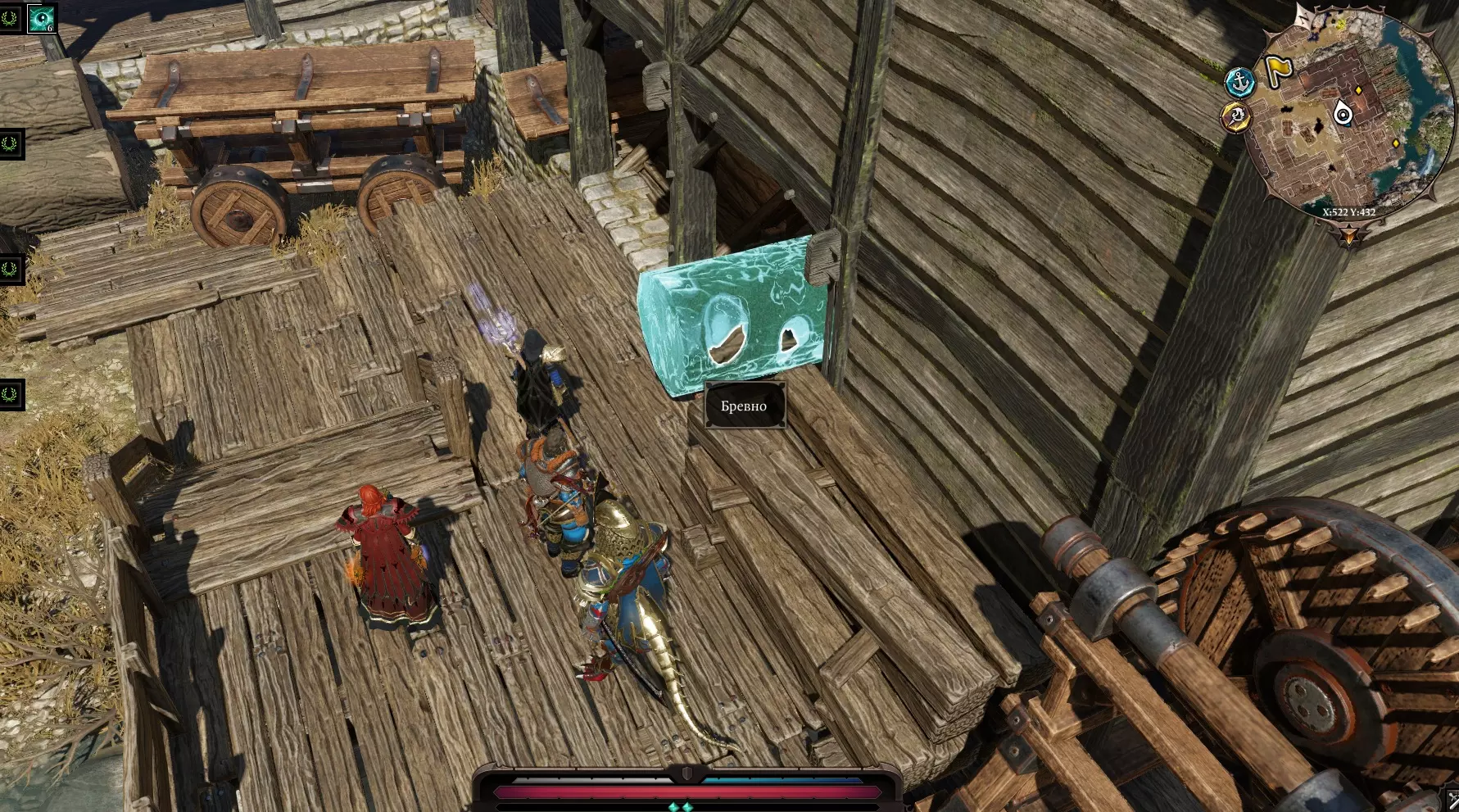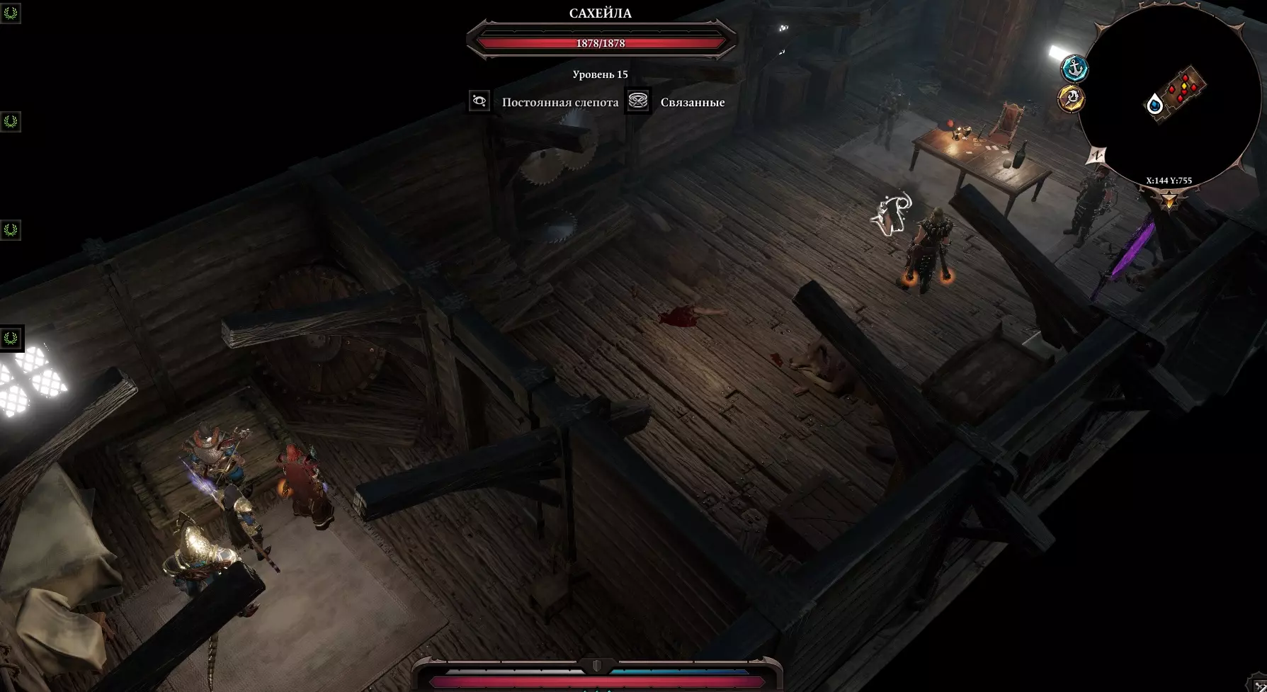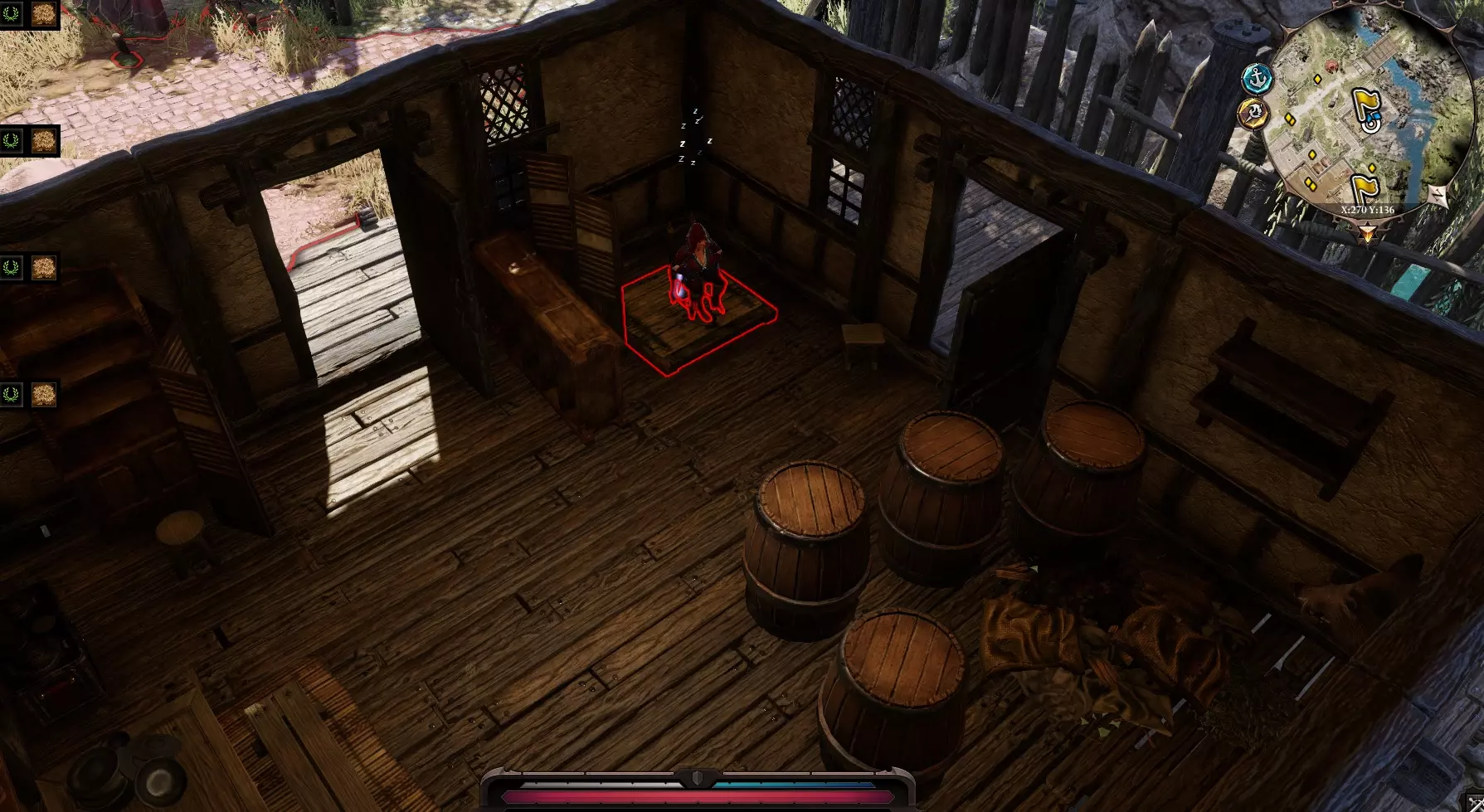 我们看到舱口上坐着一个睡着的法师。我实在没别的办法,就直接把他解决了 :) 下去后,看到两个囚犯,走进那里,在箱子后面找到一个书架,里面有一封信,需要交给洛哈鲁。 【自由的滋味】