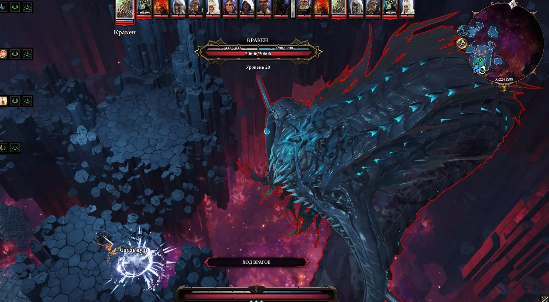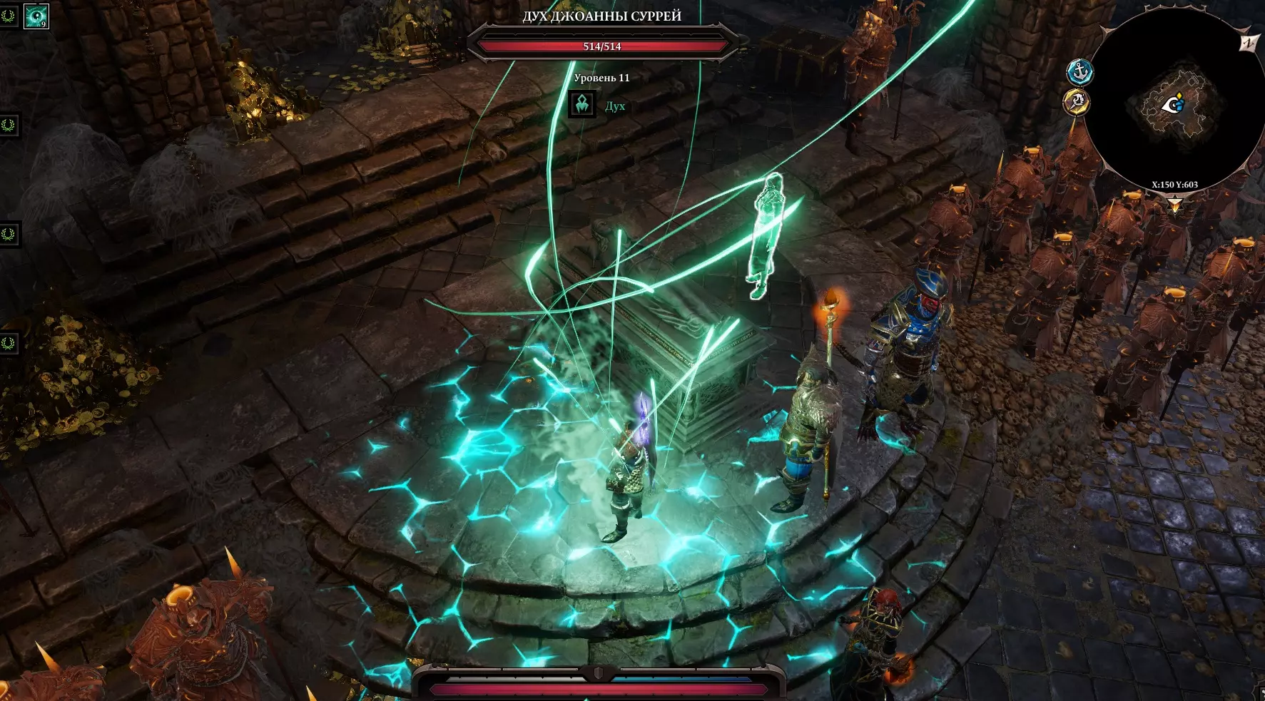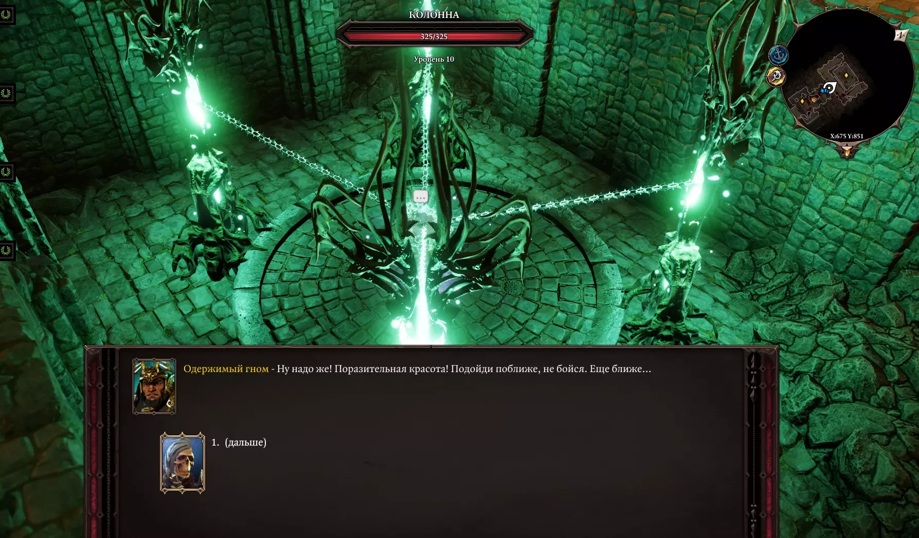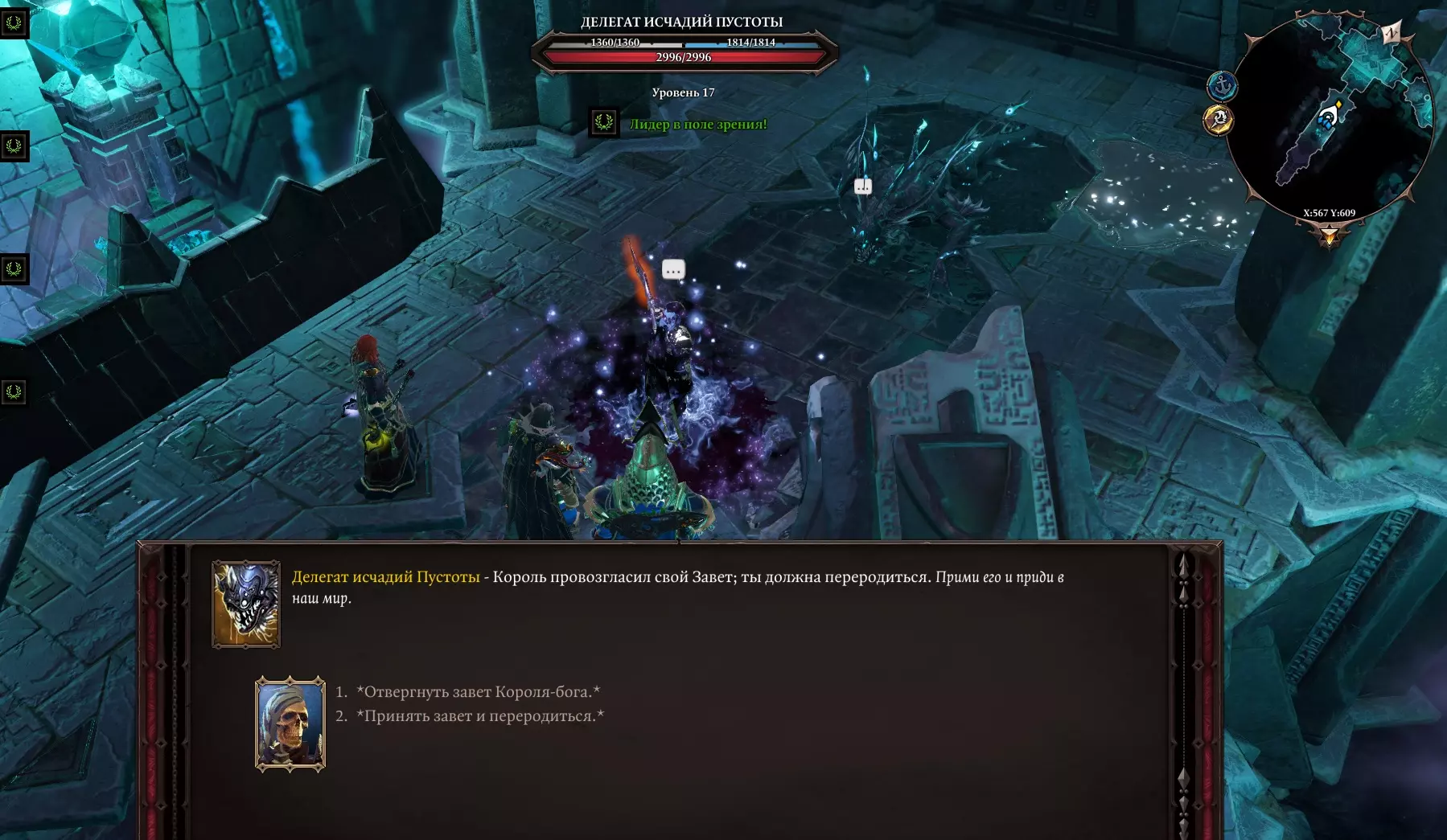我们一旦下去,所有我们曾经帮助过的人都会加入我们:塔金、加雷特、阿尔米拉,当然还有霍里。 在王座下方,我们可以看到神圣的卢西安、身披斗篷的身影(布拉科国王),以及达利斯本人。 接下来会有一段非常漫长且有趣的对话(我不会剧透,尽管很想)。 达利斯和卢西安会劝说你把你的全部本源交给他们。 如果你向神王许下了誓言,他会要求你把他们全部杀掉。(一人对抗所有人,包括自己人) 如果拒绝,他会杀死我们的角色,之后就没有任何进展了。 不过如果开始攻击达利斯,布拉科国王就会苏醒,战斗随即开始。 场景会切换到回响殿堂,并且会出现克拉肯。届时必须三人合力战斗。 总之,我建议在战斗前使用“救赎者”镰刀,以解除与巫妖国王兼神王的誓言。