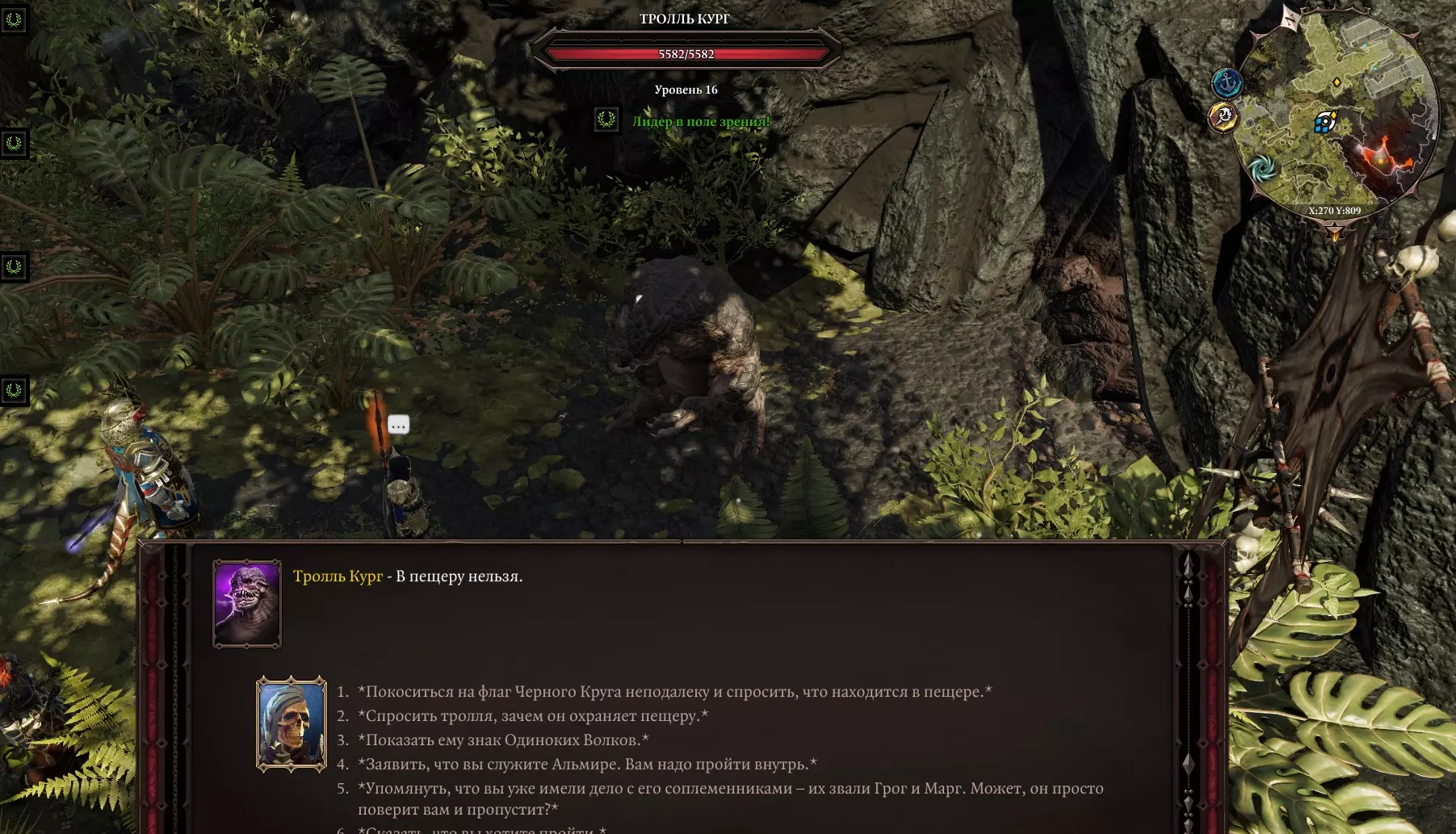 营地东北方向不远处有一个洞穴,由巨魔库尔格看守。 根本无法说服他。 几乎不可能和他战斗。 但是,可以把他传送到旁边的熔岩里。 等等。可以说服他。为此需要使用所有对话选项,当出现说服选项时,必须回答: 感知:声称你是来维护他的利益的:每天一袋肉对这样的帅哥来说显然不够。如果他放你过去,你要确保他每天能拿到两个袋子。最后他会放你过去的。