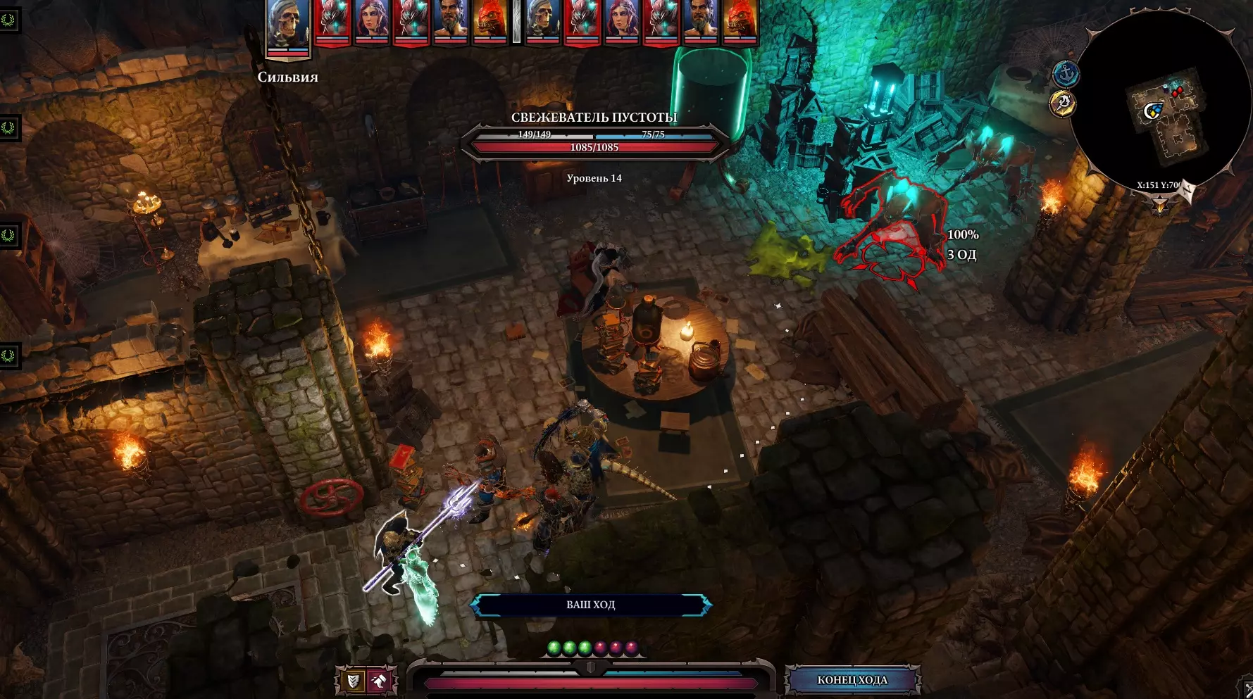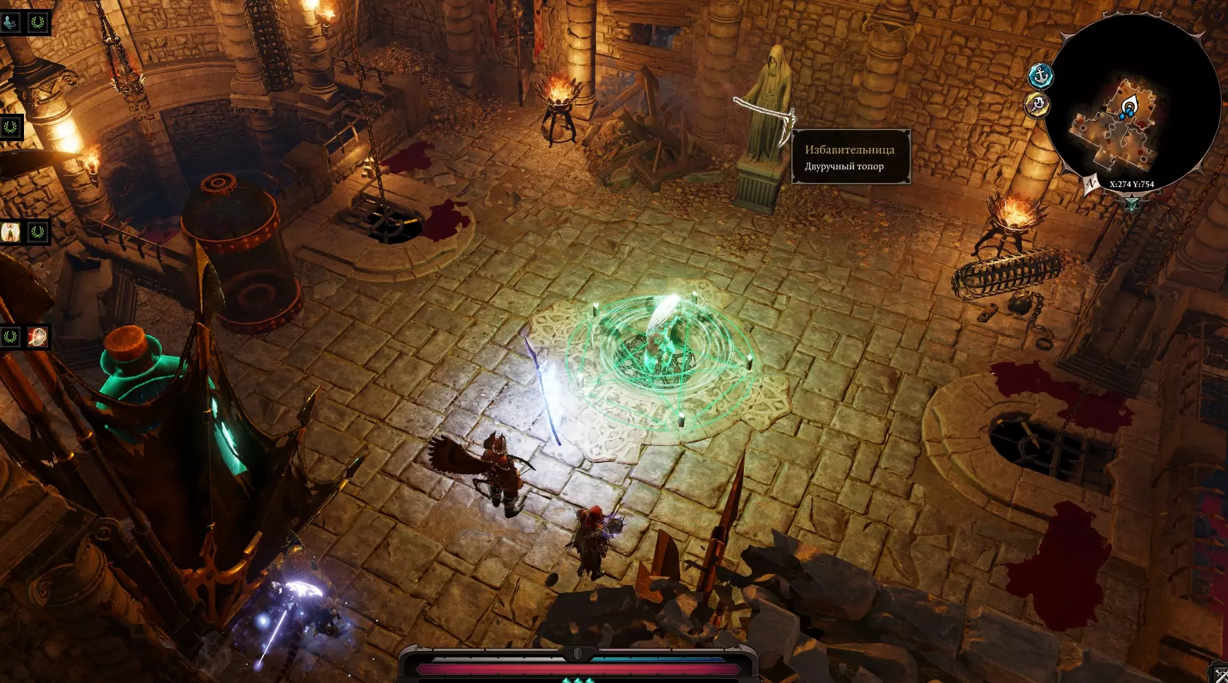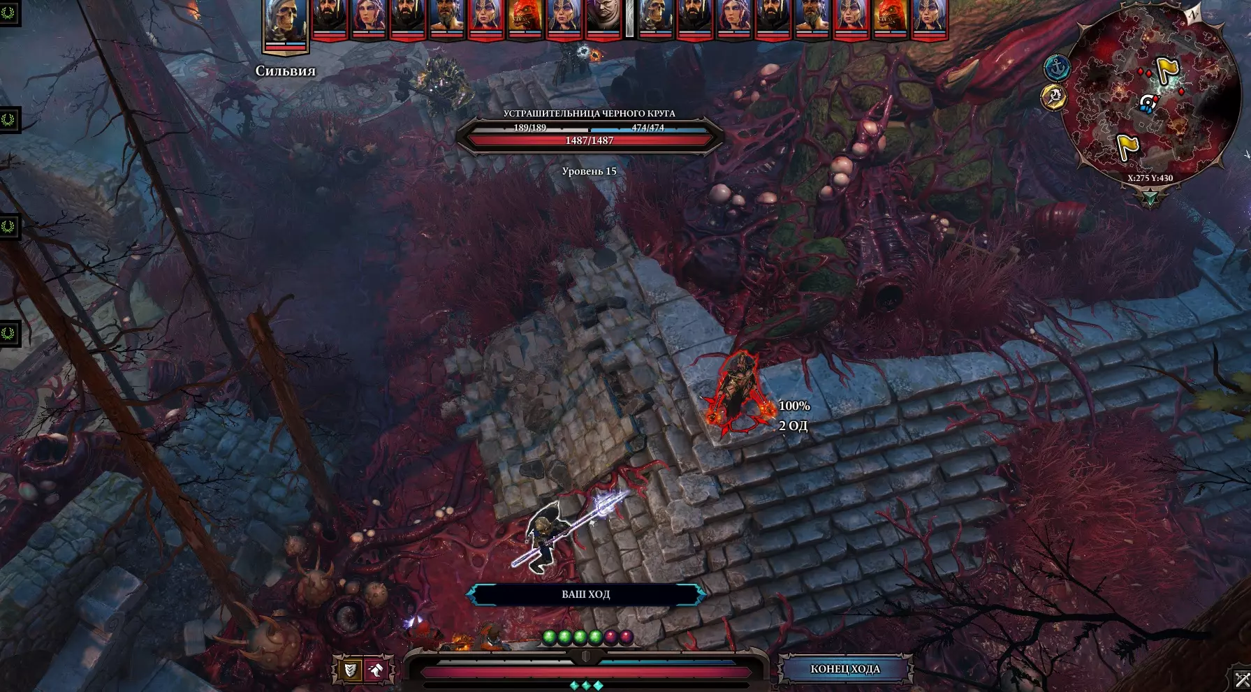 在楼下可以看到一个由石头、3根管道和3个杯子组成的谜题。 任务很简单: 摆放石头,使每根管道都能注满对应的杯子。 中央管道需要用血液注满,为此要在水流处使用【血雨】(1本《水文学》书籍+1本《 necrology 》书籍)。 在血液上施加【祝福】。 如果我们向神王许下了誓言,就在祭坛上使用【诅咒】,魔法墙就会消失。 石棺下方会打开一个活板门。苦难回廊是一条位于熔岩上方的长廊,尽头有一扇门。与门互动,进入其中。死亡房间是一个有大量拉杆的巨大大厅,这里还有许多敌人。我们需要无视敌人,打开通道。与岸边的玩偶互动后,我们得知需要输入单词【ПРАВО】。这是拉杆: П - 正直 Р - 决断力 А - 权威 В - 意志 О - 勇气 输入后,门会打开,继续前进。 现在是最终之战的时刻了。 神性陵墓 建议在前往下层之前存档。