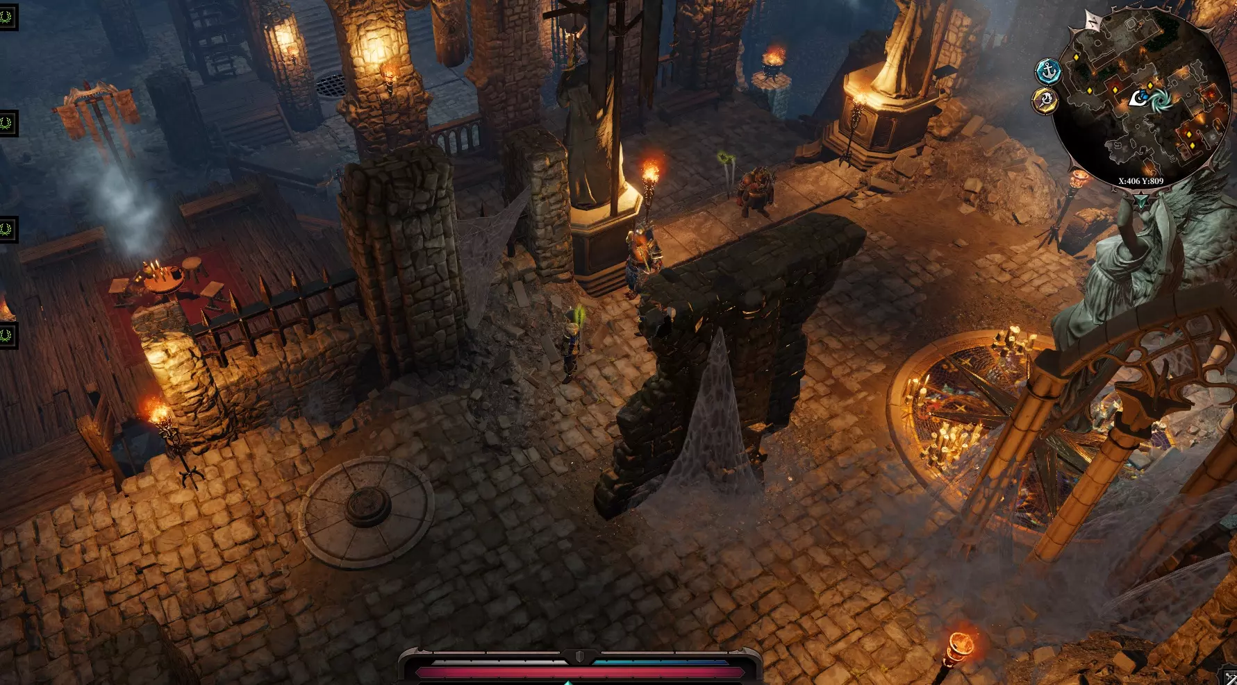 在洞穴中,我们看到两侧有石油桶,中央有酸性陷阱和地雷。地雷(和第一部中一样)在靠近时会消失,所以要在远处用范围技能摧毁它们。然后释放“祝福”技能,为其施加增益效果。 继续前进,看到女巫,进入战斗。战斗非常困难,尤其是当女巫成功对你的强力伙伴施加【魅惑】效果时——此时他会使用自己所有的物品和技能来攻击你。拾取另一个【净化法杖】——需要将其交给龙以解放它。龙会变成蜥蜴,向我们道谢后消失。在地图上,龙的南边可以看到加尔古利迷宫。顺着藤蔓爬到入口处,会有雕像与我们对话,它们说只有拥有破碎头骨的人才能通过这里。进入迷宫。 第一个房间里,一名同伴站在按钮上,另一名同伴去拿头骨。
