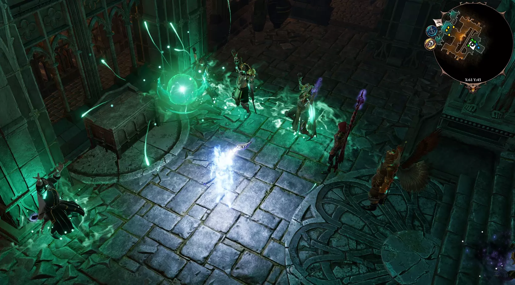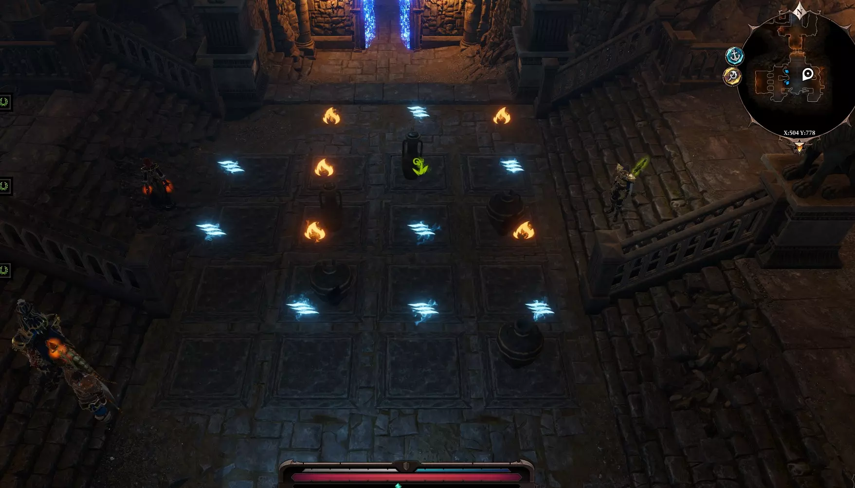 进入后,在墙边找到拉杆,它会打开石门。 让一名强力角色进入第二个房间,使用【幽灵视觉】。在有棺材的房间里会出现3个拉杆。 使用中间的拉杆,直到出现水。 使用左边的拉杆,直到出现电。 使用右边的拉杆,直到出现神圣之火。 棺材下方会出现活板门。