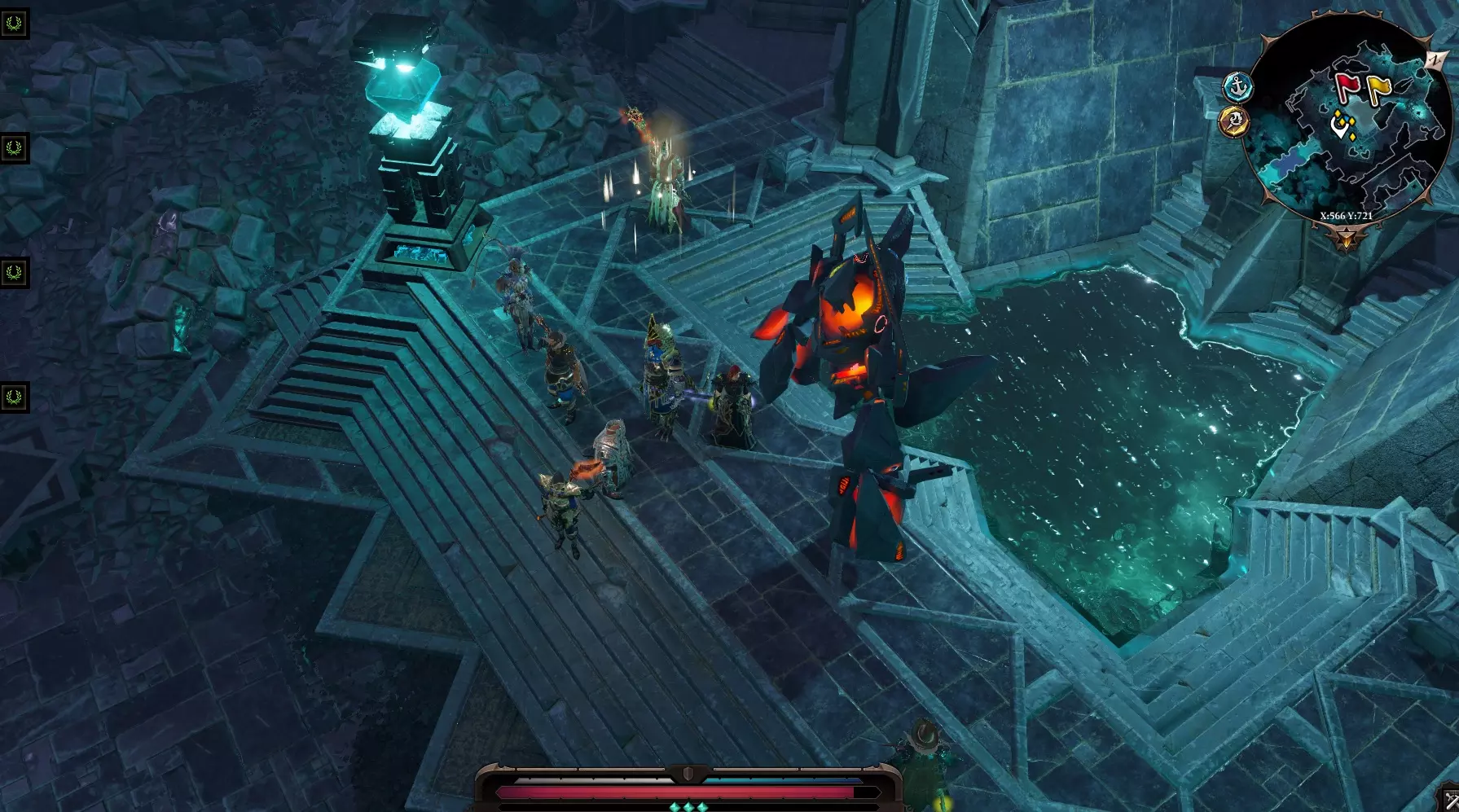 在断桥处,我们遇到了之前在【欢乐堡垒】中救下的法师德洛鲁斯。可以将他招募为队伍中的第五名成员。不过他不会参与战斗,准确地说,他太虚弱了,无法战斗,还会频繁死亡。建议将他安置在某处,否则在对话中若做出错误选择,他会转而攻击我们。之后需要护送他前往【精灵神殿】,他会在那里留下。拉利卡神庙 在人类神庙前,我们看到法师与黑环仆从正在战斗。加入战斗。 使用幽灵视觉。与拉利卡骑士交谈。 激活拉利卡祭坛。 弗洛吉尔神庙 兽人神庙被淹没了,必须解决这个问题。 跑向西北方。找到黑环营地。 在营地中遇到尼科尔(如果我们在黑矿坑救过他)。 原来神庙是被水法师故意淹没的。劝说船长让他们取消咒语。小队离开营地。 弗罗吉尔港
