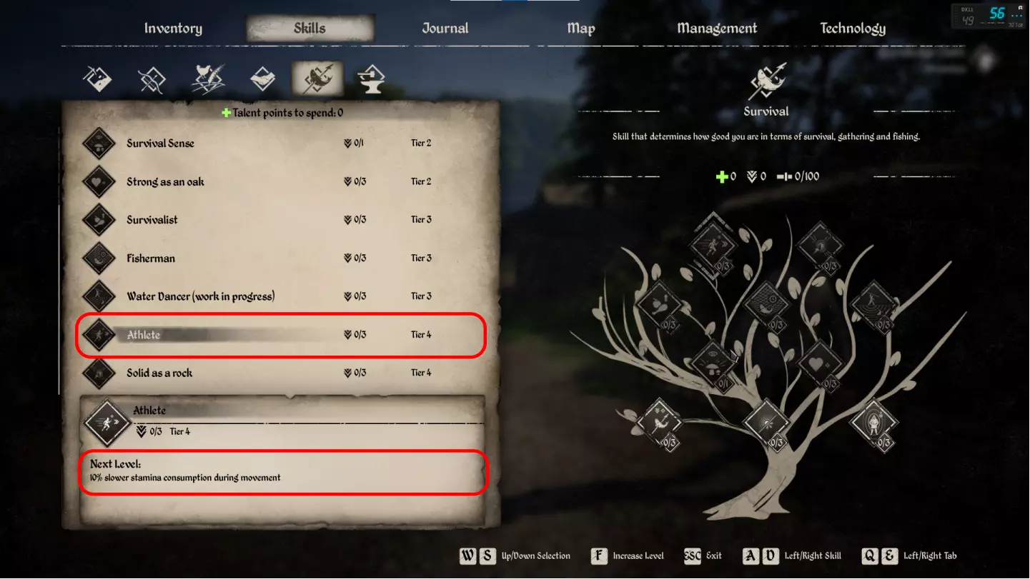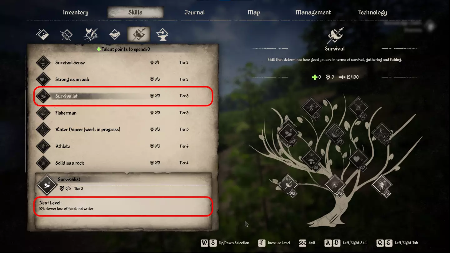 此技能树决定了你的角色与NPC交流和交易的能力。该类别下共有10个独特技能可供学习,目前仅有4个处于可用状态。以下是每个技能的详细介绍: 外交知识(Diplomacy Knowledge) 谈判时获得+1技能点。最多可升级三次。建议从游戏初期就将其升至满级。对于外交而言,这一点尤为重要,因为它是发展最为缓慢的技能。 罗密欧(Romeo) 【夺心】任务的好感度提升10%。总共可以升级三次。我玩了150小时游戏,一次都没遇到过这个任务。该任务仍在开发中。 骗子(Grifter) 可以进行赠送操作。可以升级一次。向谁赠送?赠送什么?为什么是骗子?问题这么多,却一个答案都没有。技能仍在开发中。 【常客(Frequent Buyer)】 降低商店价格5%。总共可升级三次。这是一个很棒的技能,尤其是目前少数能正常生效的技能之一。 【讨人喜欢(Likeable)】 增加5点最低好感度。总共可升级三次。所有NPC初始对您的好感度为50点,拥有此技能后将变为55点。听起来不是很有趣。达到70点的最低阈值,才能将NPC吸引到自己的村庄——这不会带来任何明显的优势。该技能仍在开发中。 【热情主人】(Good Host) 为村民提供+5额外心情值。总共可以升级三次。这是一个不错的技能,建议学习。而且它是少数几个能正常生效的技能之一。 【税收优化】(Tax Optimization) 减少10%的税收。总共可以升级三次。由于游戏内存在极高的税收,这是一项重要技能。当该技能可用时,它将为你提供帮助,目前该技能仍在开发中。 卖家(Seller) 你可以将自己的产品以高出5%的价格出售。总共可以升级三次。这是一个非常出色的技能,因为你需要持续进行销售。建议学习此技能。游戏初期技能点分配建议 学习3点【外交知识】,然后学习3点【常客】,接着学习【热情店主】和【卖家】。 生存技能(Survival)