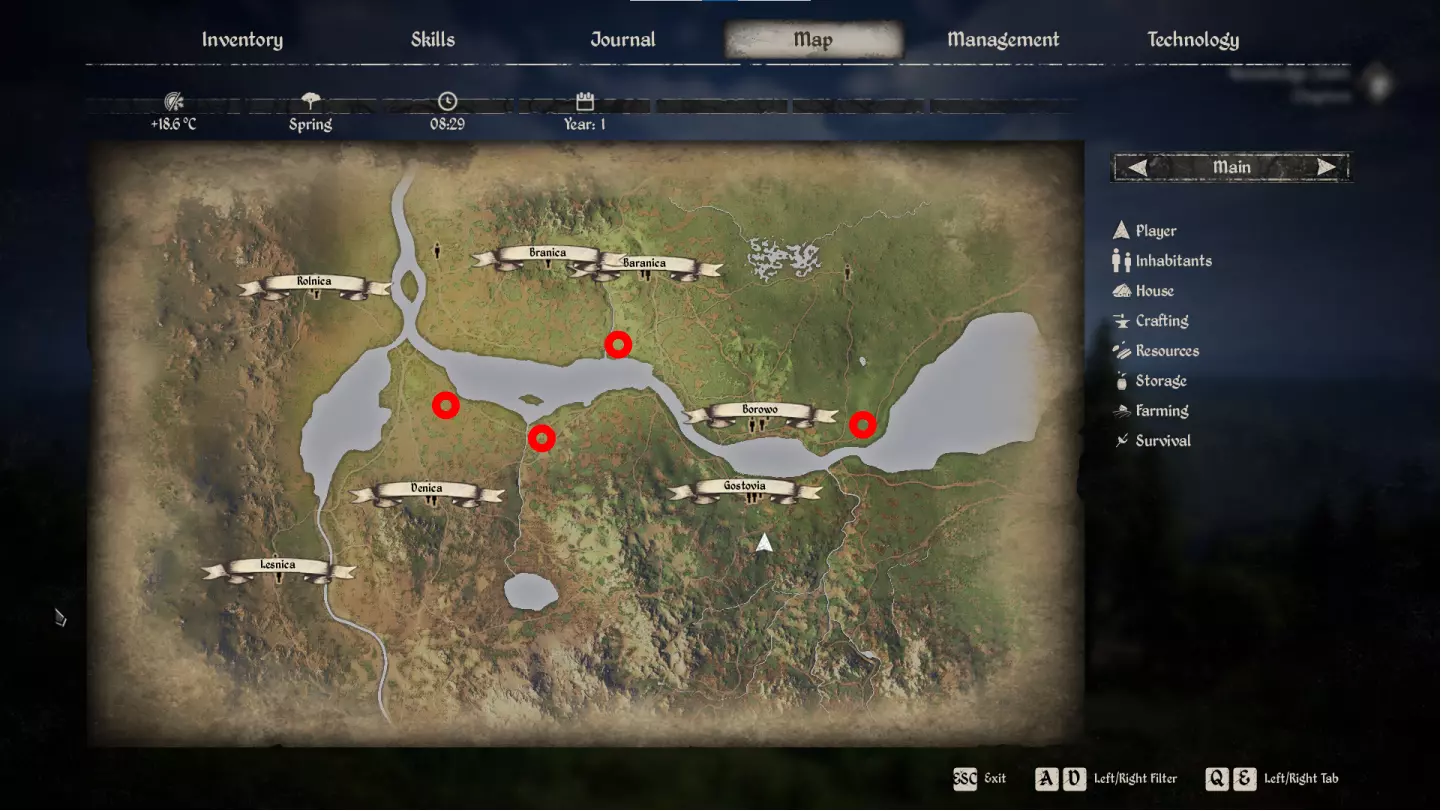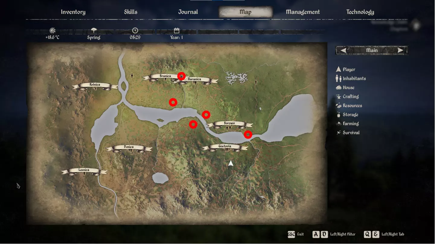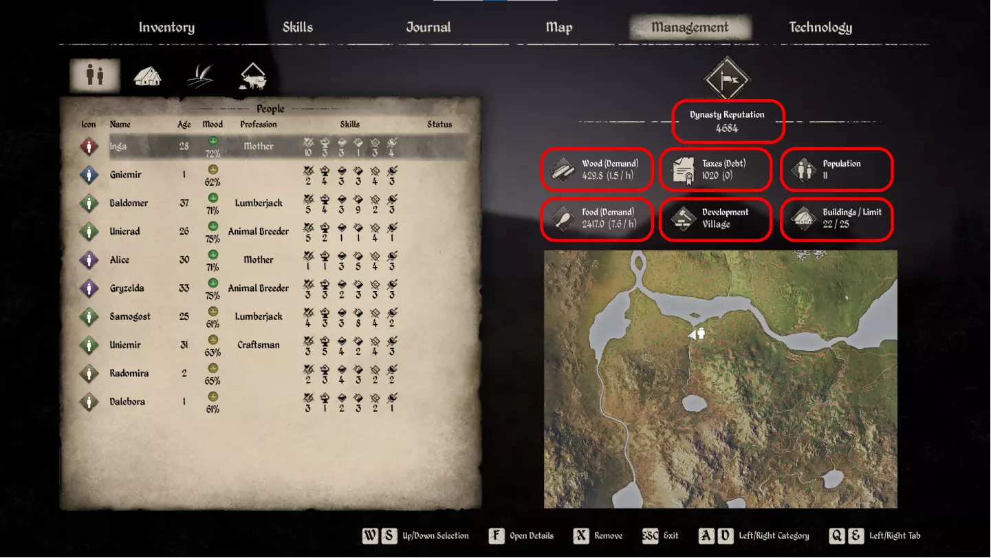 当受到攻击性动物的伤害、从高处坠落、中毒、脱水以及处于过低或过高温度环境时,生命值参数会下降。恢复生命值的方法包括在自己家中睡觉,或者在中世纪早期的条件下使用民间疗法——敷上宽叶车前草(Broadleaf Plantain)。说真的,在草丛里找找大型蒲公英,吃下去可以恢复生命值。这是经过数百年验证的方法。 控制界面 游戏的所有控制菜单分为6个标签页:【物品栏】(Inventory)、【技能面板】(Skills)、【日志】(Journal)、【地图】(Map)、【管理】(Management)、【科技树】(Technology)。背包是一个显示角色信息、属性、快捷栏、装备以及个人物品栏的面板,个人物品栏中会显示你携带的物品。按I键可快速打开背包。若要将工具或武器快速装备到快捷栏,只需在背包中点击它们,然后按数字键选择要放置的快捷栏位即可。最多可添加八个物品至快速访问栏。按F键可将衣物装备到角色身上,按X键可从背包中丢弃物品。 按K键可打开技能升级面板。技能分为以下类别:采集、狩猎、 farming、外交、生存、制作。 下方将详细介绍游戏中所有可用技能。 按J键可打开日志。这是活动任务列表。游戏中的任务分为4类,分别是主线剧情章节、剧情任务、支线任务和试炼。其中试炼类别目前在游戏中尚未开放。若要将你感兴趣的活动任务显示在追踪面板上,可点击该任务名称,然后按下F键。此后,该任务将显示在屏幕右上角。此外,日志中还有三个额外标签页:已完成任务列表、失败任务列表以及知识库,您可以在知识库中详细阅读游戏相关信息。 按M键可以调出地图。我们稍后会详细介绍该部分,现在直接进入下一部分——管理面板。 管理面板包含管理您定居点的各项控制元素。按下N键可呼出面板。面板左侧有四个管理标签页:【居民】、【建筑】、【田地】和【动物】。第一个标签页用于管理村庄居民列表、他们的工作状态、情绪和技能等级。要查看特定村民的详细信息,点击该村民后按F键。如果想将居民从定居点解雇,可点击该居民,然后按X键并确认操作。在建筑选项卡中会显示您建造的所有建筑、它们的状态以及工作情况。要为村庄中的空闲居民分配建筑内的工作,请从列表中点击目标建筑,然后按F键,在屏幕右侧选择所需职位,再次按F键并选择合适的居民。在【田地】标签页中,您可以查看已建造的田地列表。按下F键可对其进行详细设置。在【动物】标签页中,您可以详细查看宠物的状态信息。由于游戏初期无需照料动物,因此暂时无需过多关注这部分内容。 管理面板界面的另一重要部分位于屏幕右侧。在这里我们会同时追踪一系列重要参数,例如:村庄当前的声望等级、木材储备、食物储备、税收等级、人口数量、村庄发展等级以及建筑数量限制。