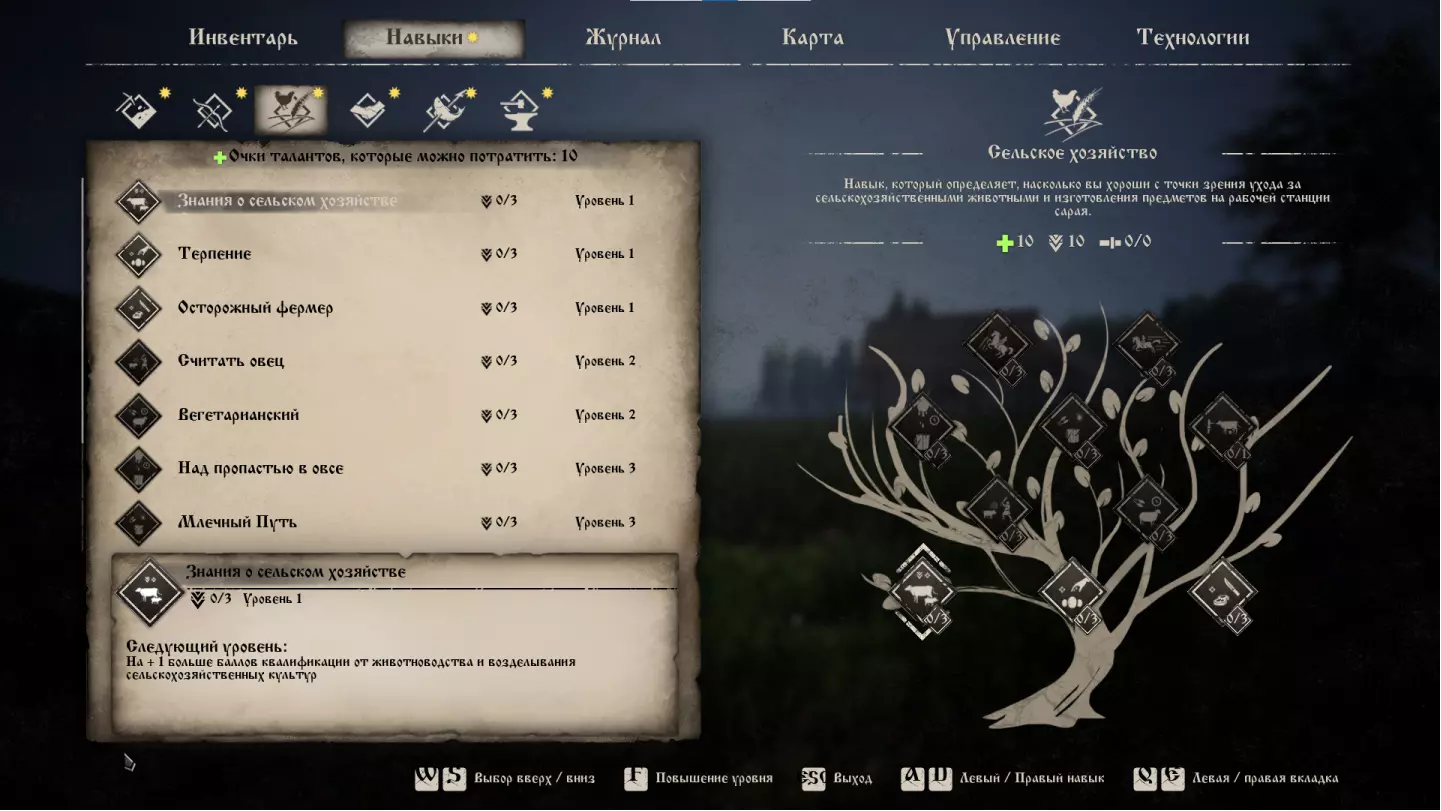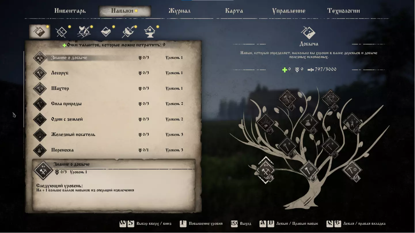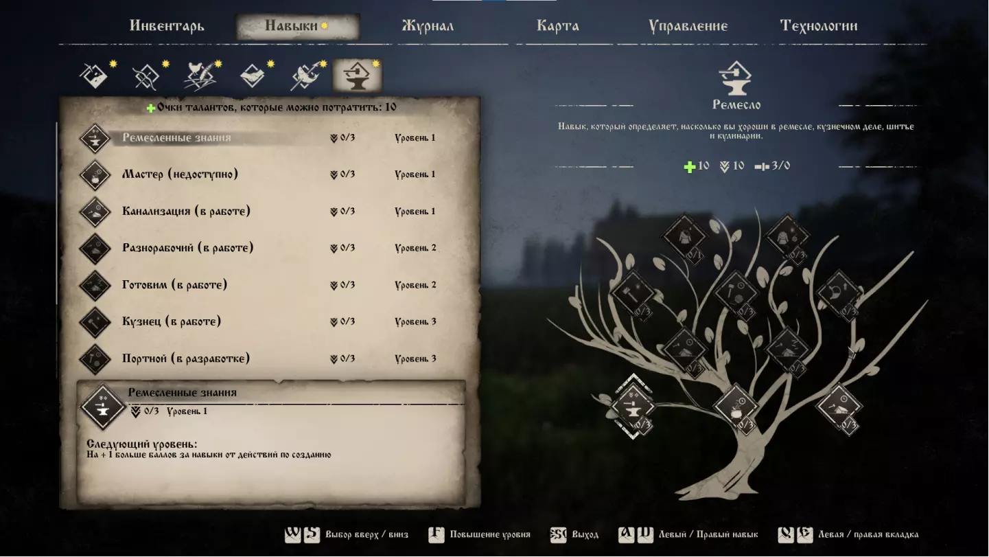 Это древо навыков определяет, насколько вы хороши в ремесле, кузнечном деле, шитье и кулинарии. Всё древо находится пока в разработке, а сами навыки выглядят пока абсолютно бесполезными, но давайте подробнее рассмотрим каждый из них: Знания о ремесле (Crafting Knowledge) Даёт +1 очко навыков за действия по созданию вещей. Всего можно прокачать до трех раз. Вкачиваем на максимум с начала игры. Ремесленник (Craftsman) Увеличивает на 10% скорость создания деревянных и каменных предметов. Всего можно прокачать до трех раз. Вы этот навык на практике даже не почувствуете. Пока недоступно. Швея (Sewer) Увеличивает на 10% скорость создания одежды из льна и меха. Всего можно прокачать до трех раз. Одежда создаётся достаточно долго, около 20 секунд, но данное производство чрезвычайно долго и сложно поставить на поток. Поэтому навык не будет использоваться в реальных условиях. Пока недоступно. Рукастый (Handyman) Даёт возможность улучшать и убирать улучшения модулей построек. Всего можно прокачать до трех раз. Это всё работает и без навыка, непонятно вообще зачем заложено в базу. Возможно, позднее, разработчики дадут доступ к данной возможности только при условии активного таланта. Пока недоступно. Повар (Cook) Увеличивает на 10% скорость приготовления пищи. Всего можно прокачать до трех раз. Отличный навык, так как готовить Вам придется постоянно и в больших количествах. Очень будет полезен, когда введут, но пока недоступно. Кузнец (Blacksmith) Увеличивает на 10% скорость создания железных вещей. Всего можно прокачать до трех раз. Тоже ничего интересного. По-хорошему, работу в кузне Вы будете отдавать в руки NPC, поэтому – данный навык будет не особо полезен. Пока недоступно. Портной (Tailor) Увеличивает на 10% скорость создания одежды из шерсти и кожи. Всего можно прокачать до трех раз. Всё по аналогии с навыком «Швея». Пока недоступно. Пекарь (Backer) Увеличивает на 10% скорость создания мучной продукции. Всего можно прокачать до трех раз. Если акцентировать своё внимание на продукции данного вида, с целью выхода на постоянную продажу, тогда может и будет полезен. А в целом – весьма посредственный навык. Пока недоступно. Мастер-строитель (Building Master) Уменьшает на 10% расход выносливости при строительстве. Всего можно прокачать один раз. Это всё равно не будет работать из-за того, что Вам необходимо постоянно отрываться от строительства, для доставки материалов на место стройки. Пока недоступно. Строитель (Builder) Уменьшает на 5% скорость износа строительного молотка. Всего можно прокачать до трех раз. Если железные молотки останутся настолько не сбалансированными, как и сейчас, то польза от этого навыка будет ощутима. В противном случае – ерунда. Пока недоступно. Рекомендации к распределению очков навыков на начальном этапе игры для этого древа навыков давать сложно. Такое чувство, что разработчики вставили весь список навыков «для галочки». Пока всё выглядит максимально не интересным. Но если бы мне пришлось выбирать, то я бы сделал следующее: сначала выучите «Знания о ремесле» на три очка, далее «Повар» на три очка, далее «Рукастый», далее «Пекарь» и «Строитель». Будем следить, что в итоге, разработчики сделают с данной веткой навыков. Технологии Рассмотрим все древа технологий, доступные в игре. Эта часть гайда создана на патче 0.1.1.5 и будут рассмотрены совсем недавние нововведения, которые з