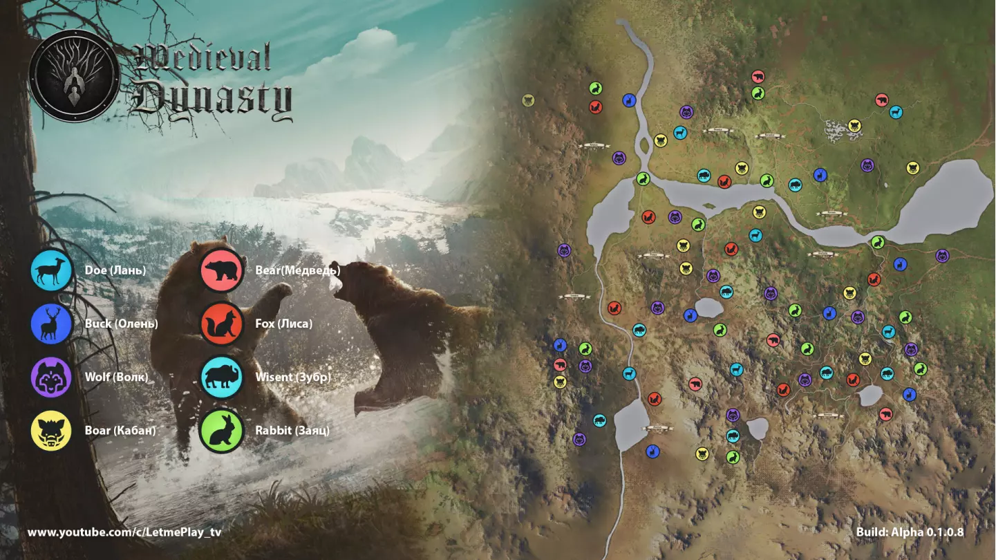让我们详细解析世界地图及其秘密。 下载材料: 【总览地图】 【洞穴和黏土生成点地图】(1920×1080) 【动物生成点地图】(1920×1080) 4K分辨率地图: 【总览地图】 【洞穴和黏土生成点地图】(1920×1080) 【动物生成点地图】(1920×1080)游戏俄化补丁 朋友们,过去一周你们一直在我的频道上询问俄化补丁的问题。之前只有100%的机器翻译,我甚至都没尝试过,但今天我有有趣的东西要给大家展示…… 我在录制关于《中世纪王朝》的汉化补丁视频时,该补丁包含50%的人工翻译,期间又发布了几个不错的版本,在文本攻略中我会提到在Playground上找到的最新版本。 总之,最新版本的汉化补丁已经翻译了所有能翻译的内容。添加了一系列与游戏原作风格相似的氛围字体,修复了PlayGround社区评论中发现的错误,该社区的成员负责游戏的翻译工作。同时进行了一些小的修复、调整并添加了新词汇。此汉化补丁适用于0.1.1.5版本及更早版本。下载文件,然后进入游戏安装路径,找到Medieval_Dynasty文件夹,接着找到Content文件夹,在其中找到Paks文件夹。将下载的文件放入该文件夹,不要删除文件夹中的任何内容。完成后,即可进入游戏,体验相对完善的翻译版本。我会关注汉化进度,若有重大更新会通知大家。感谢大家阅读本指南。我会密切关注所有更新并对指南进行修改。欢迎前来提问关于这款游戏或其他相关问题,我很乐意为你解答。 更新消息 我很高兴能在俄语YouTube频道中率先告诉大家,《中世纪王朝》今日已推出0.2.1.0版本封闭测试版,其中包含了我们期待已久的全新精彩改动与内容。接下来我将逐一为大家介绍。