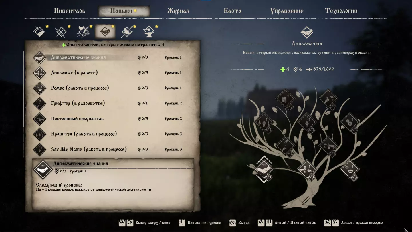 这棵技能树决定了你的角色在照料农场动物以及在谷仓工作台的制作速度方面的能力水平。该类别中共有10个独特技能可供学习,目前其中7个处于可用状态。让我们详细了解每个技能: 农业知识(Farming Knowledge) 提供+1点农业技能点。总共可以升级三次。从游戏开始就将其升到最高级。 耐心(Patience) 畜牧工具的损坏速度降低5%。总共可以升级三次。这里指的是诸如:剪羊毛剪刀、挤奶桶和赶猪棒之类的物品。不是特别有用的技能。 细心的农夫(Careful Farmer) 你的农具损坏速度降低5%。总共可以升级三次。只要NPC还能“凭空”获取物品,这个技能就毫无用处。 剪羊毛(Counting Sheep) 你的角色剪羊毛速度提升10%。总共可以升级三次。如果能多获得10%的羊毛,那这会是个很棒的技能,现在这样——就是垃圾。 素食主义者(Vegetarian) 种植蔬菜时所需的种子数量减少20%。总共可以升级三次。该技能完全无效,因为每块田地总是消耗1粒种子。 燕麦捕捉者(Catcher in the Oat) 减少20%种植粮食作物所需的种子数量。总共可以升级三次。该技能的生效问题与前一个相同。 银河(Milky Way) 你的角色挤牛奶的速度提高10%。总共可以升级三次。这也是一个效果一般的技能。牛奶目前未用于生产,只能饮用。不过也可以直接喝地上的牛奶 puddle,且不会消耗体力。 夜骑士(Night Rider) 解锁骑马功能。这是所有玩家都在热切期待的内容,目前该机制暂不可用。 减少剪羊毛和挤奶的体力消耗(Less Stamina Coast) 剪羊毛和挤奶时的体力消耗速度降低10%。该效果最多可升级三次。无用技能。 减少耕种和收获时的耐力消耗【耐力消耗降低】 耕地和收获时耐力消耗速度降低10%。总共可以升级三次。这比上一个技能有趣得多。如果你要处理很多田地,可能会有用。初期技能点分配建议 学习3点【农业知识】,接着学习【谨慎农夫】,然后学习任意三阶技能以解锁【耕作和收割时体力消耗减少】技能,该技能可升至满级。剩余点数可根据个人喜好分配,该技能树中实用技能较少。 外交技能(Diplomacy)