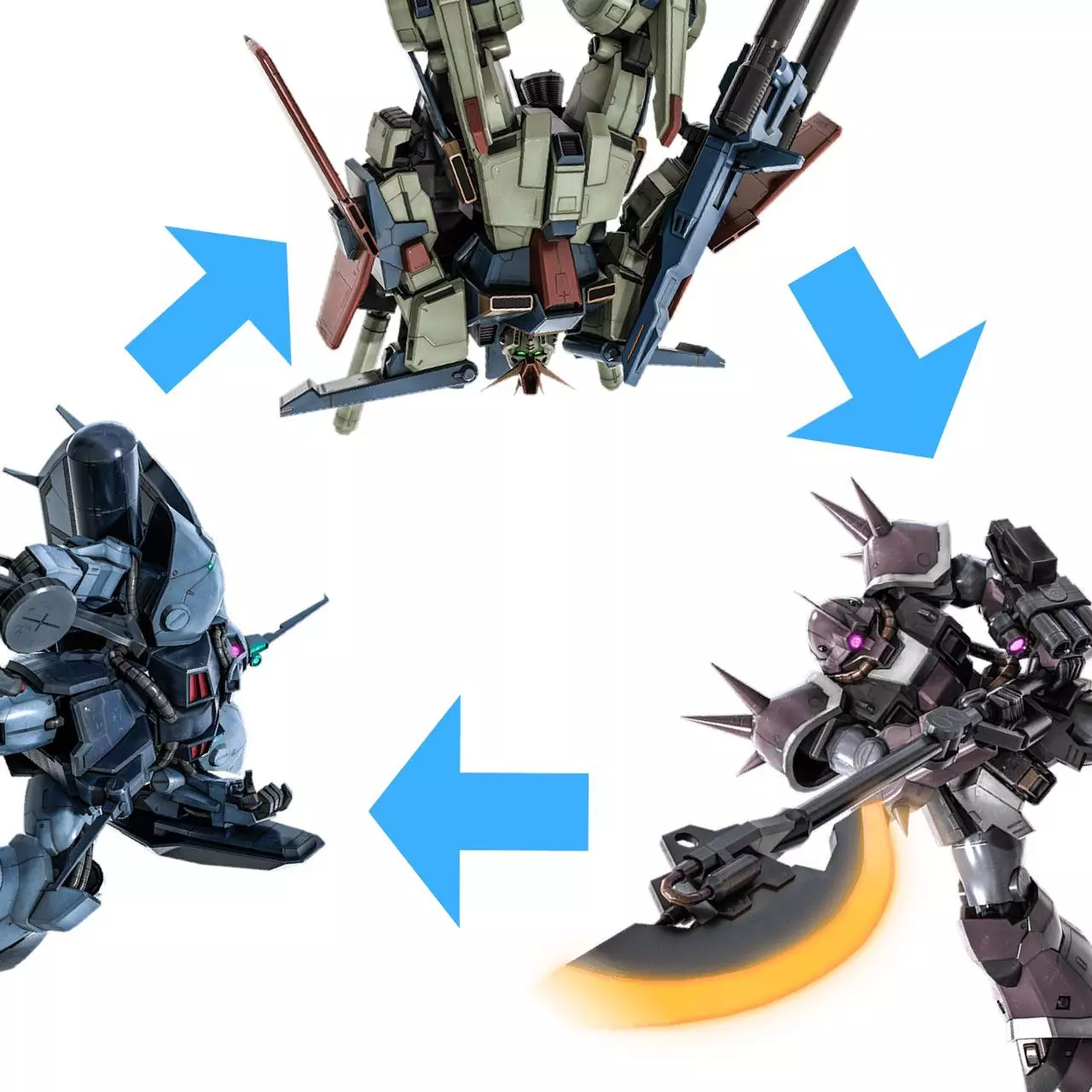 基础游戏玩法 首先:了解你的机动战士 机动战士(不仅仅是高达)分为3类: 泛用型(蓝色):你是团队的主力,职责是维持前线,并且在需要时保护你的支援型队友。 如果你在开阔地带被敌方支援型盯上会非常脆弱,所以不要过度前压。 战斗结束后,如果有机会,占领信标。信标不仅能为你提供新的重生点,还可以用来呼叫空袭,这可能会改变战局。