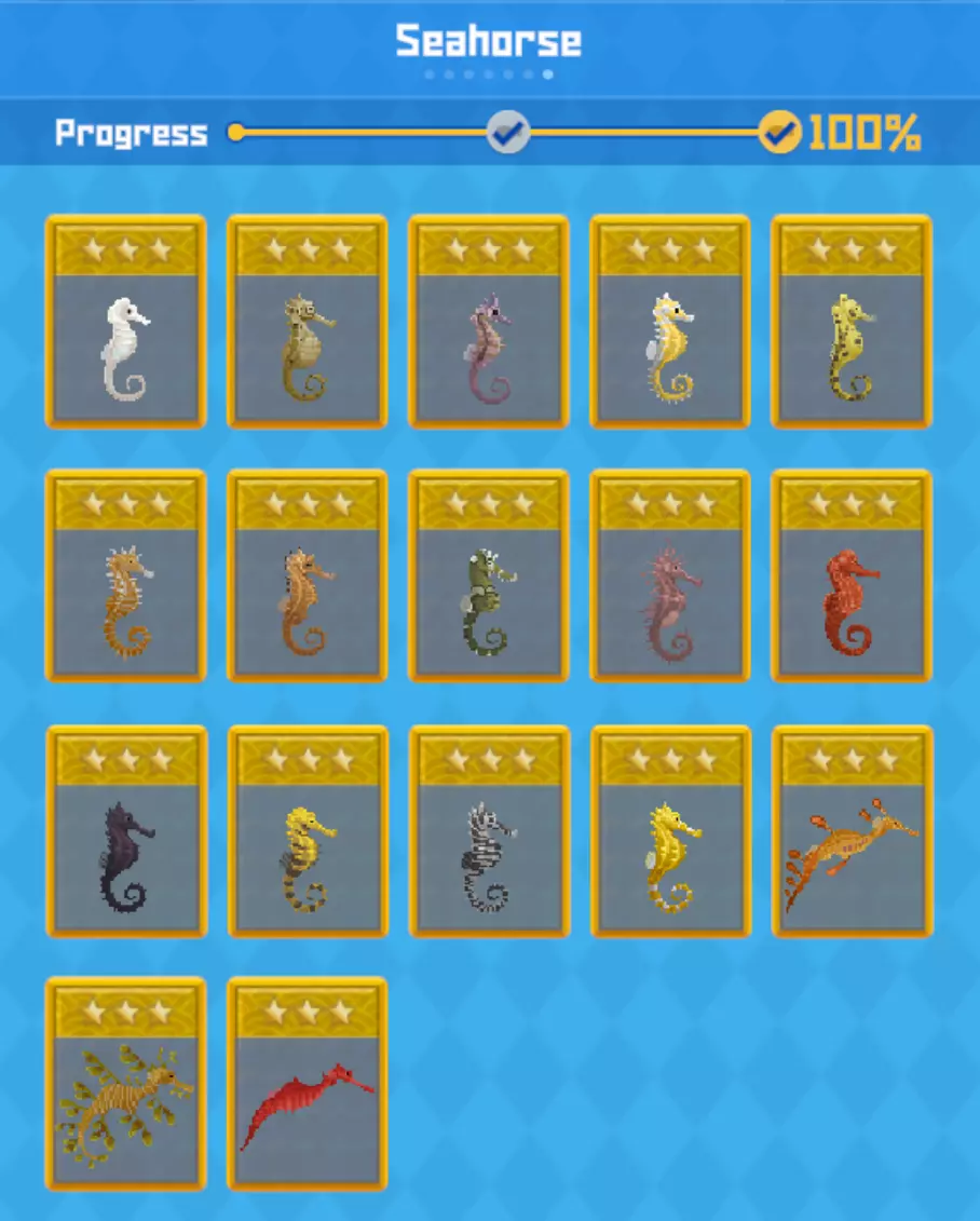 海马图表(对应上方图片) 白海马(16厘米) 大腹海马(35厘米) 冠海马(10厘米) 侏儒海马(5厘米) 长颈鹿海马(10厘米) 刺猬海马(10厘米) 杰氏海马(14厘米) 线纹海马(17厘米) 长吻海马(21厘米) 太平洋海马(19厘米) 斑点海马(30厘米) 虎尾海马(18厘米) 斑马海马(15厘米) 刺海马(17厘米) 草海龙(43厘米) 叶海龙(35厘米) 红宝石海龙 关键信息:本部分无注释! 【附录】GYAO! 我还没有通关GYAO!,所以这里没有完整的图片,但以下是GYAO!的基本信息: 在常规游戏过程中,你将在手机上解锁GYAO!应用程序。这也会添加一个新的MARINCA页面。 每个GYAO!动物的寿命为10年(10个游戏内天数)。如果你悉心照料它们,4年后将解锁【MARINCA】中的条目(以及成就进度)。之后,你可以让你的GYAO!动物死亡以加快进度。 【附录】大鱼 - ⭐⭐⭐品质 前提条件:要捕获最高(⭐⭐⭐)品质的鱼,你必须先解锁打捞无人机(在普通剧情中)。如果你还没达到这一阶段,就需要等待,在此期间可以捕获⭐⭐品质的鱼。 我还强烈建议将打捞无人机升级到最高等级,这绝对物有所值。 挑战:捕获最高品质大鱼的难点在于,你无法用静音飞镖 tranquilize 它们,也不能用普通渔网捕捉它们。你的选择(我最喜欢的前期游戏选择):将水下步枪升级为 tranquilizer rifle(麻醉步枪)。用它射击鱼类时,有40%的几率使鱼麻醉。一旦通过这种方式麻醉,你就可以使用打捞无人机对鱼进行打捞。 眼镜蛇会随机出售钢制网传感器陷阱(在正常游戏中金枪鱼事件发生后)。它可以用来用网捕捉大鱼。一旦捕获,就可以用打捞无人机回收它们。