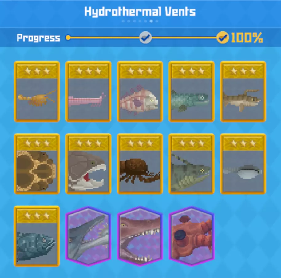 鱼类图表(对应上方图片) 北极鳕鱼(45厘米) 胶状狮子鱼(20厘米) 南极章鱼(75厘米) 格陵兰鲨(670厘米)【大型】 极地绵鳚(30厘米) 鼠鲨(400厘米)【大型】 冰鱼(52厘米) 毛鳞鱼(23厘米) 一角鲸(300厘米)【大型】 黑线鳕(95厘米) 星鳐(120厘米)【大型】 北极望远镜鱼(20厘米)1️⃣ 阿拉斯加狭鳕(70厘米)1️⃣ 圆鳍鱼(60厘米)3️⃣ 短吻刺鳗(120厘米)3️⃣ 南露脊海豚(220厘米) 大王具足虫(50厘米)1️⃣ 狮鬃水母(3000厘米) 幻影水母(???厘米)2️⃣ 关键说明:【大型】- 大型鱼类必须先杀死才能切割其肉。要给这些鱼三星评级,你需要用麻醉枪麻醉它们或用偷猎网捕捉它们,然后用回收无人机回收(更多信息见附录)。 1. 第一个冰川洞穴:这种鱼只在第一个冰川洞穴中生成(在剧情中可正常进入)。 2. 第二个冰川洞穴:在剧情任务中进入第二个冰川洞穴时可以遇到这种鱼。完成剧情即可获得。 3. 第三个冰川洞穴:这种鱼只在第三个冰川洞穴中生成(在剧情中可正常进入)。 隐藏:这些鱼藏在地下!你需要靠近它们才会出现(足够近时,这些鱼隐藏的位置会出现红色“敌人”标记)。- 拍照:无需捕捉这些鱼类,而是必须给它们拍照。拍照鱼类均为三星品质。 - 首领:要获取这些卡片,必须击败首领。 【区域】热液喷口 总结:总体而言,热液喷口区域因其面积较小,是一个容易完成的区域。你必须通关游戏才能解锁该区域的所有鱼类(因为最终首领是首领卡片之一)。 要获得三星品质的鱼类,必须先对其进行 tranquilize(麻醉)或用网捕捉。 完整图鉴:在图片中找到你缺失的鱼类位置,然后向下滚动至下方表格查看名称/备注。