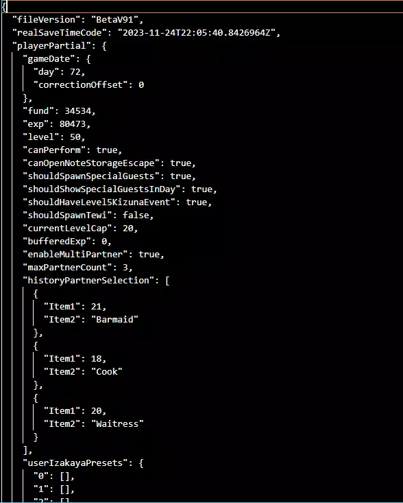 "enableMultiPartner"表示您是否可以拥有多个伙伴。保持"true"即可。 "maxPartnerCount"是指您可以同时拥有多少个伙伴。当您想超过最初的3个伙伴上限时,编辑此项会非常有趣。 "historyPartnerSelection"是您可以查看当前正在使用的伙伴以及他们扮演的角色的部分。 "Item1"是您正在使用的伙伴,但不是按名称而是按ID。 "Item2"是他们正在履行的角色。 注意:在这里,您可以将所有伙伴都换成同一个角色。也就是说,如果我希望有3个或更多咲夜作为我的伙伴,我可以在这里做到这一点。 库存 第三个真正有用的编辑部分是库存部分,即您的饮料和食材。