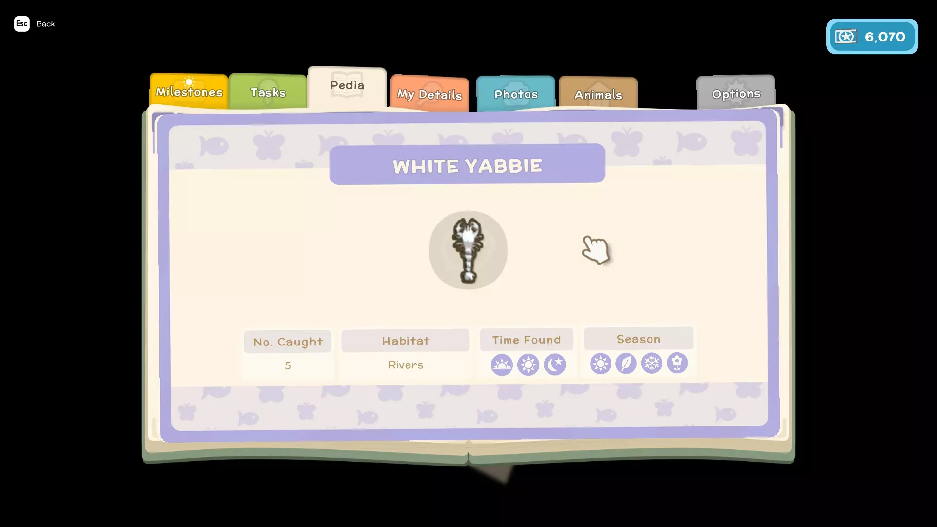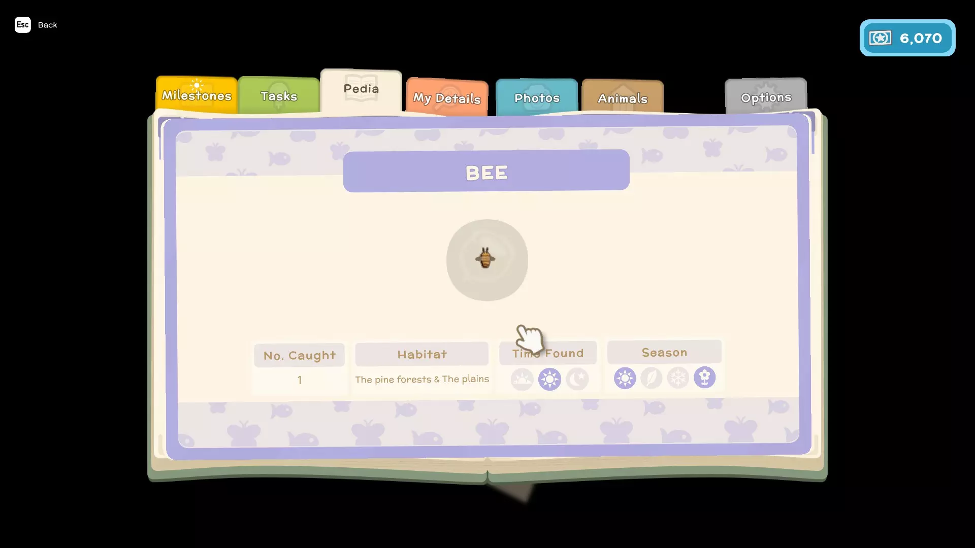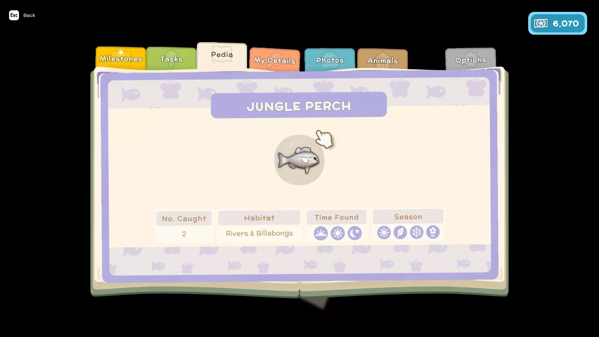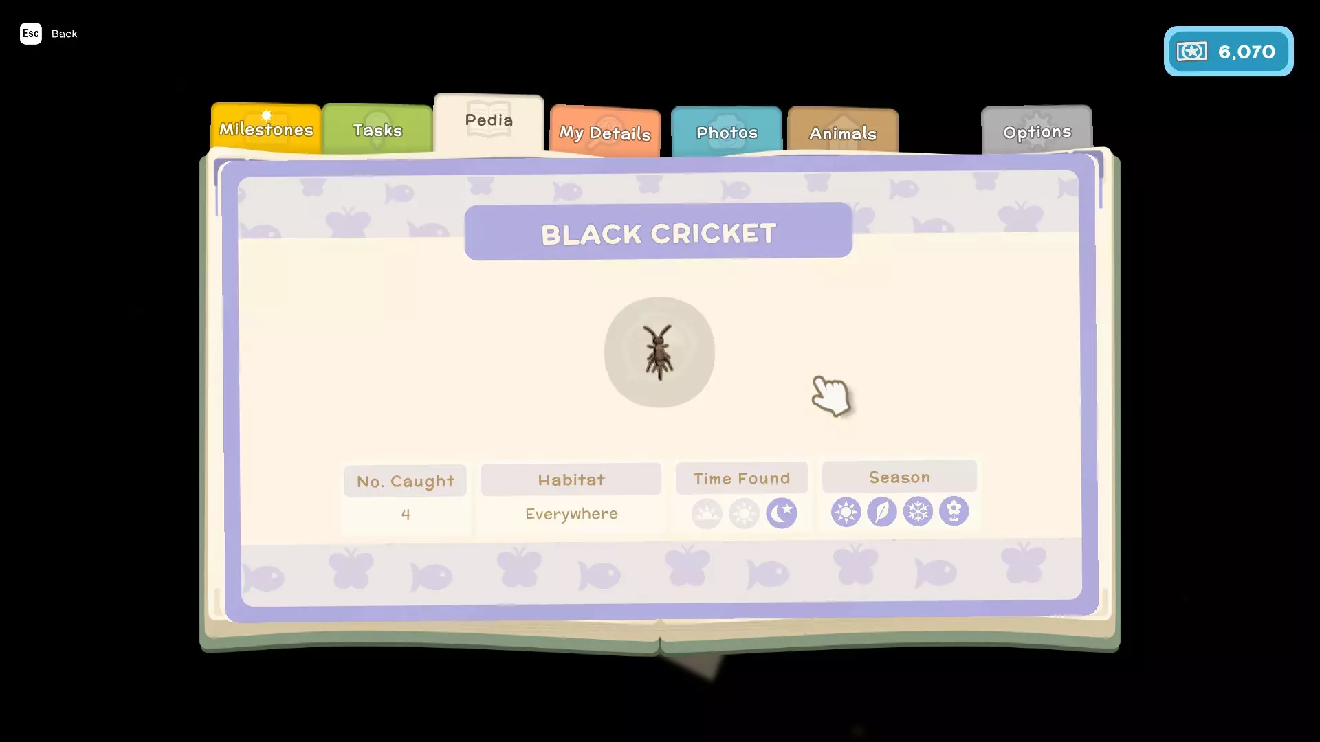 - 任务(这些是你为游戏剧情以及私人住所执行的类似任务的内容) - 图鉴(这里会显示你在游戏中遇到的所有鱼类、昆虫、小动物和人物,并包含它们的详细信息,例如:季节、发现时间、栖息地、捕获数量、关系) - 我的资料(在这里可以查看你的整体进度以及游戏中角色的详细信息) - 照片(这里可以存储你在游戏中拍摄的照片)