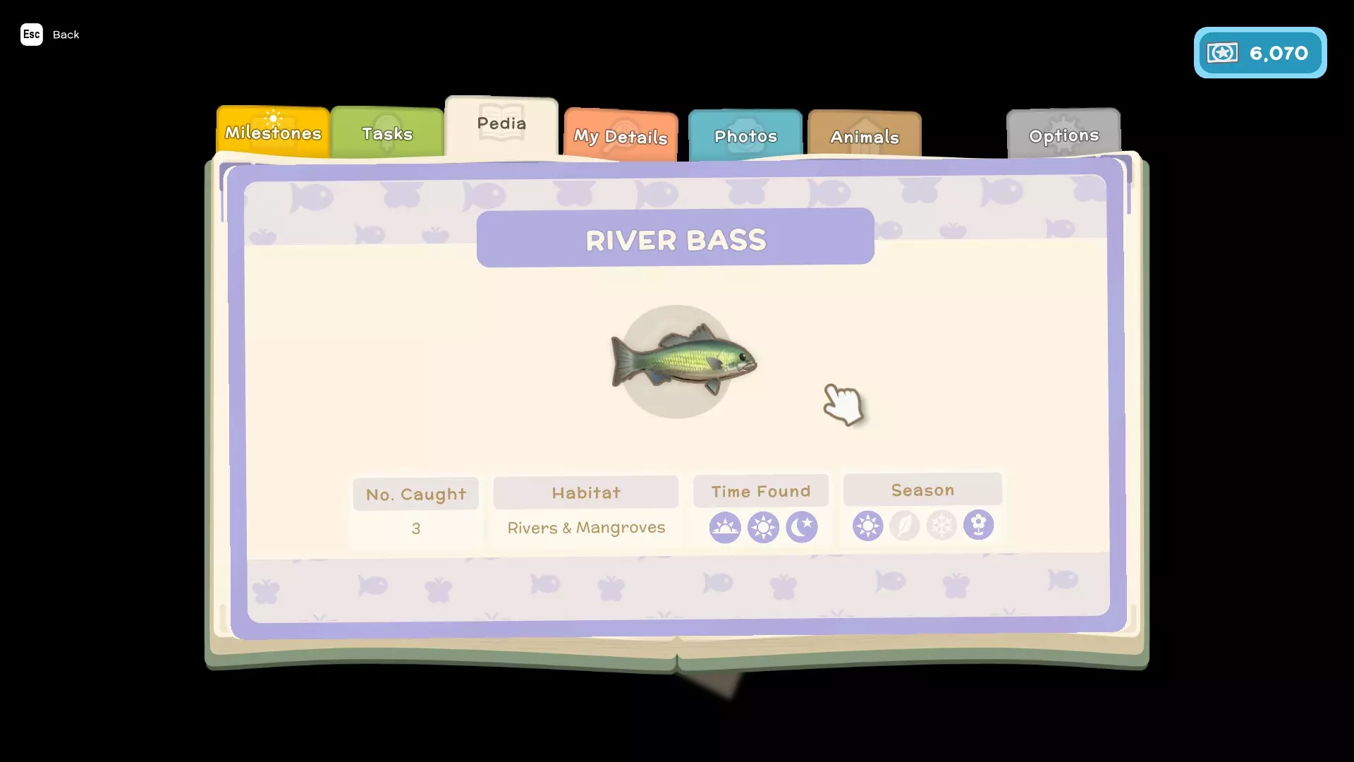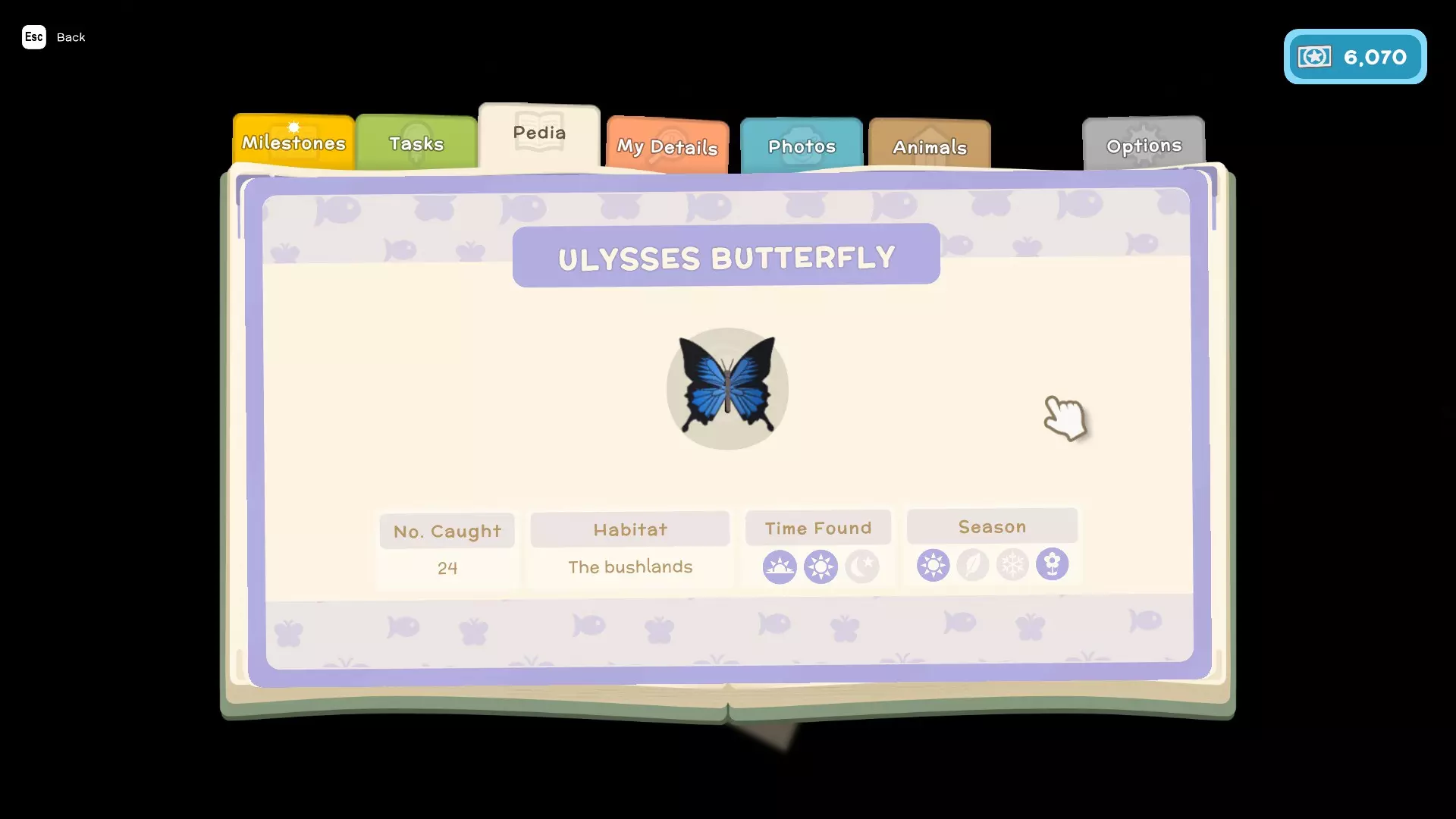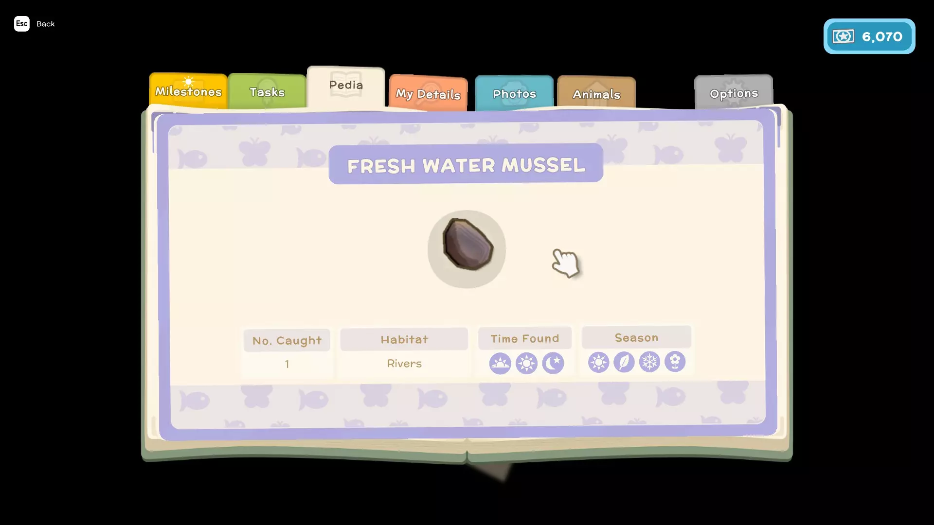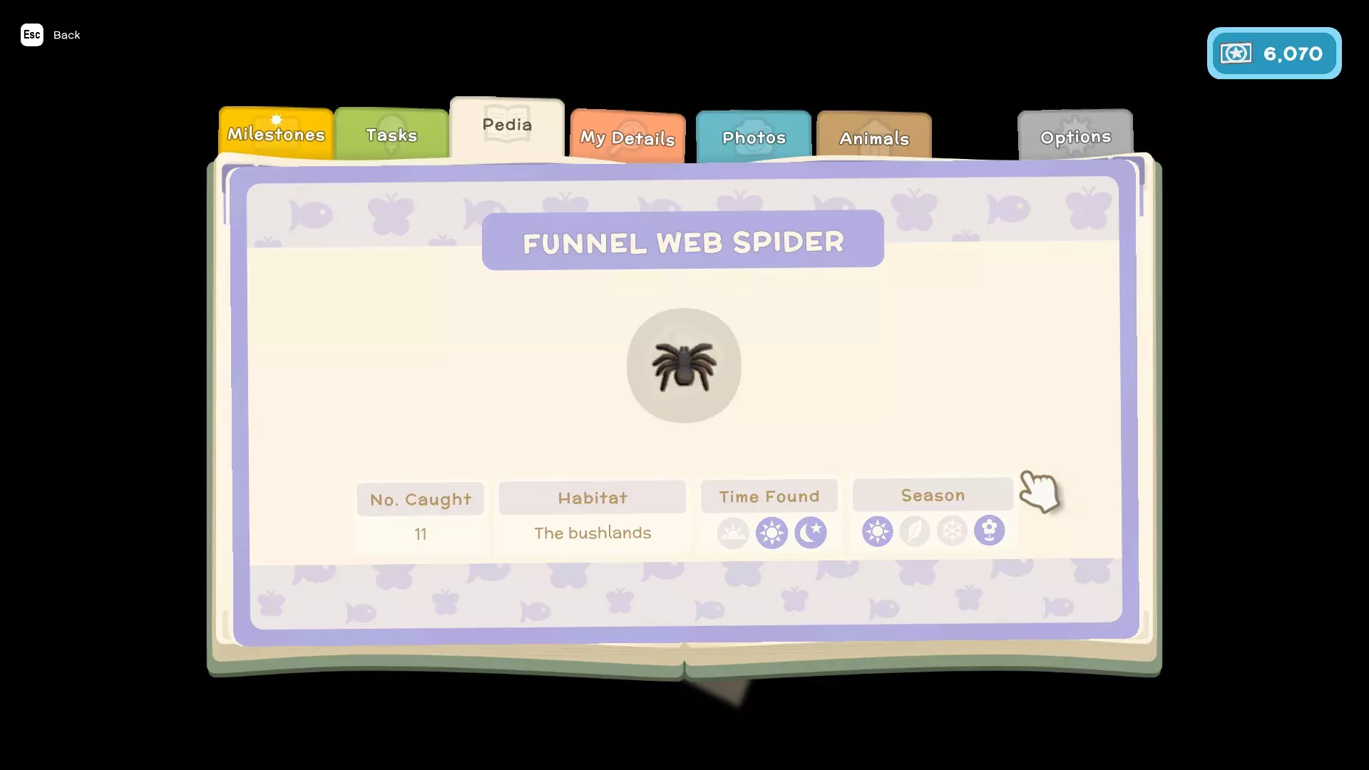 - 任务(这些是你为游戏剧情以及私人住所执行的类似任务的内容) - 图鉴(这里会显示你在游戏中遇到的所有鱼类、昆虫、小动物和人物,并包含它们的详细信息,例如:季节、发现时间、栖息地、捕获数量、关系) - 我的资料(在这里可以查看你的整体进度以及游戏中角色的详细信息) - 照片(这里可以存储你在游戏中拍摄的照片)