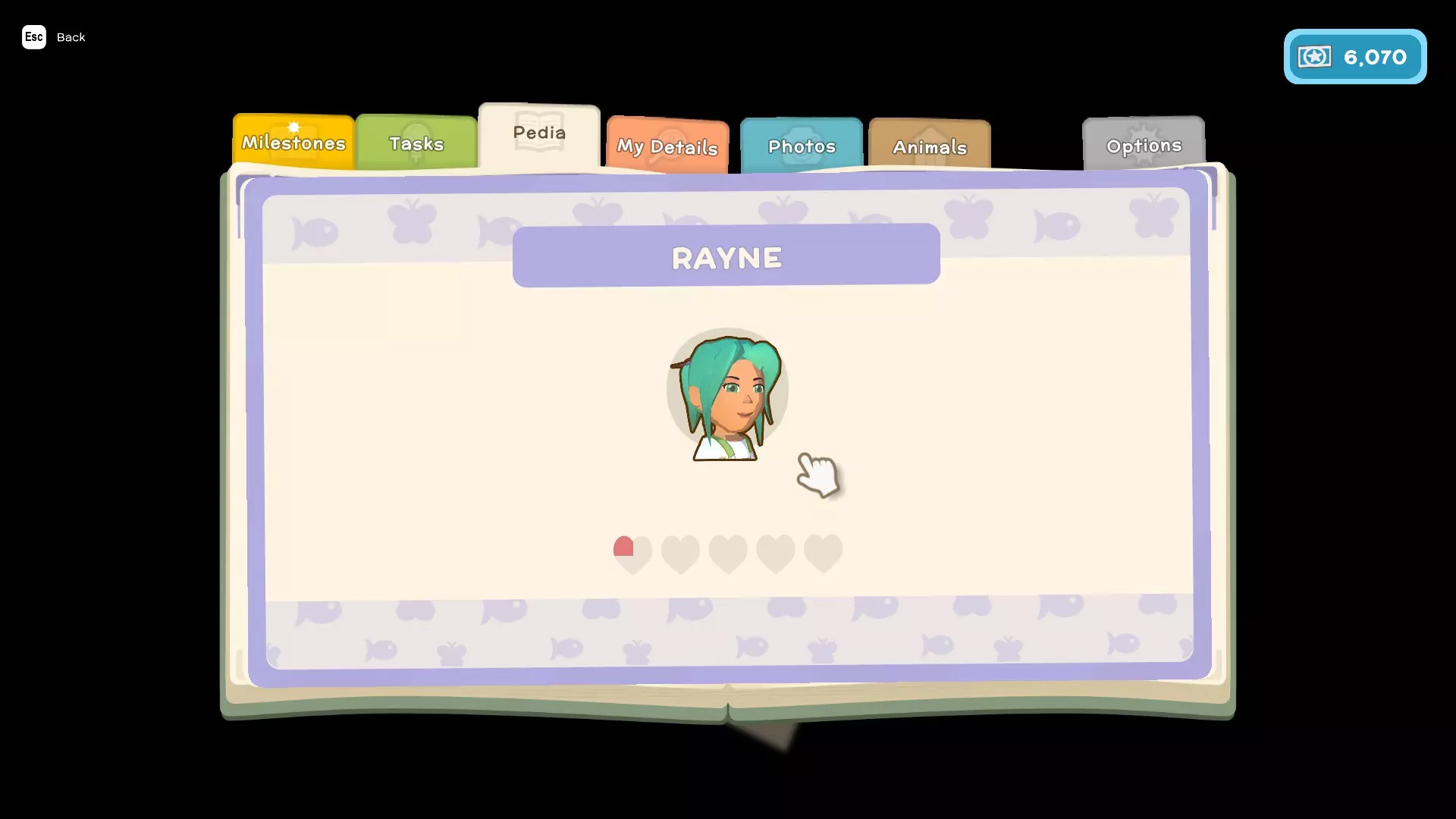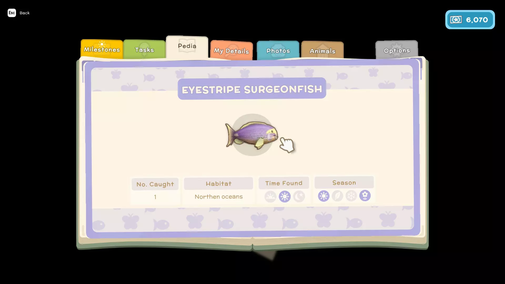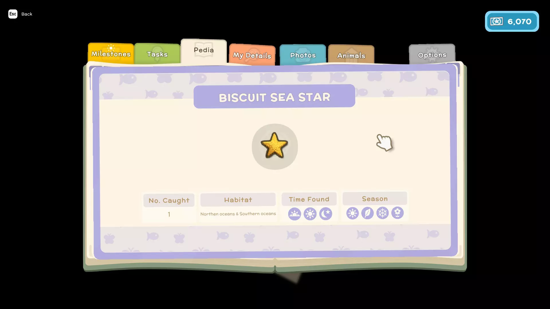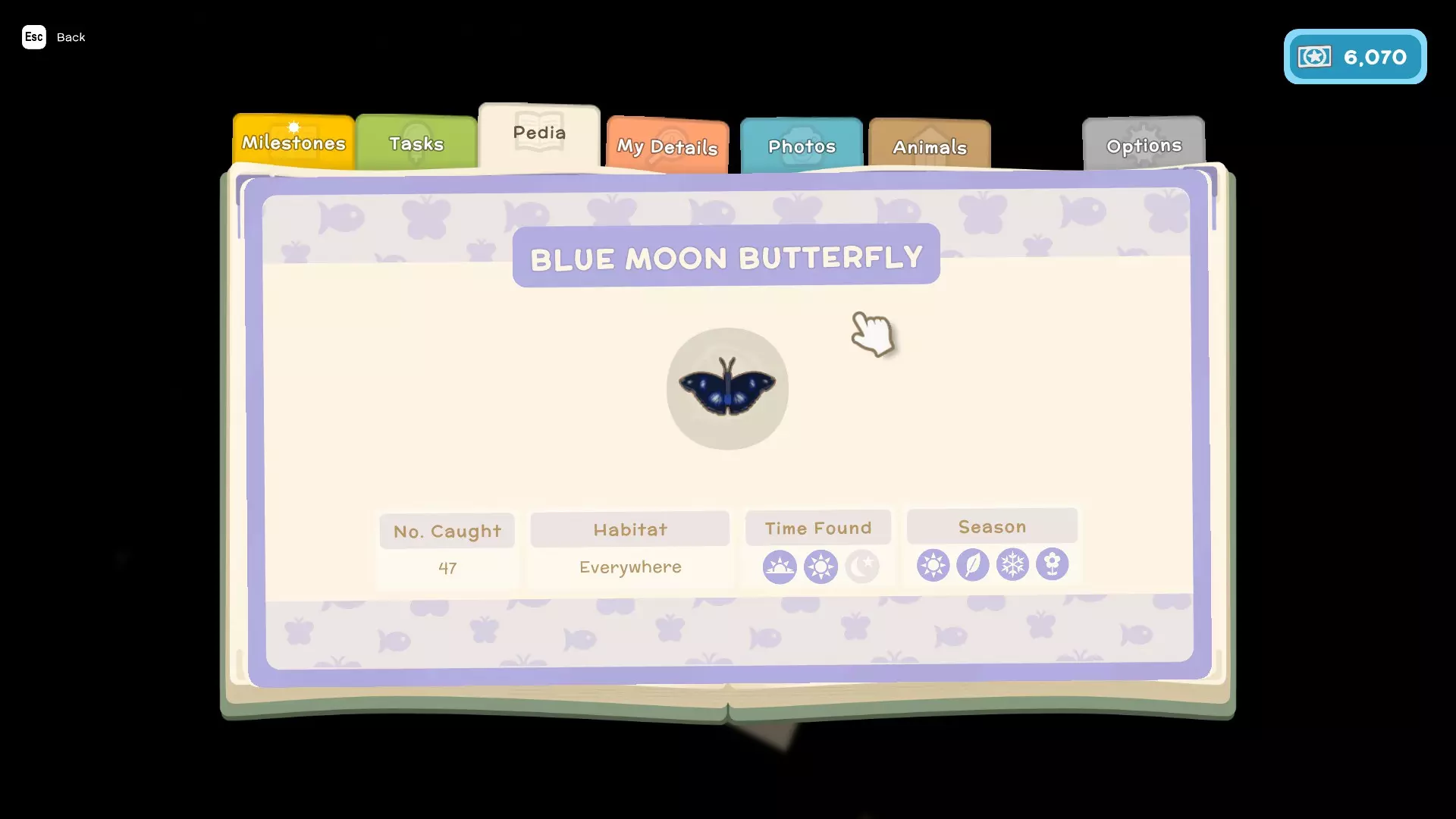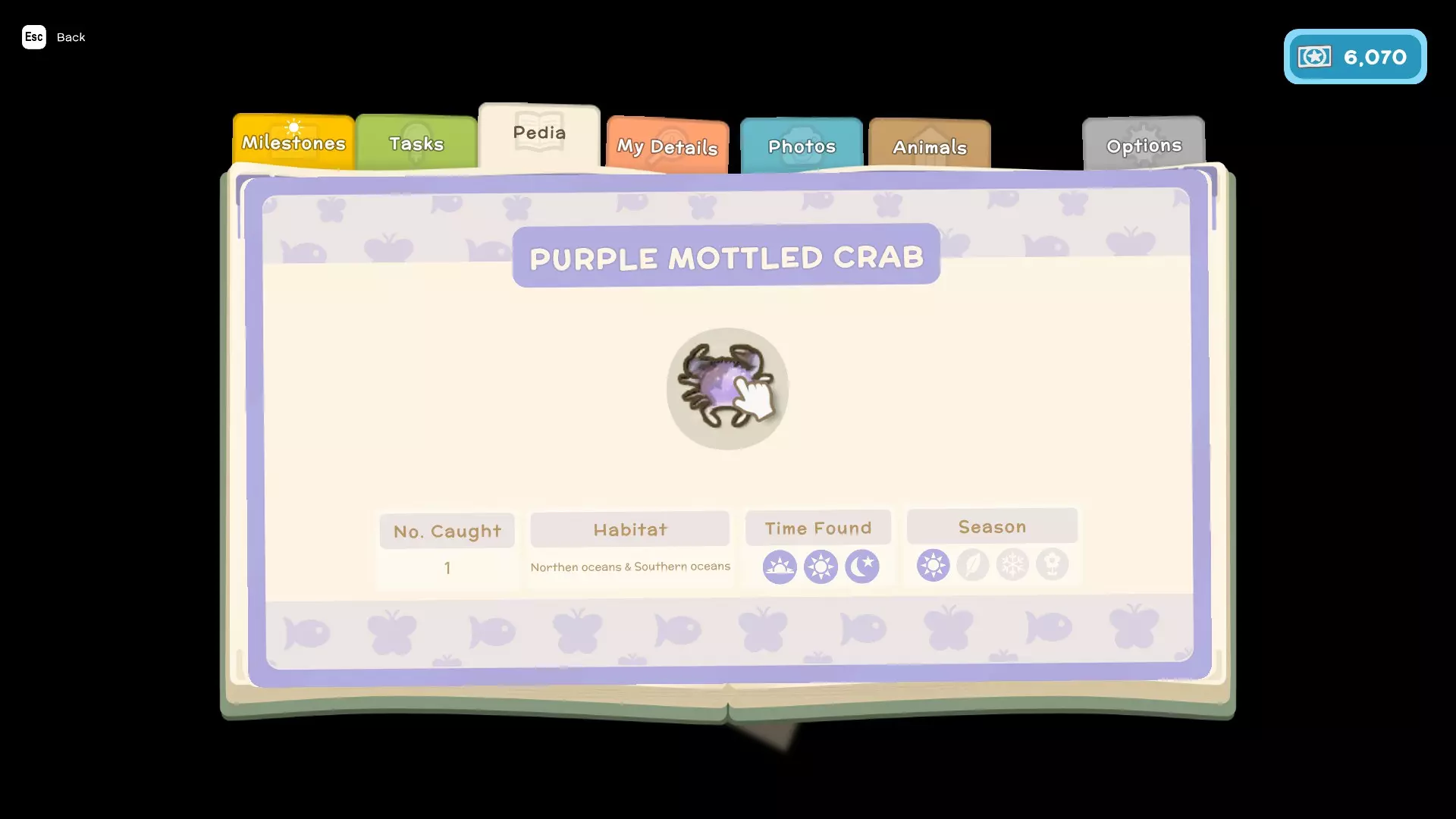 - 任务(这些是你为游戏剧情以及私人住所执行的类似任务的内容) - 图鉴(这里会显示你在游戏中遇到的所有鱼类、昆虫、小动物和人物,并包含它们的详细信息,例如:季节、发现时间、栖息地、捕获数量、关系) - 我的资料(在这里可以查看你的整体进度以及游戏中角色的详细信息) - 照片(这里可以存储你在游戏中拍摄的照片)