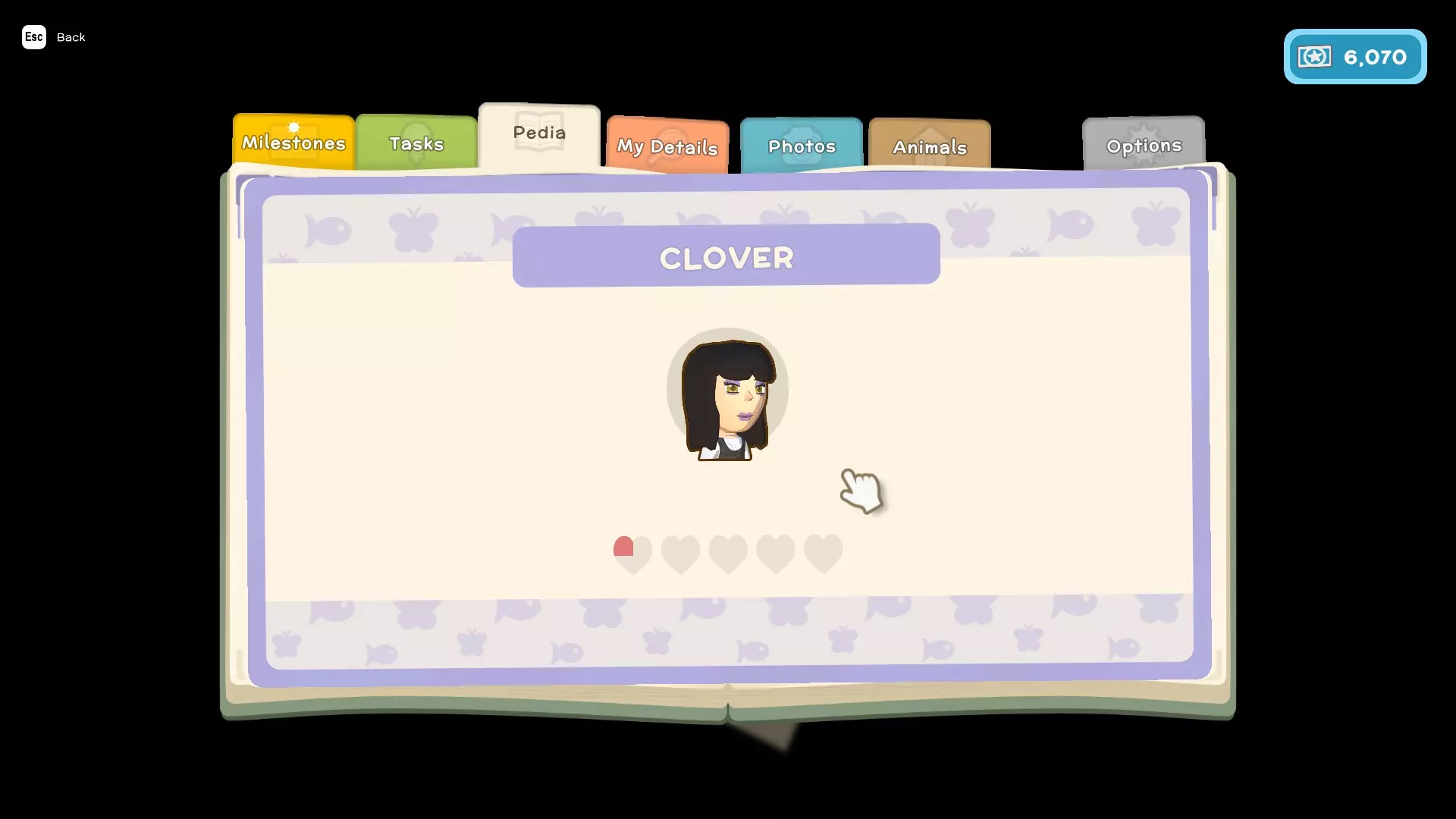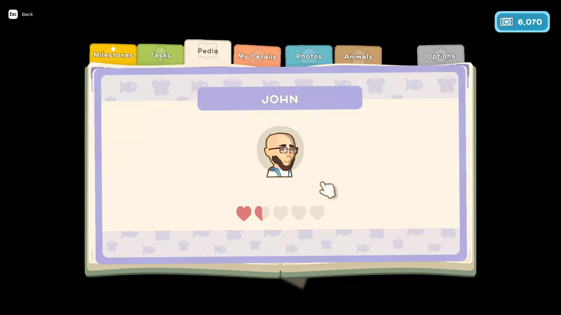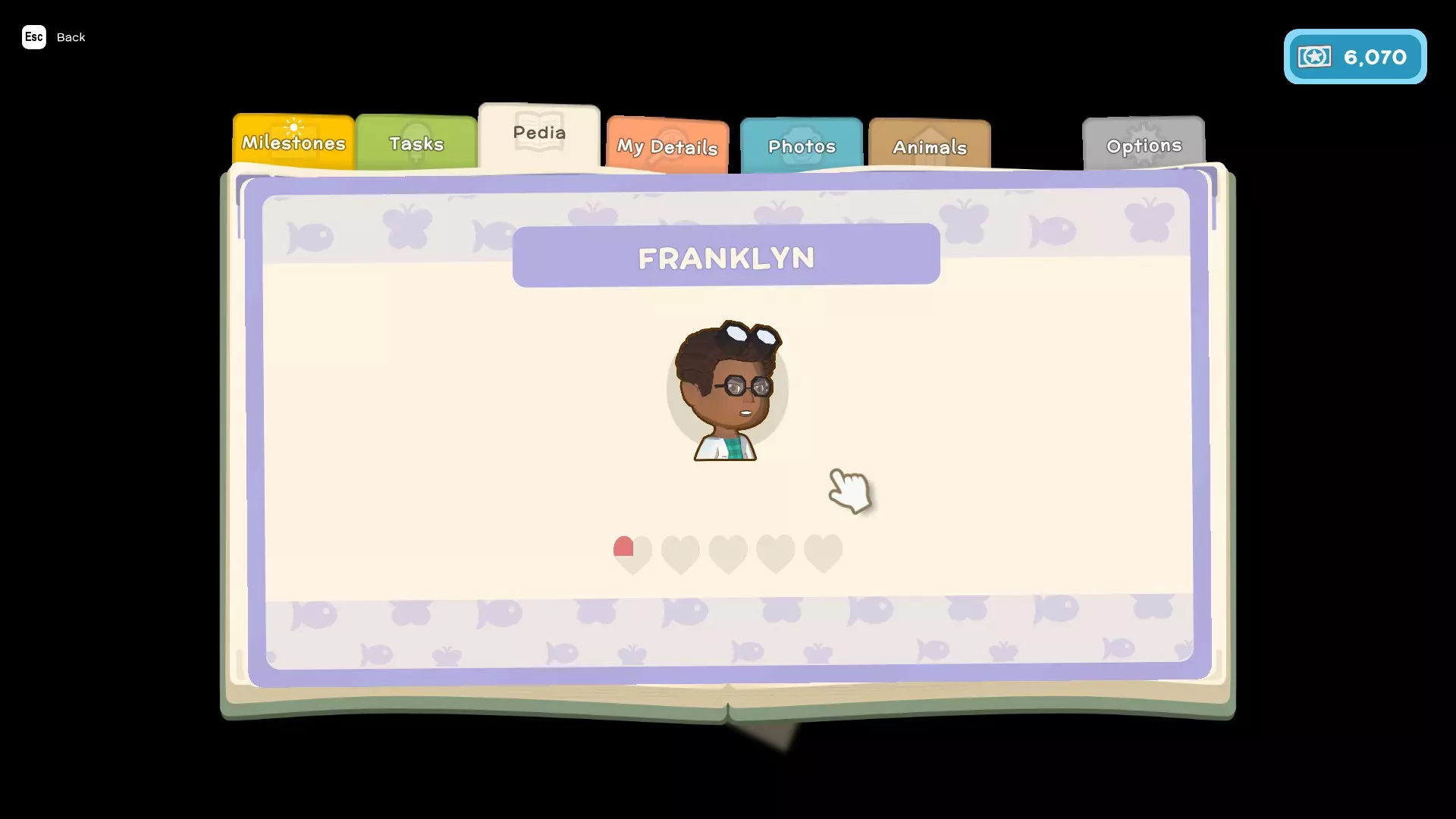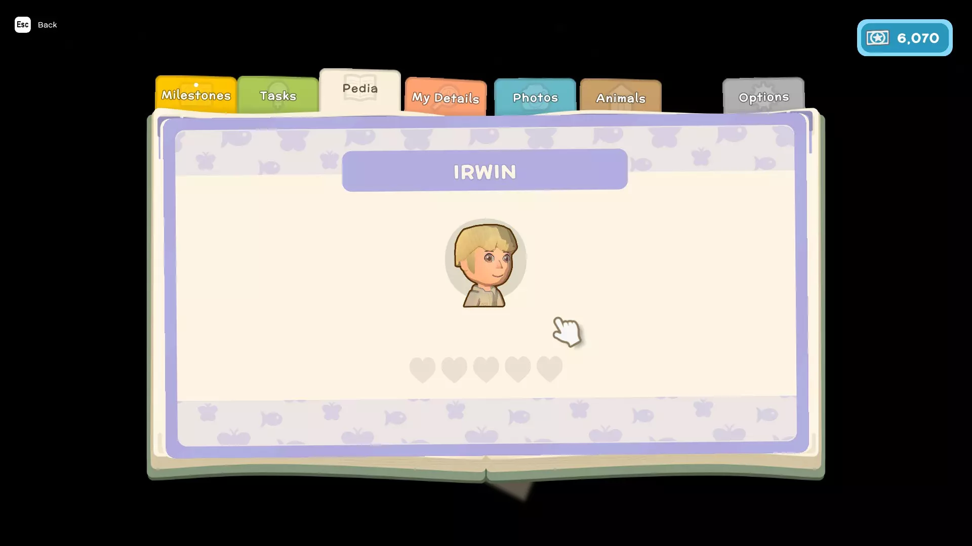 - 任务(这些是你为游戏剧情以及私人住所执行的类似任务的内容) - 图鉴(这里会显示你在游戏中遇到的所有鱼类、昆虫、小动物和人物,并包含它们的详细信息,例如:季节、发现时间、栖息地、捕获数量、关系) - 我的资料(在这里可以查看你的整体进度以及游戏中角色的详细信息) - 照片(这里可以存储你在游戏中拍摄的照片)